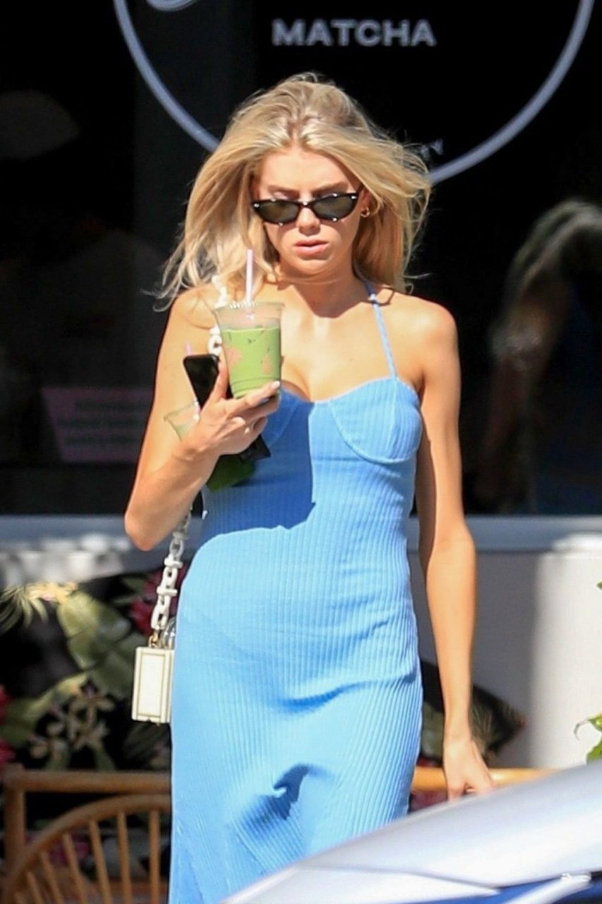 Charlotte McKinney detiene el tráfico mientras sale de Cha Cha Matcha en West Hollywood con ambas manos llenas de bebidas verdes saludables, 26/07/2019.