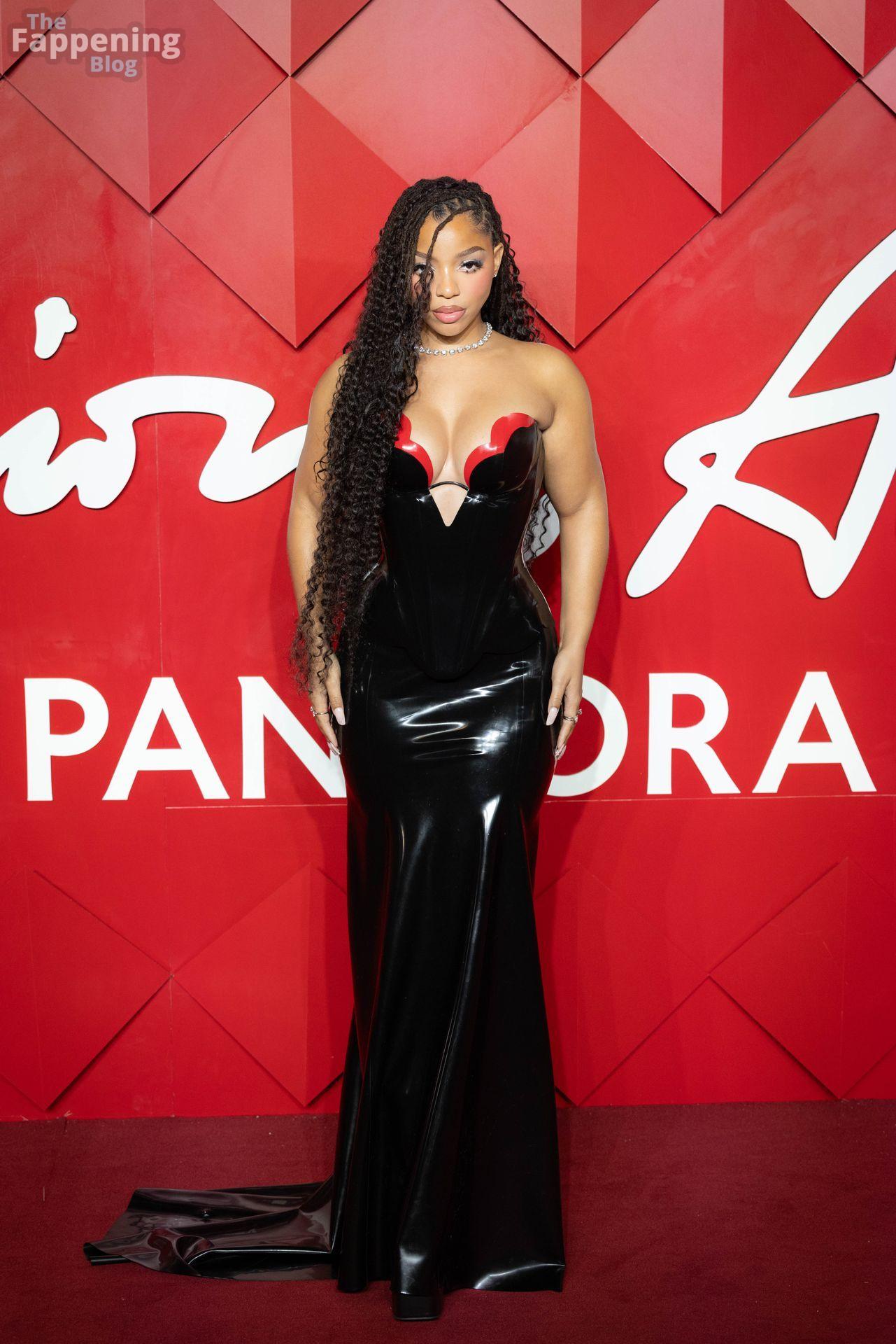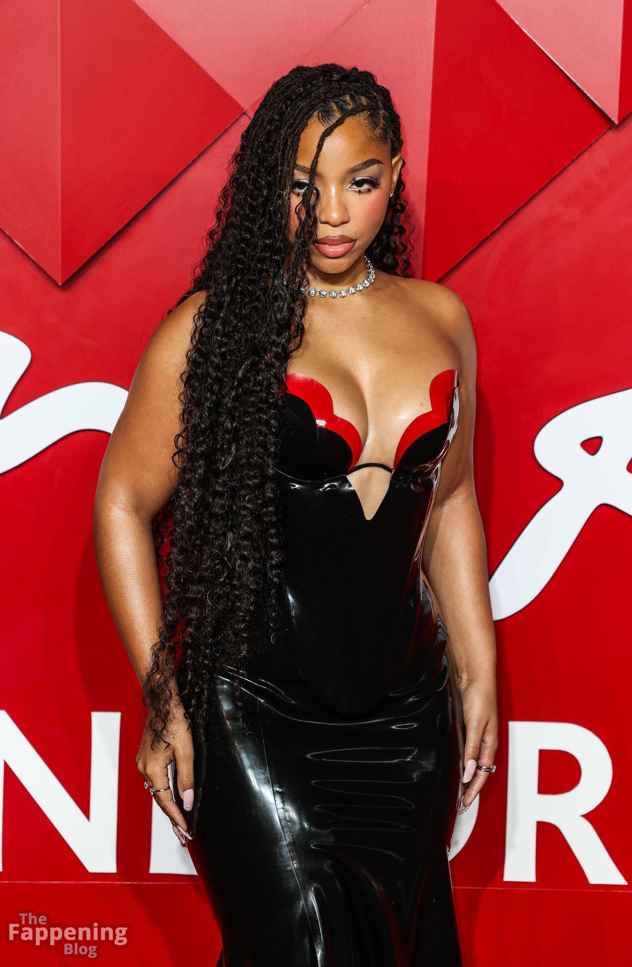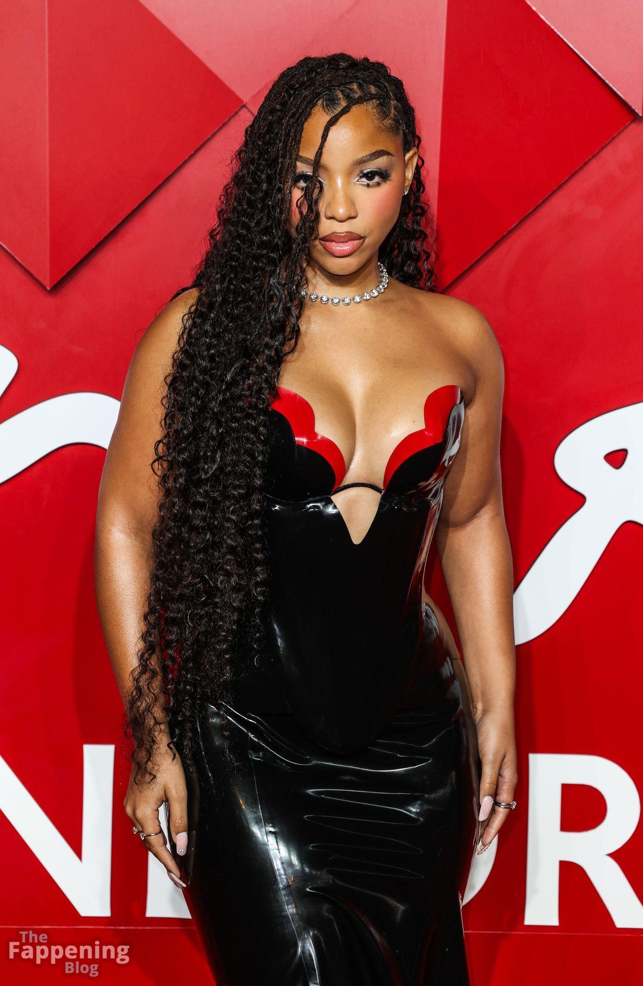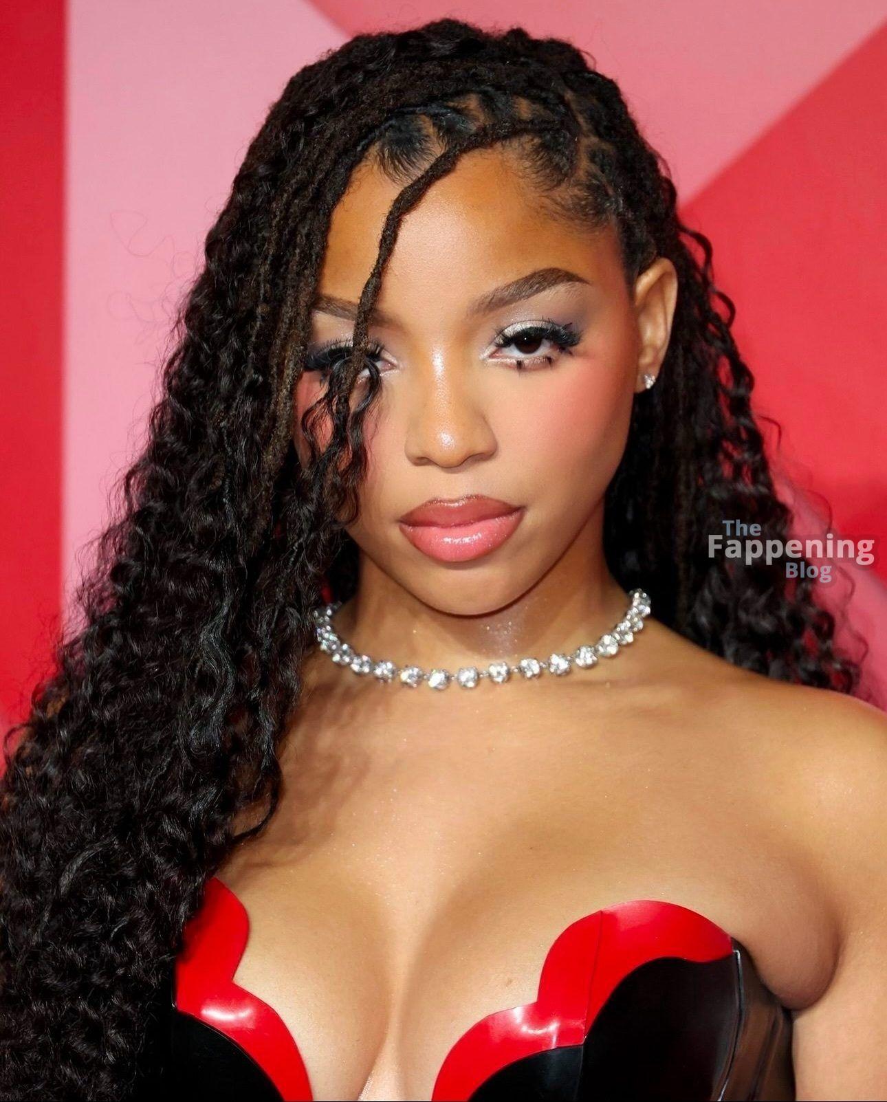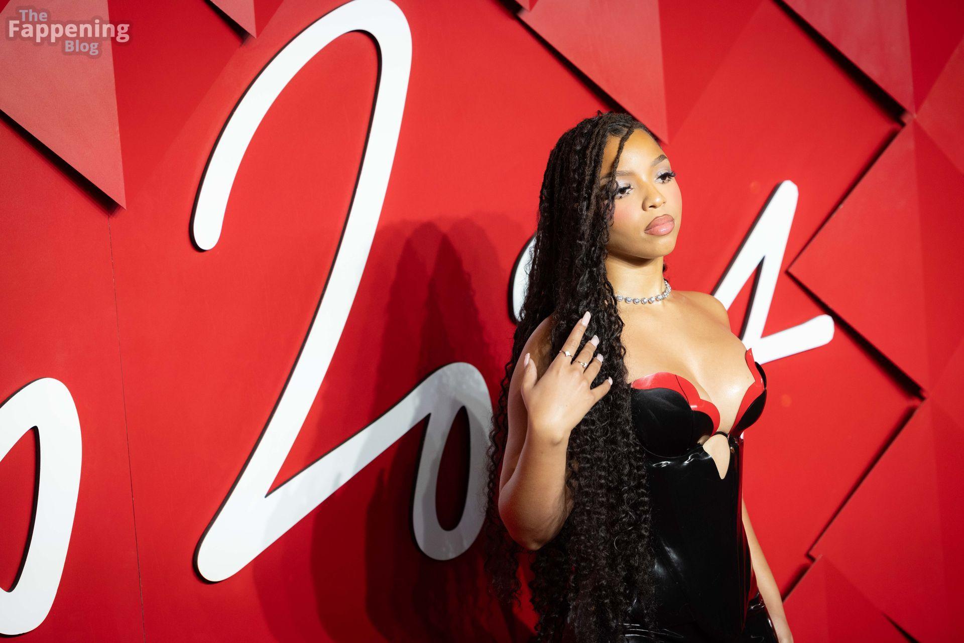 Chloe Bailey aparece en un atrevido vestido de cuero negro y rojo que resalta todas sus curvas y su escote.
