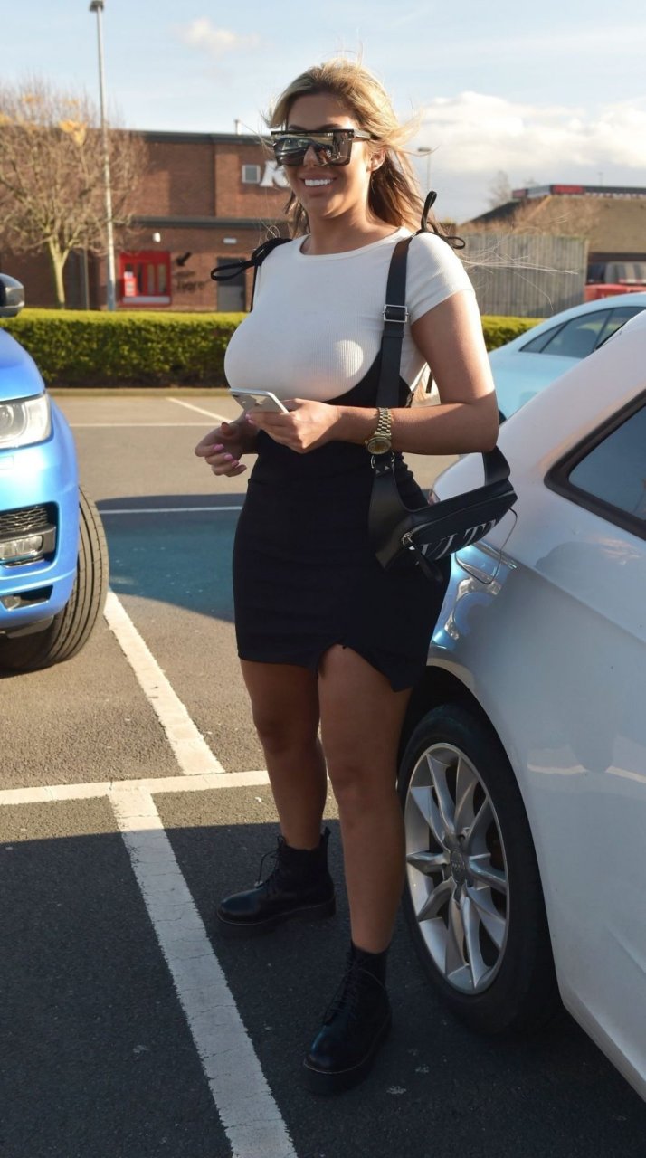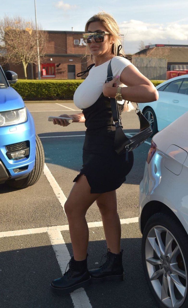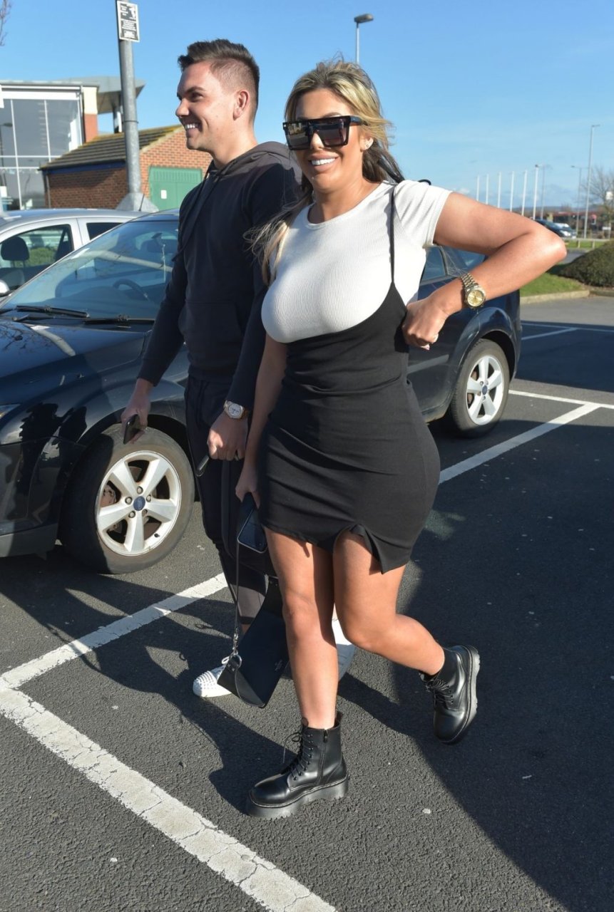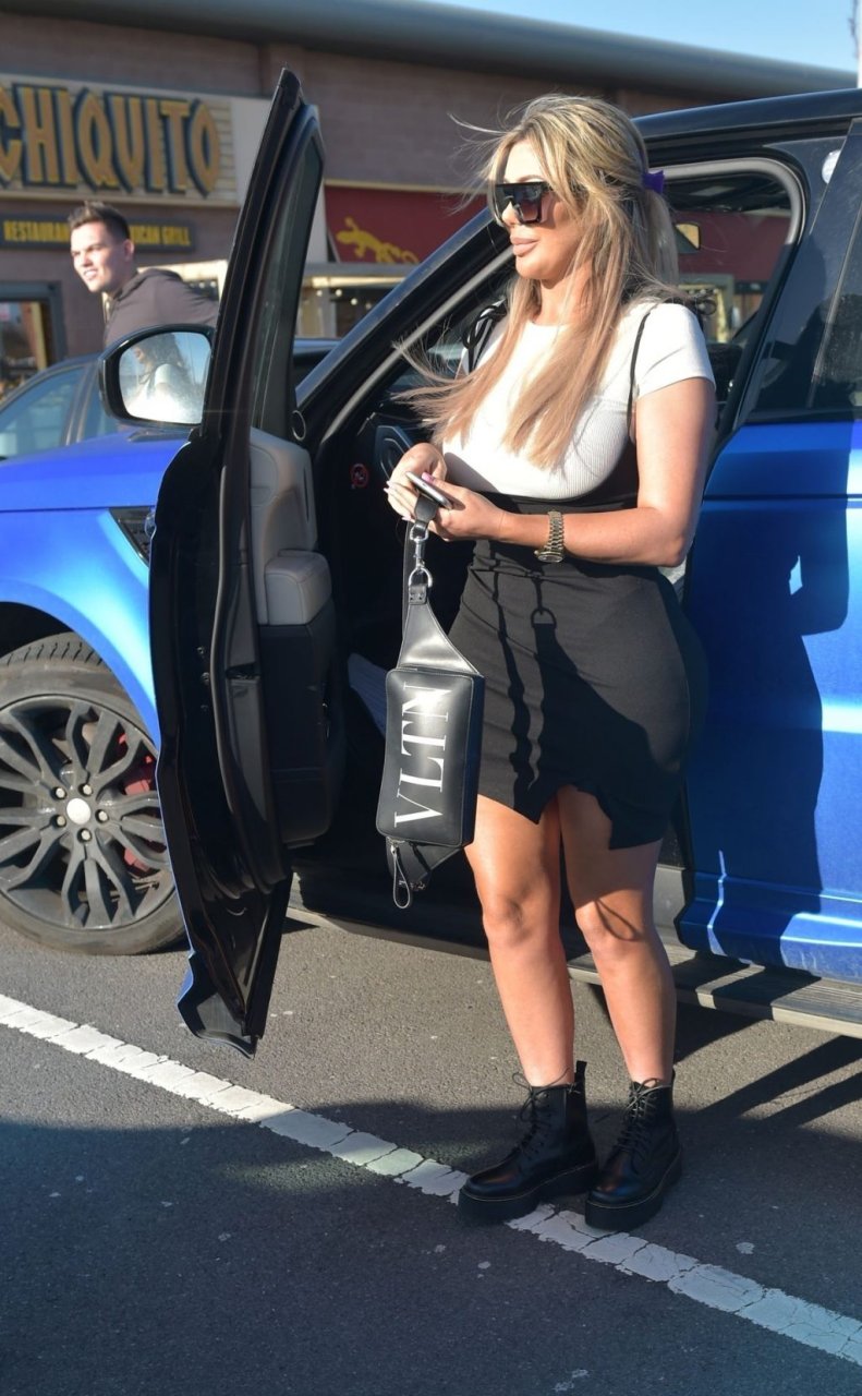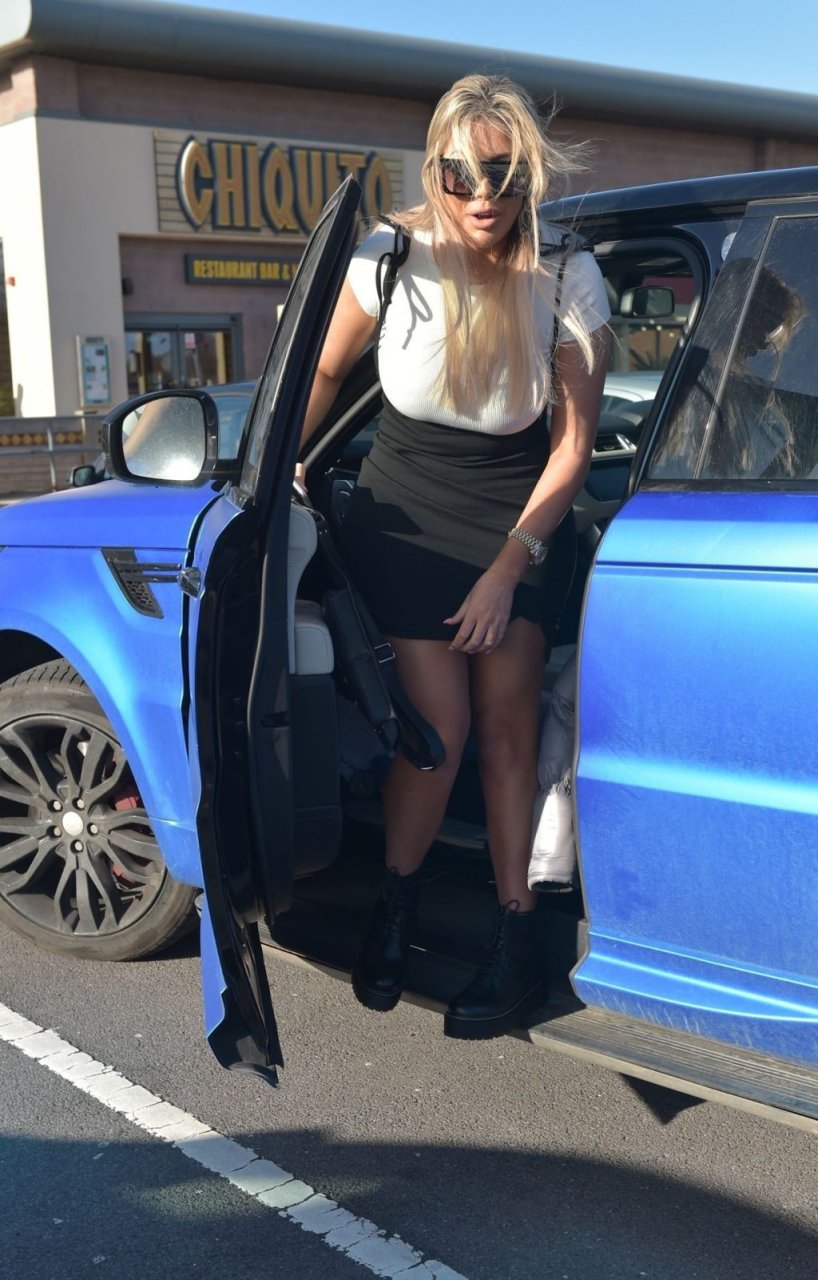Chloe Ferry fue sin sujetador para un viaje a Chiquitos con su novio Sam Gowland y su hermano, 15/03/2019. Chloe y Sam disfrutaron de una sesión de compras en Teesside Shopping Park antes de detenerse a comer en Chiquitos en Stockton. La pareja salió en el nuevo Range Rover Sport Blue Wrapped de Sam que costó 70k.