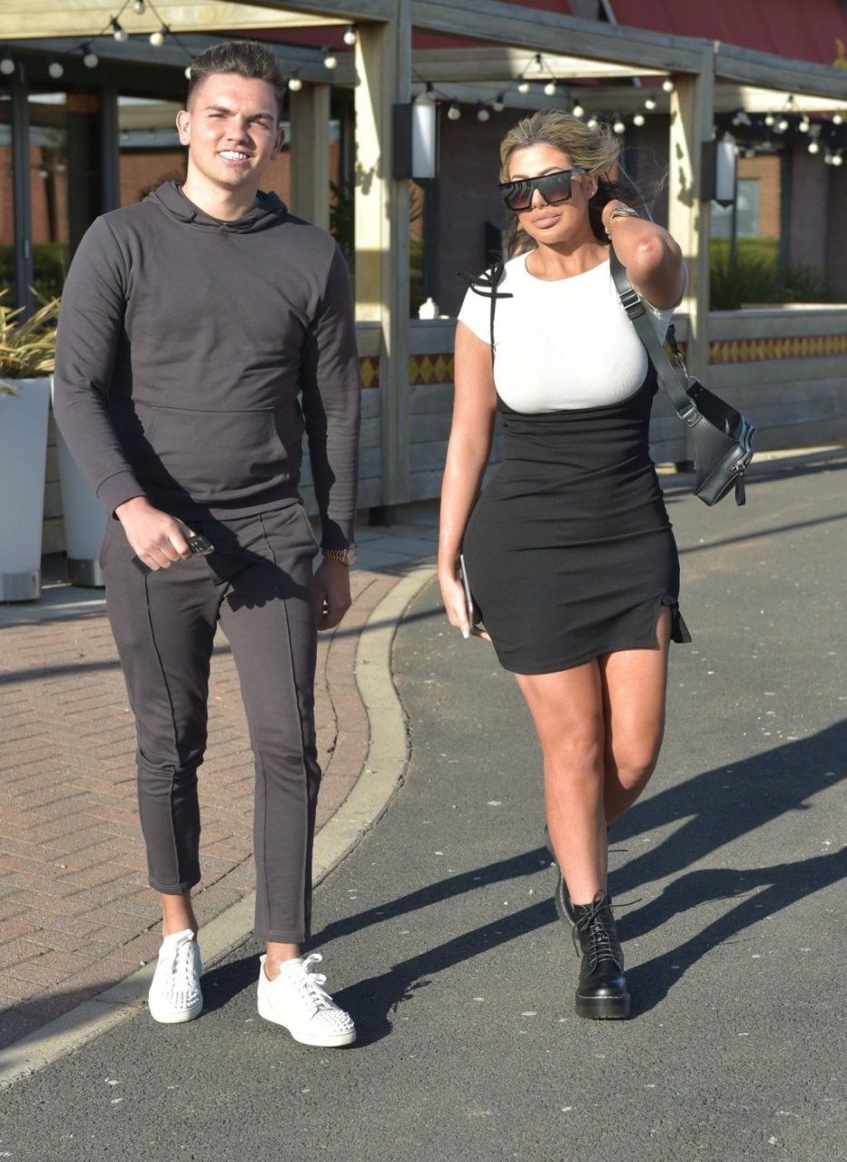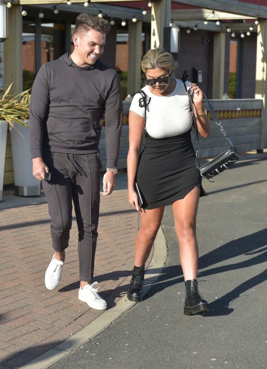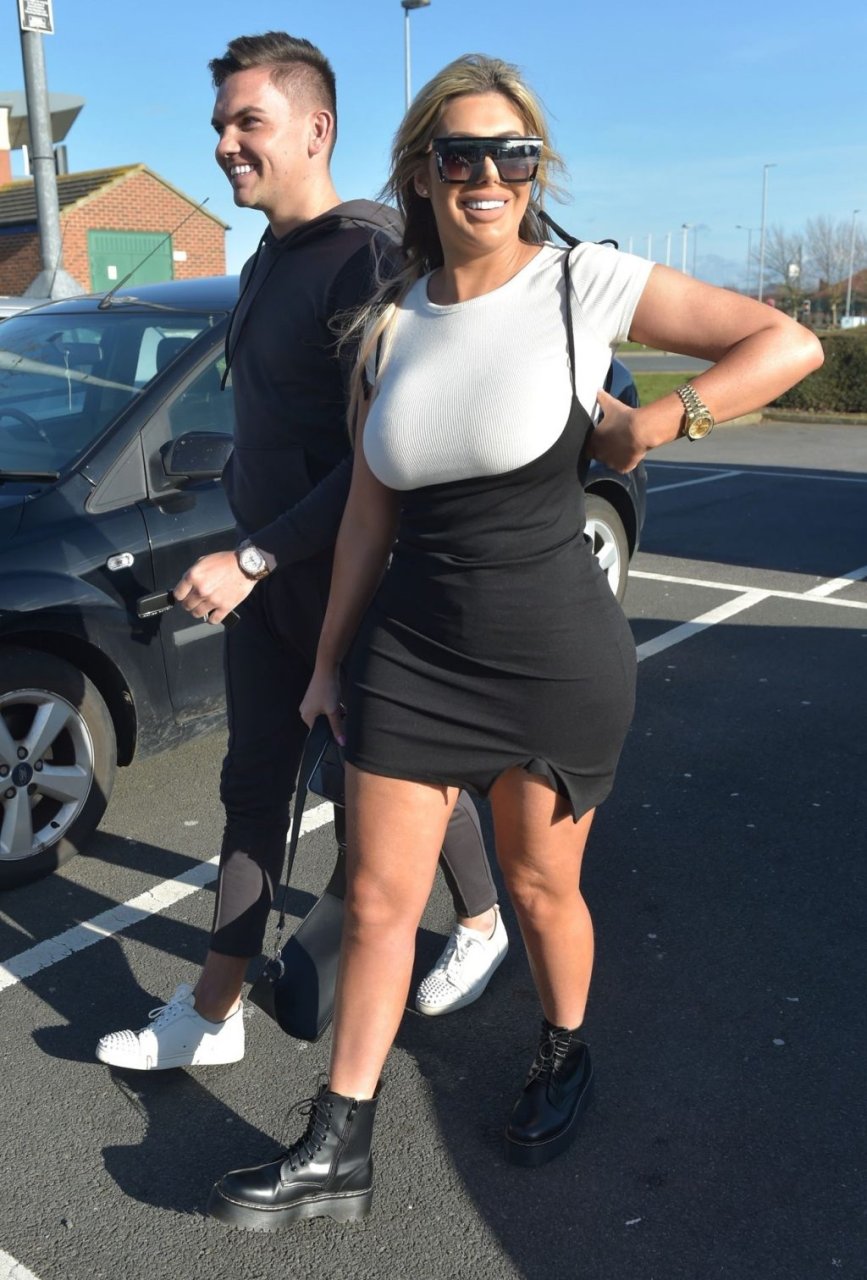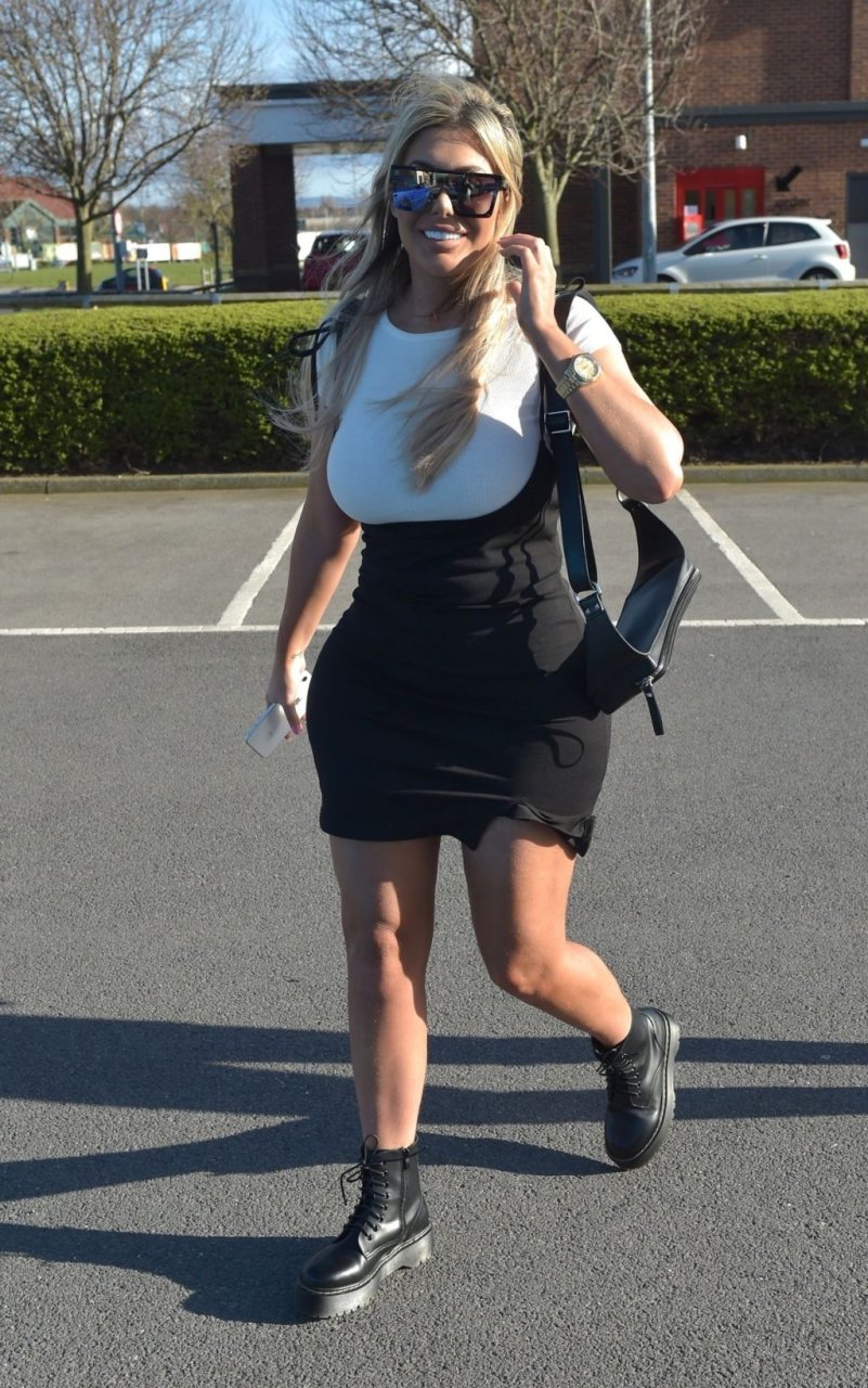 Chloe Ferry fue sin sujetador para un viaje a Chiquitos con su novio Sam Gowland y su hermano, 15/03/2019. Chloe y Sam disfrutaron de una sesión de compras en Teesside Shopping Park antes de detenerse a comer en Chiquitos en Stockton. La pareja salió en el nuevo Range Rover Sport Blue Wrapped de Sam que costó 70k.