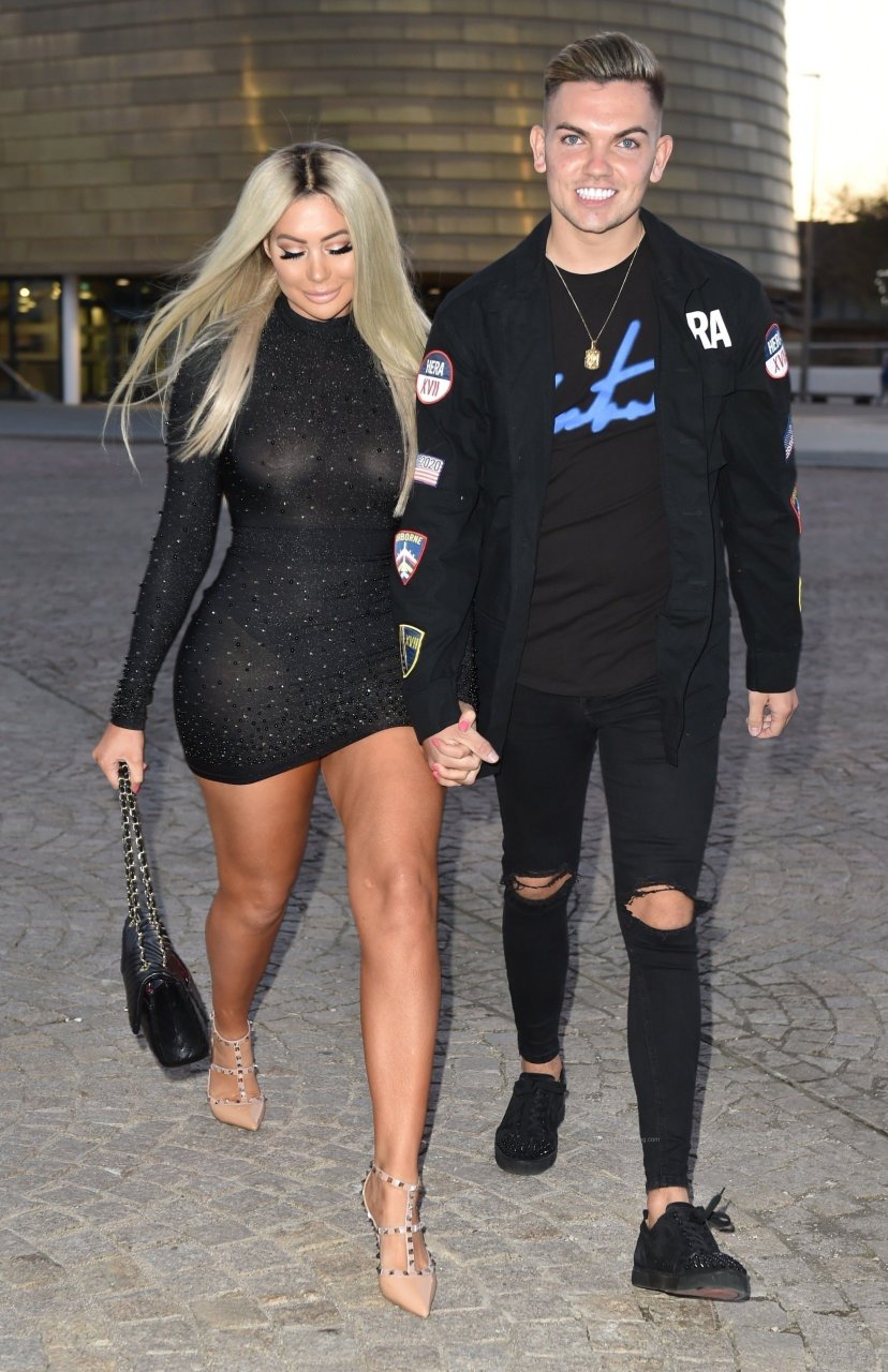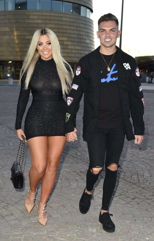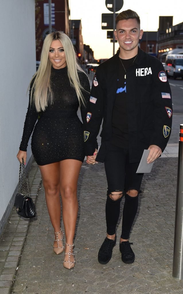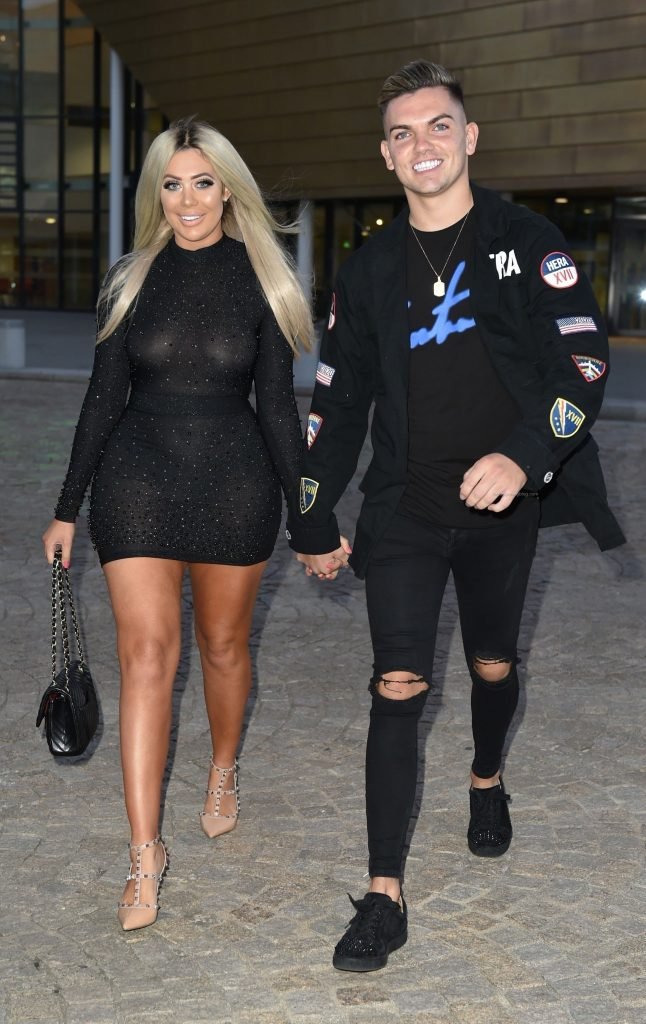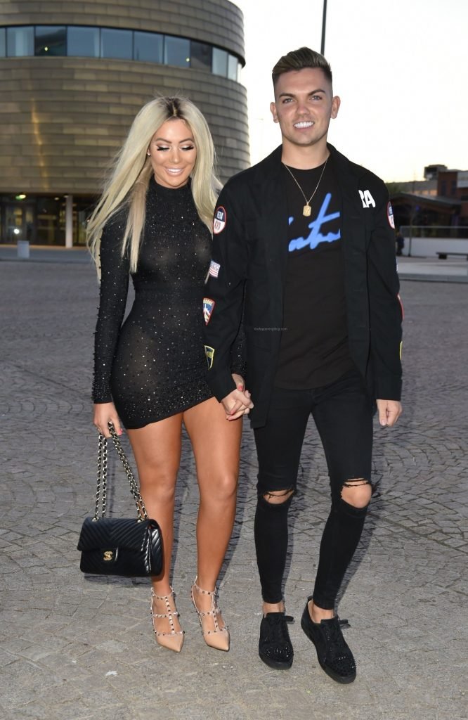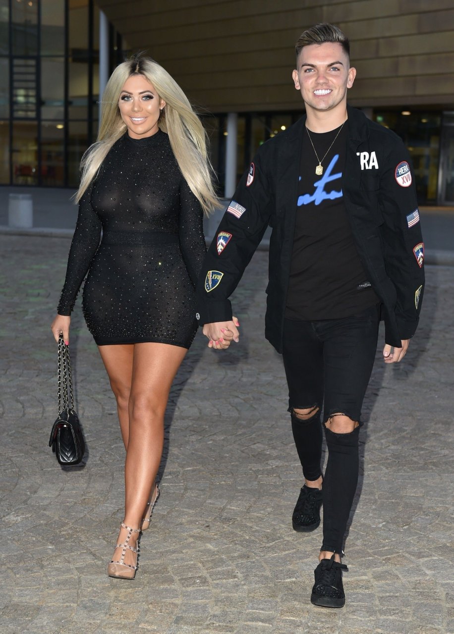 Chloe Ferry, estrella de televisión sin sujetador, de 22 años, lleva un vestido negro muy atrevido y transparente mientras sale de noche en Middlesbrough con su novio Sam Gowland, 21/04/2018. La pareja asistió a la fiesta de compromiso de sus amigos en la Universidad de Estudiantes de Teesside antes de ir a Yarm en Teesside.