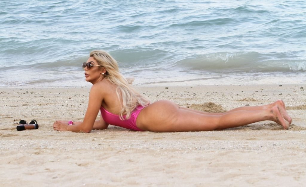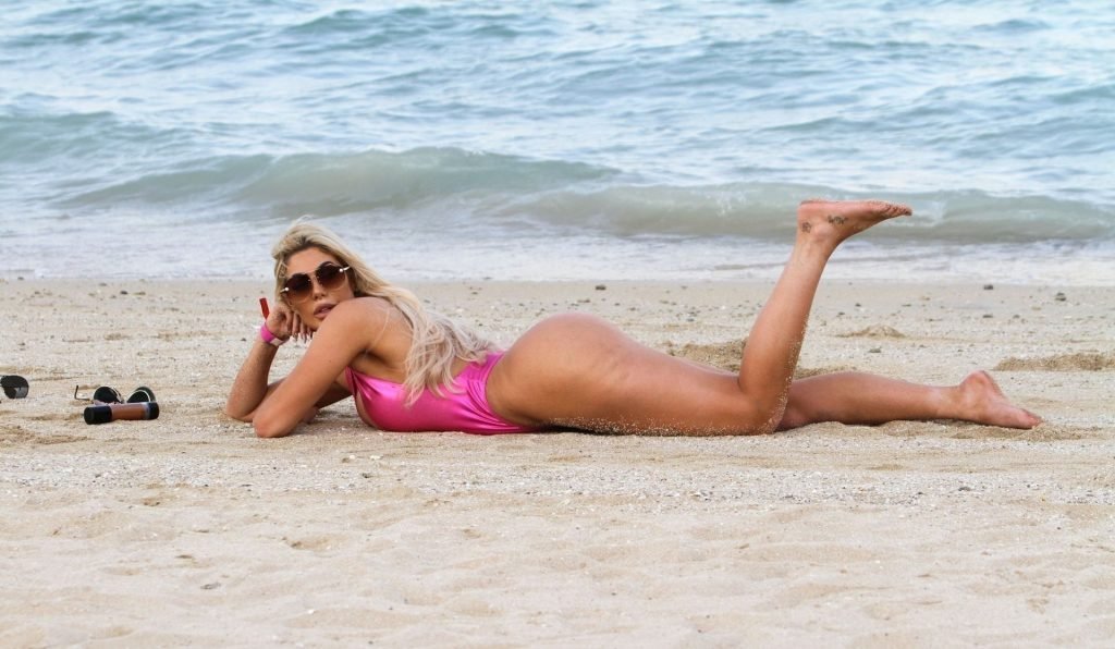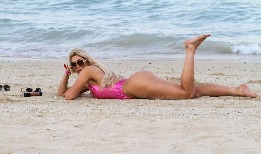 Chloe se puso su hermoso traje de baño rosa y se veía increíble, mostrando todas sus curvas sensuales y demostrando algunas habilidades con la pelota durante una sesión de fotos caliente.