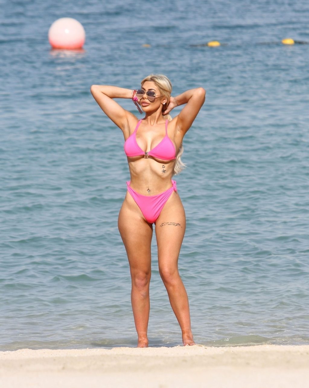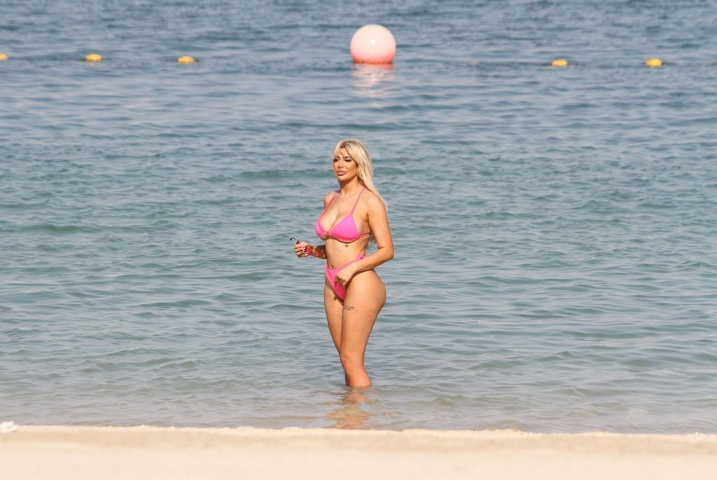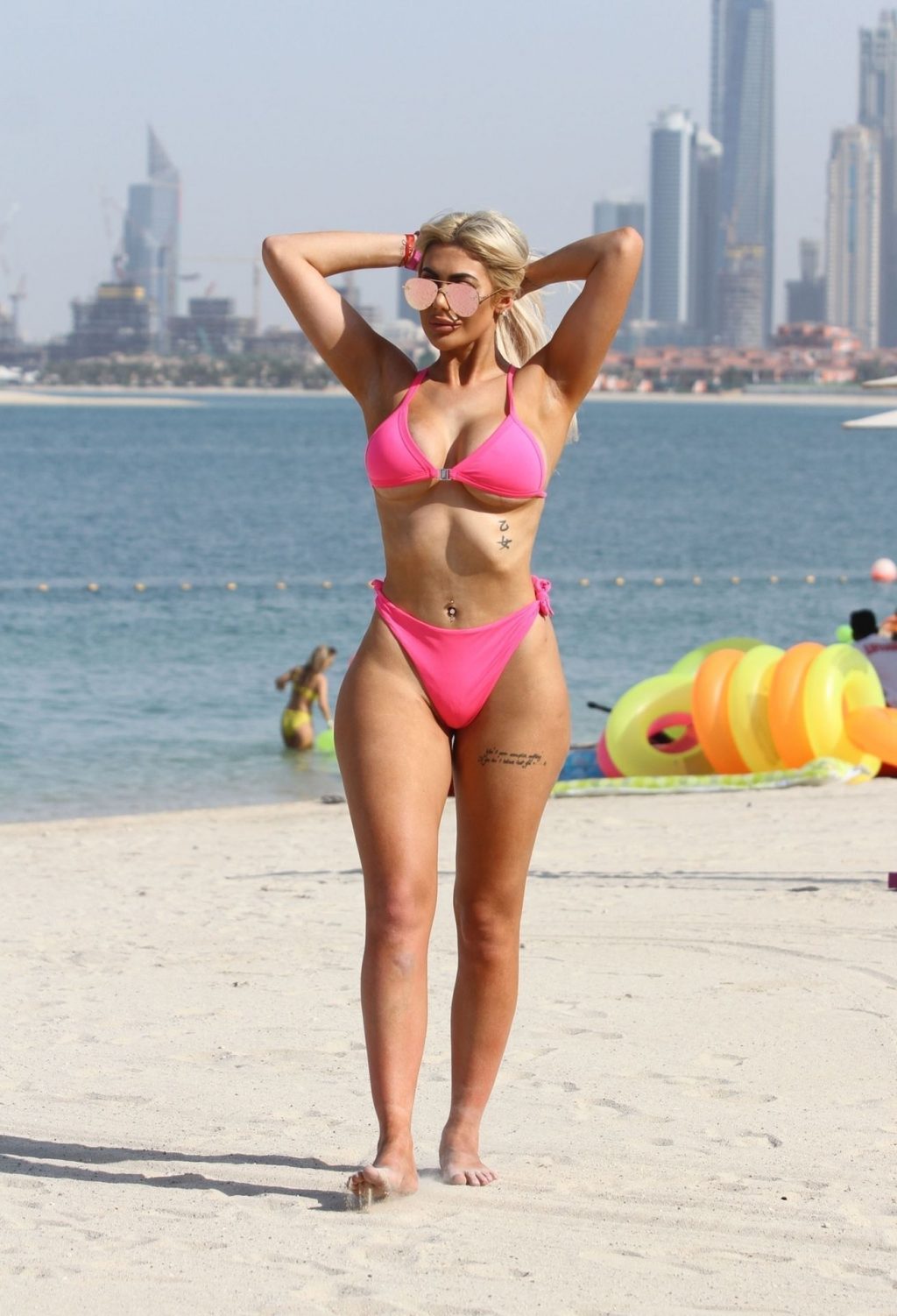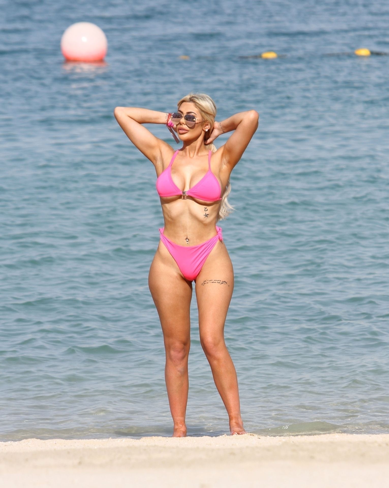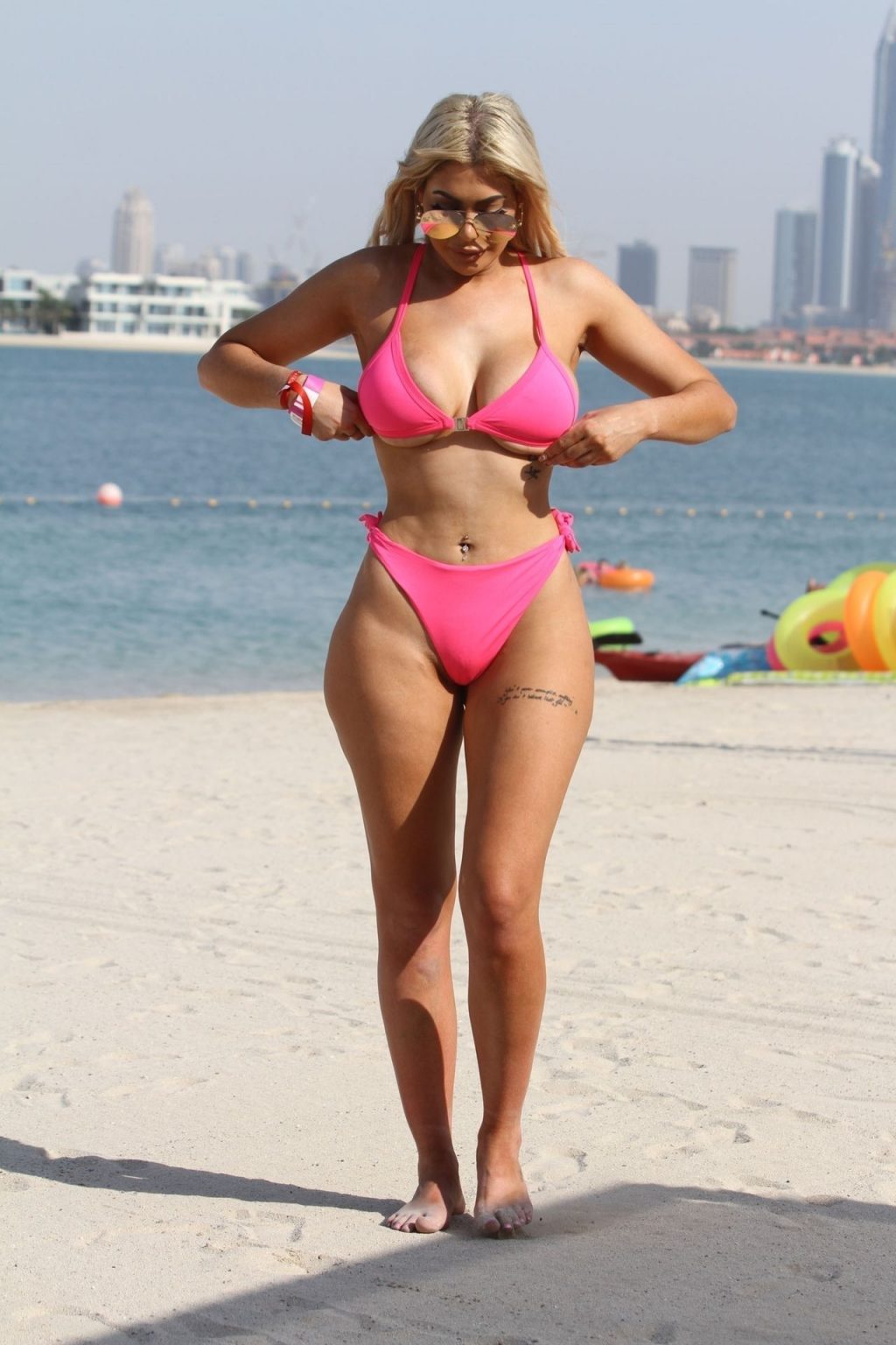 Seduciendo en la playa y mostrando un espectáculo ardiente bajo el sol de los Emiratos, la belleza de Geordie Shore Chloe Ferry luce fabulosa con su diminuto bikini rosa, 17/10/2019.