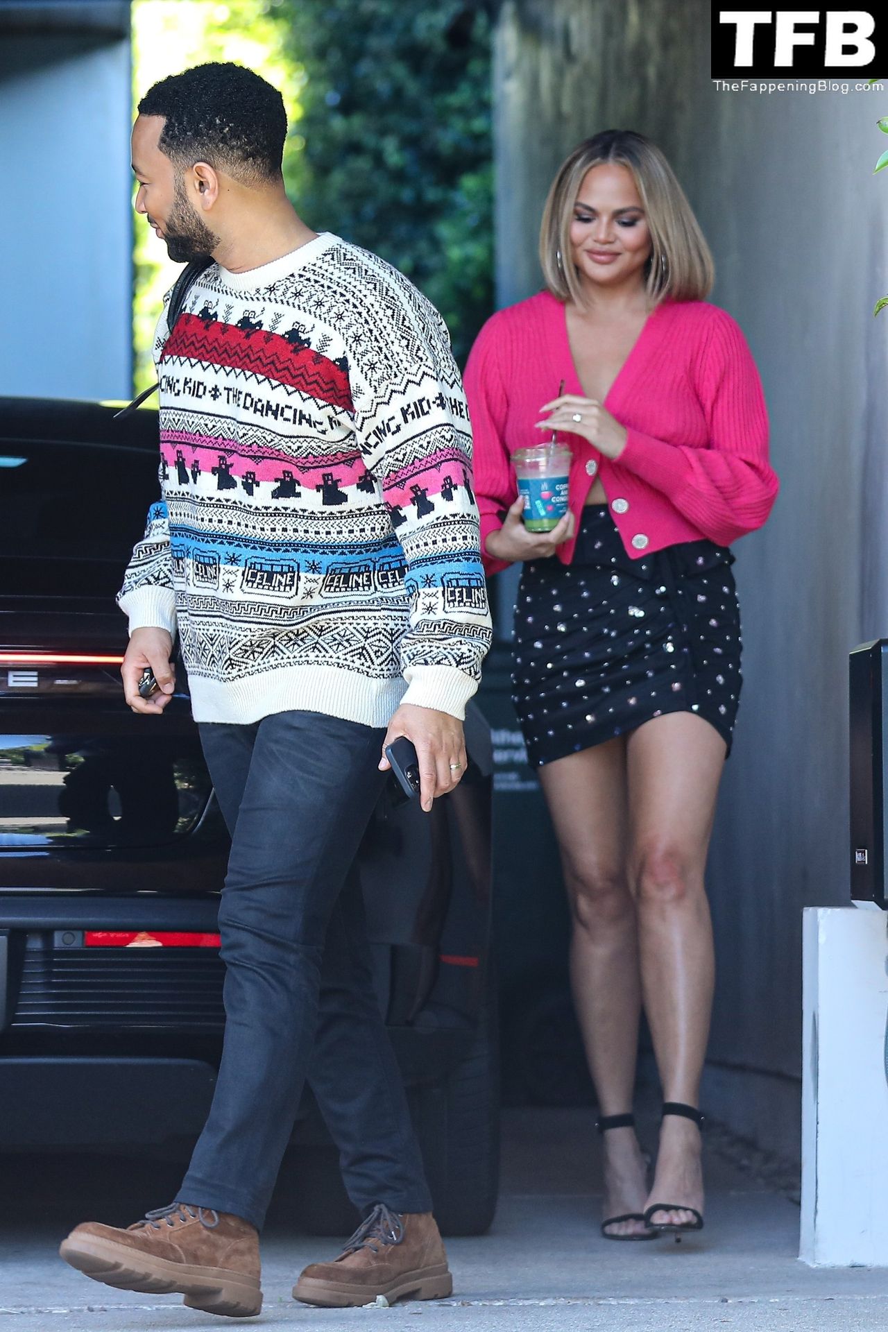 Model Chrissy Teigen luce impecable con un suéter rosa abotonado, falda corta y tacones altos, mientras se la ve llegando a su oficina con su esposo John Legend – West Hollywood, 12/01/2021.
