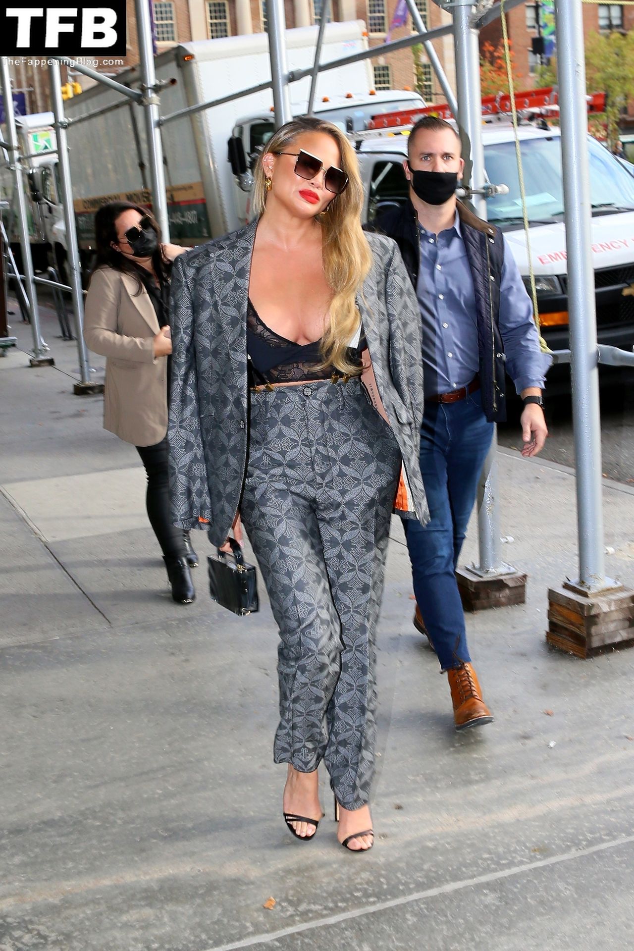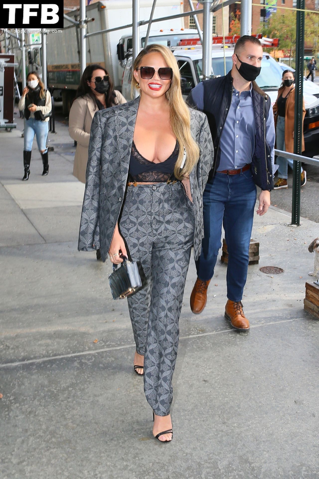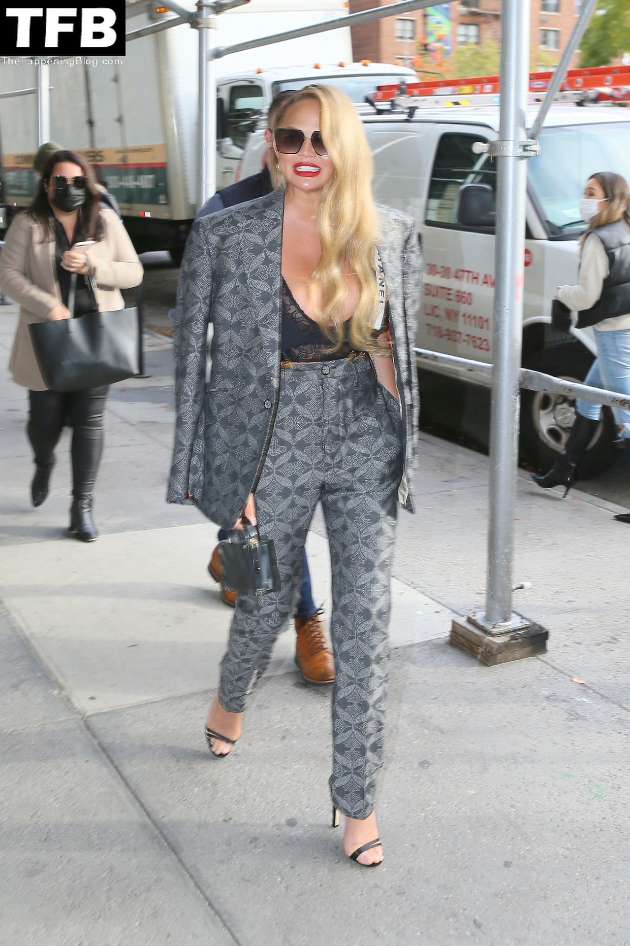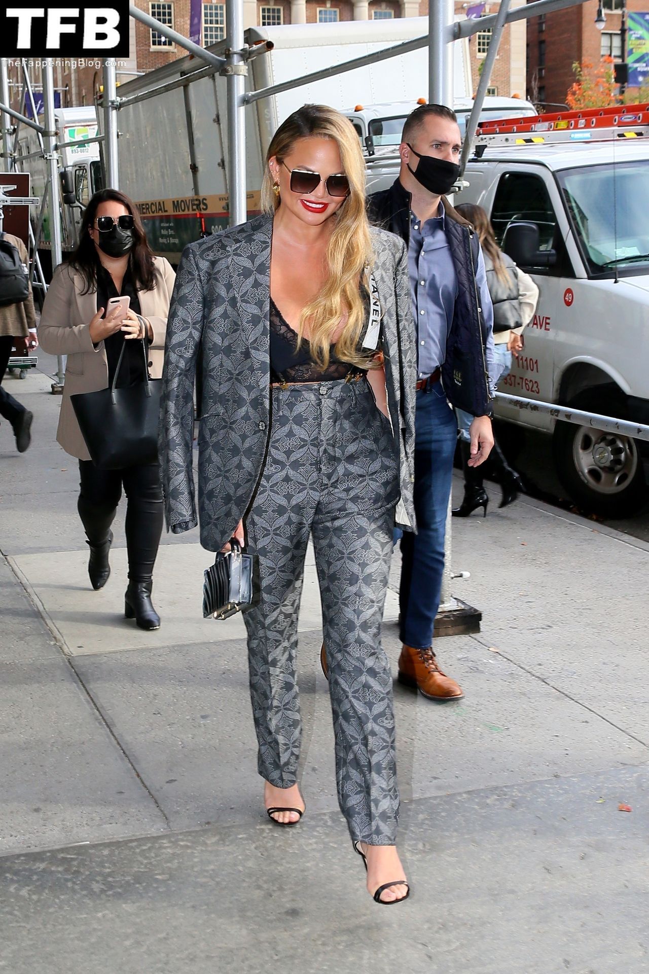 Modelo Chrissy Teigen se dirige a Barnes & Nobles en NYC vistiendo un atrevido escote pronunciado combinado con un traje de pantalón gris, 27/10/2021.