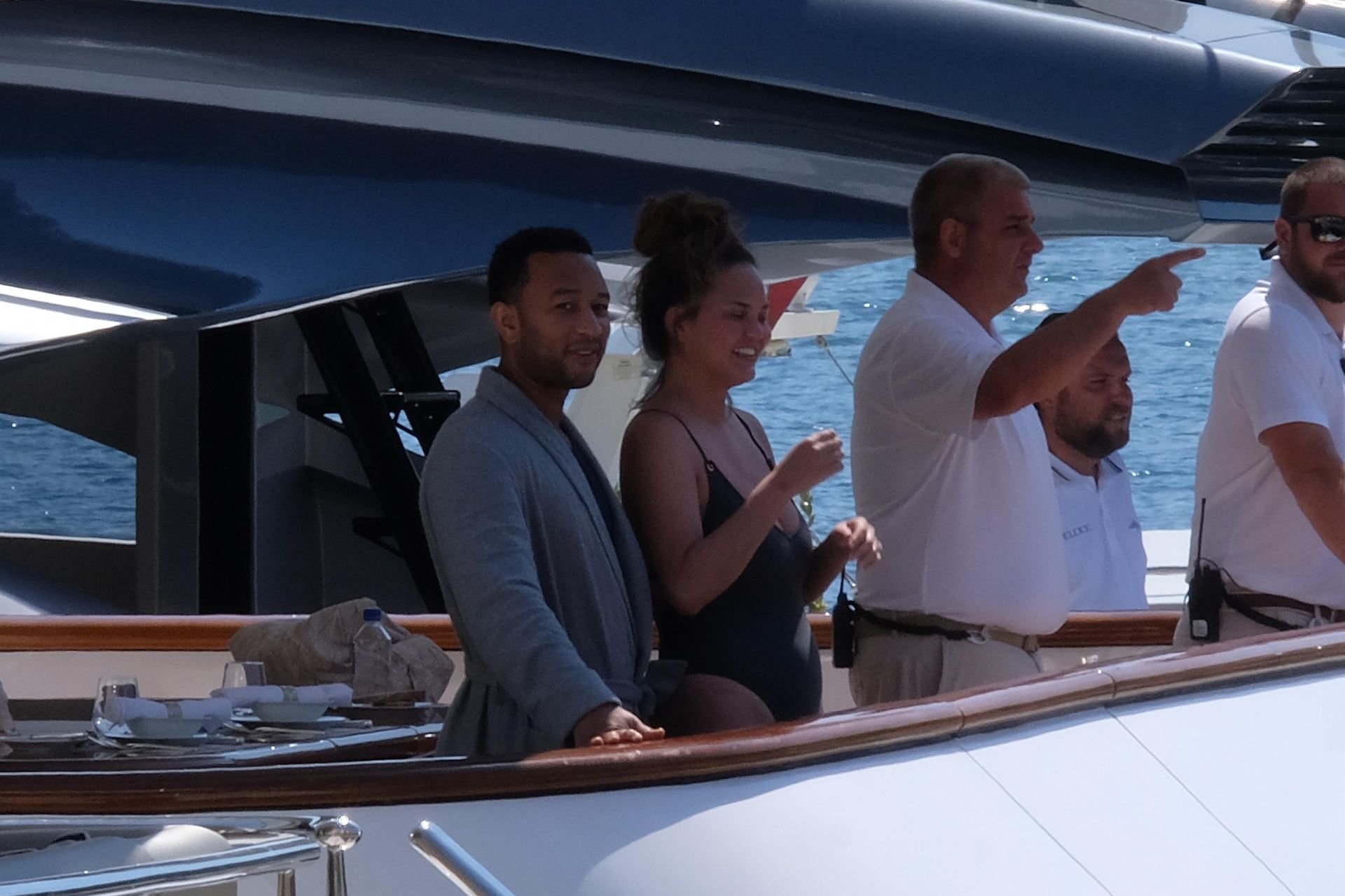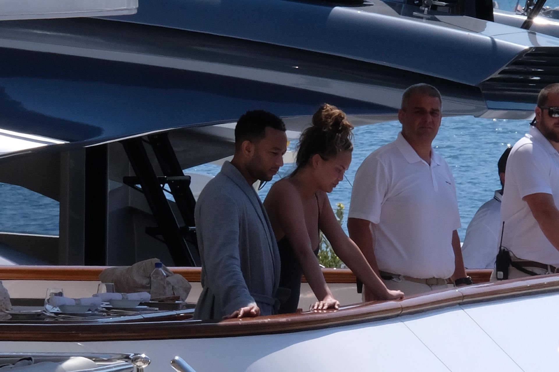 El cantante de soul americano John Legend y su esposa Chrissy Teigen descansan en su yate durante sus vacaciones bañadas por el sol en Portovenere, Italia, 04/07/2019.