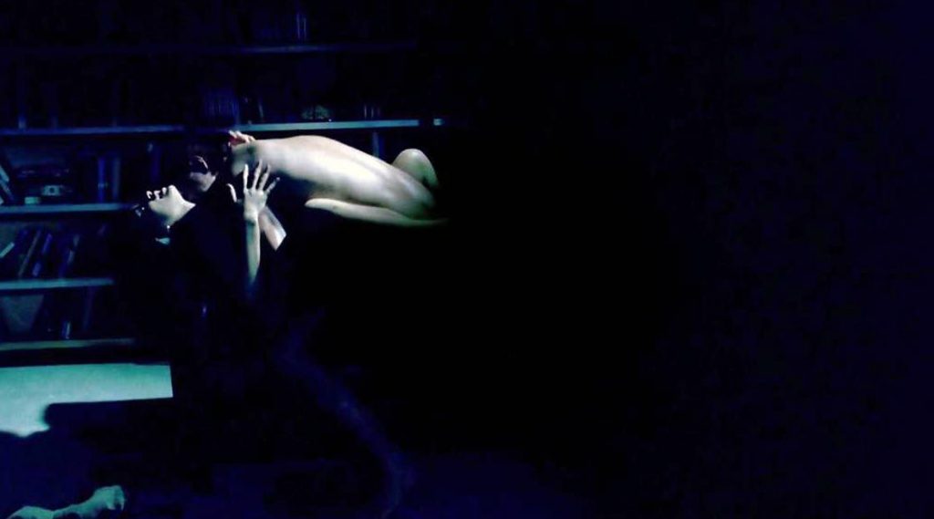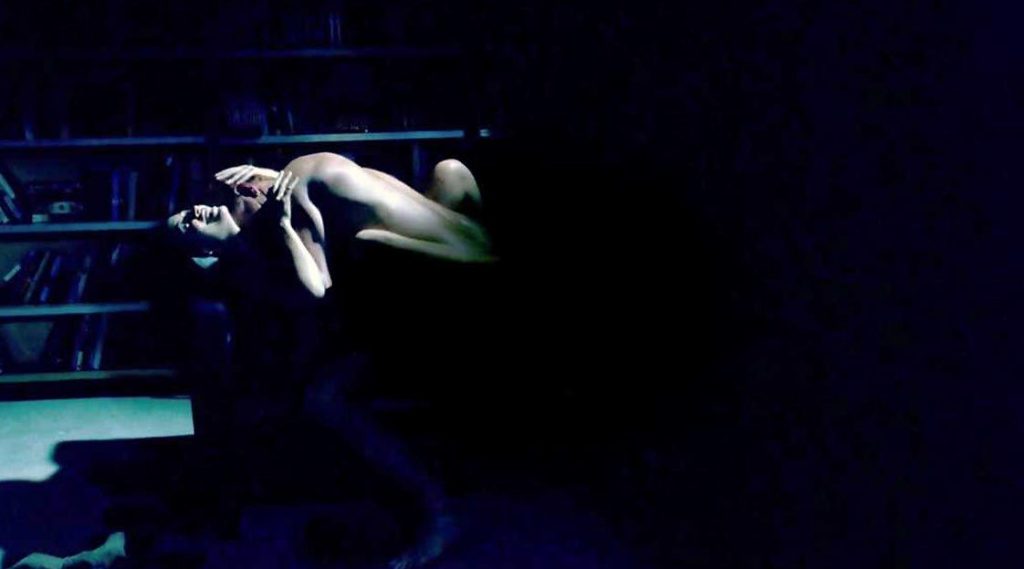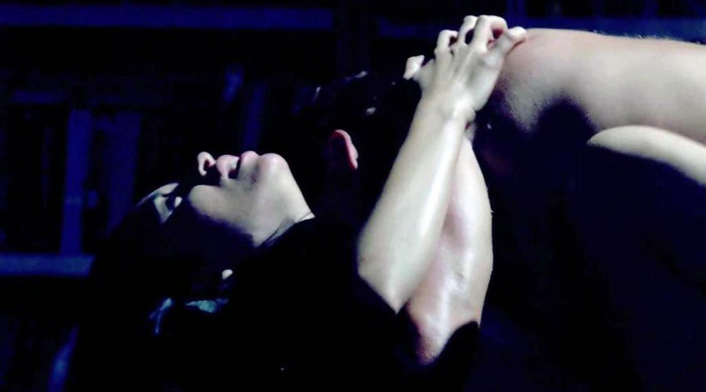 Christian Serratos está acostada de espaldas en un sofá, teniendo sexo con un hombre encima de ella, cuando ve a otro hombre acechándolos y el hombre con quien está le dice que lo olvide.