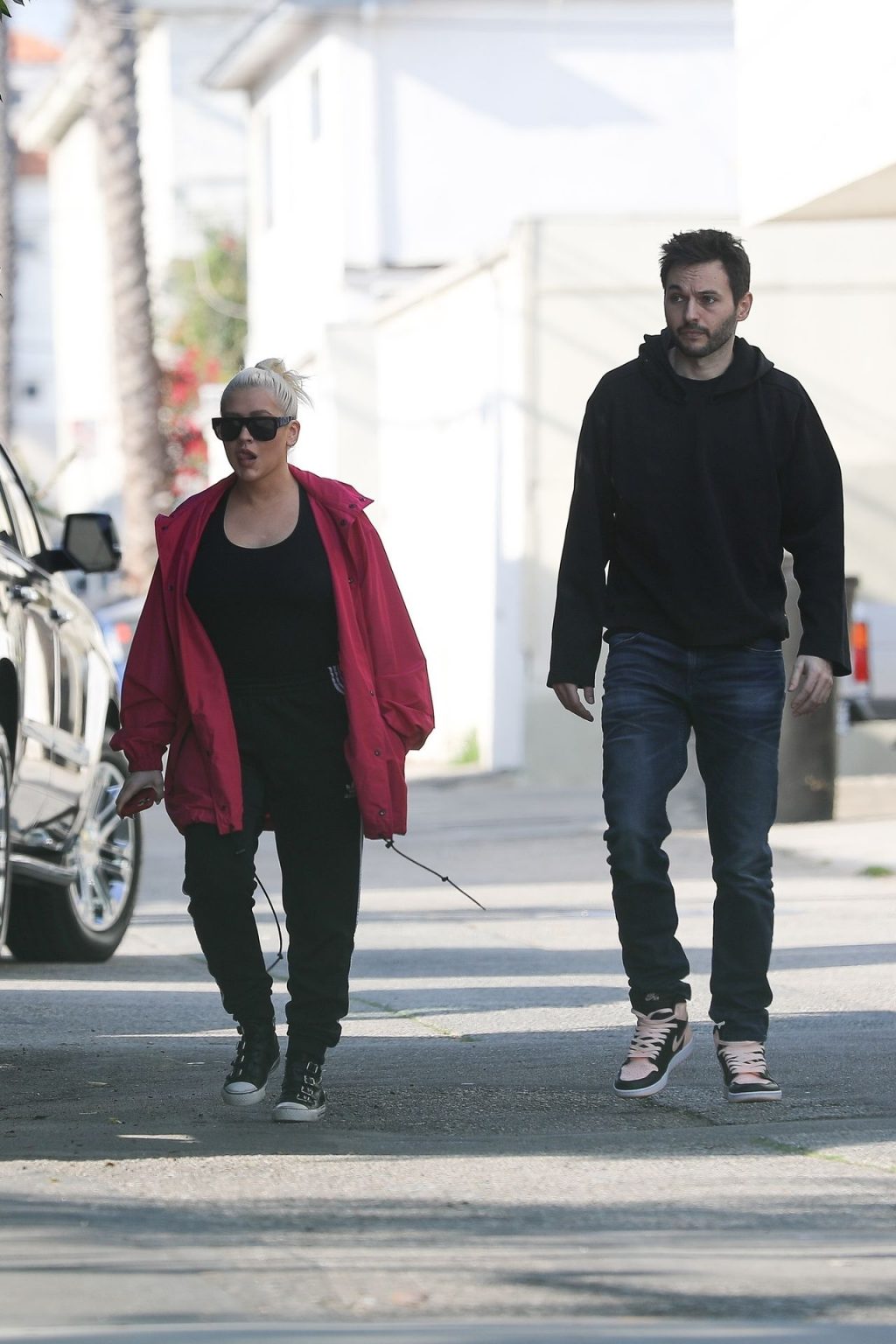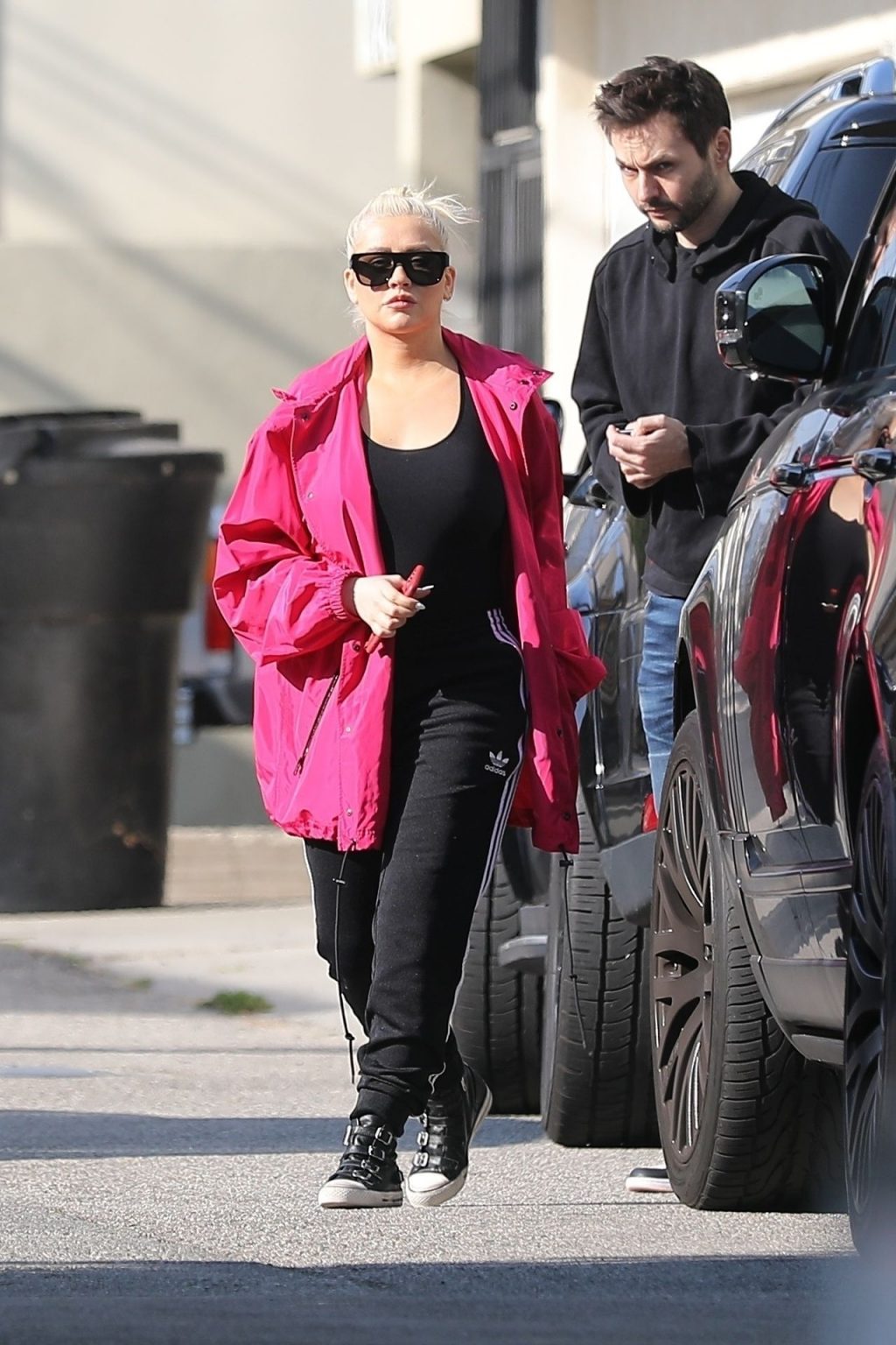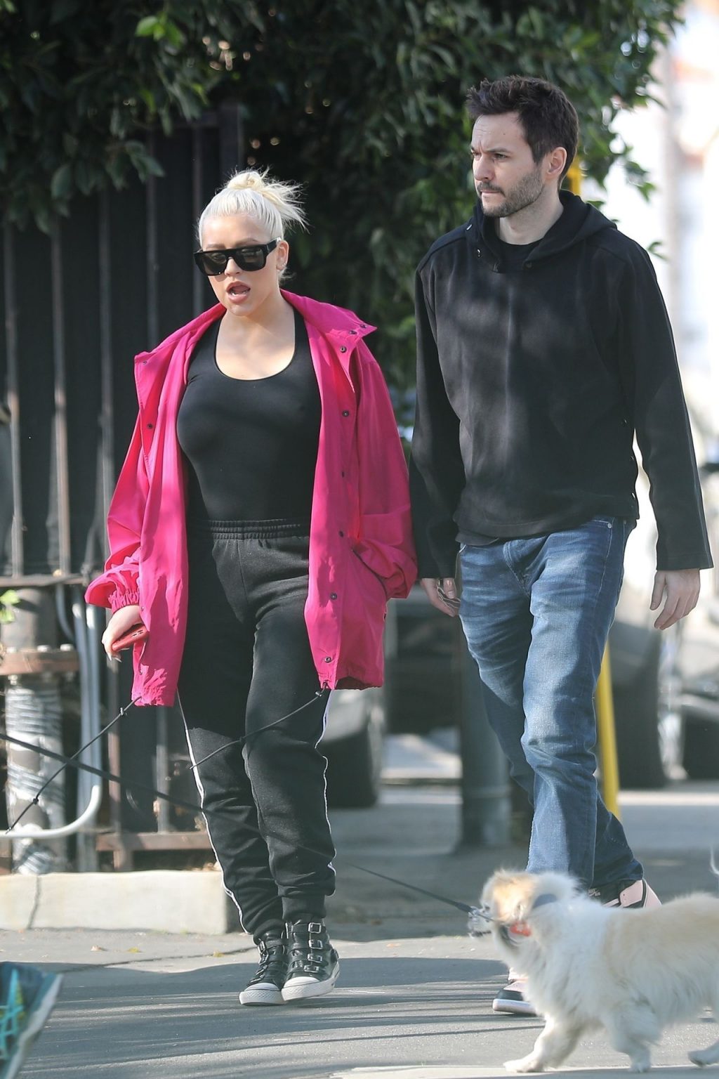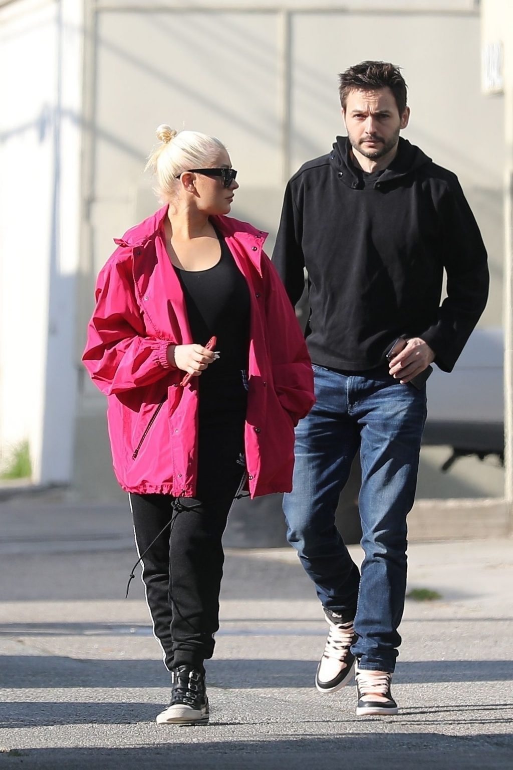 La cantante Christina Aguilera junto a su pareja Matthew Rutler llegan a la escuela de su hija Summer Rain Rutler para recogerla – Santa Mónica, 14/01/2020. Christina lleva una chaqueta cortavientos Balenciaga rosa fuerte y gafas de sol YSL. Luce su figura sin sostén, mostrando sus pechos a través de su top negro transparente.