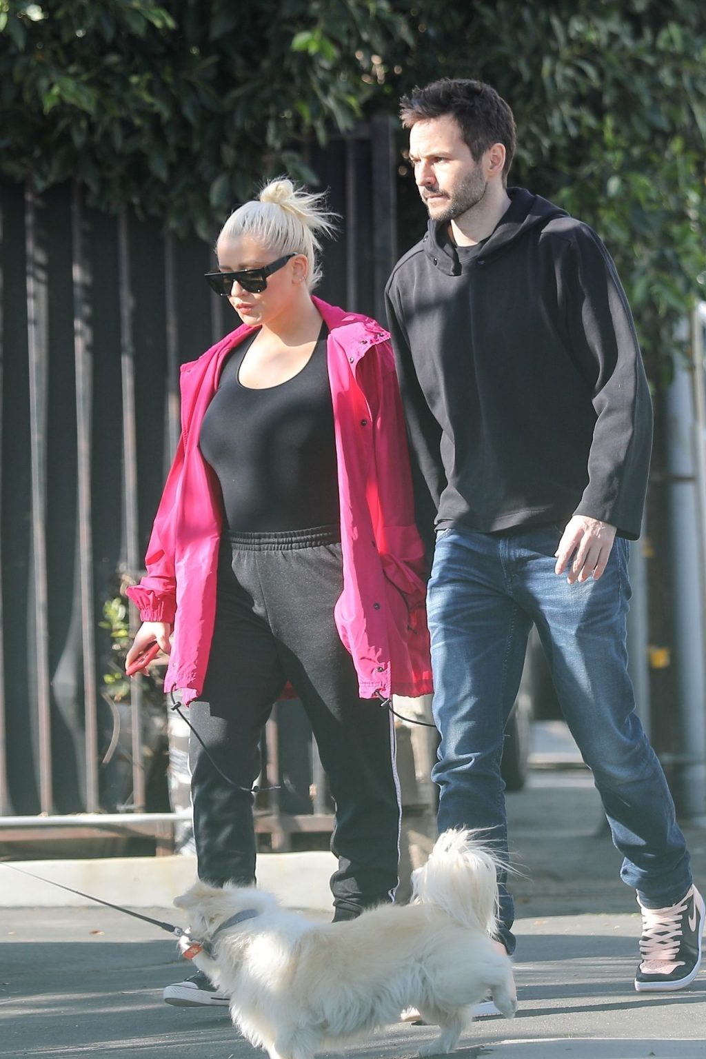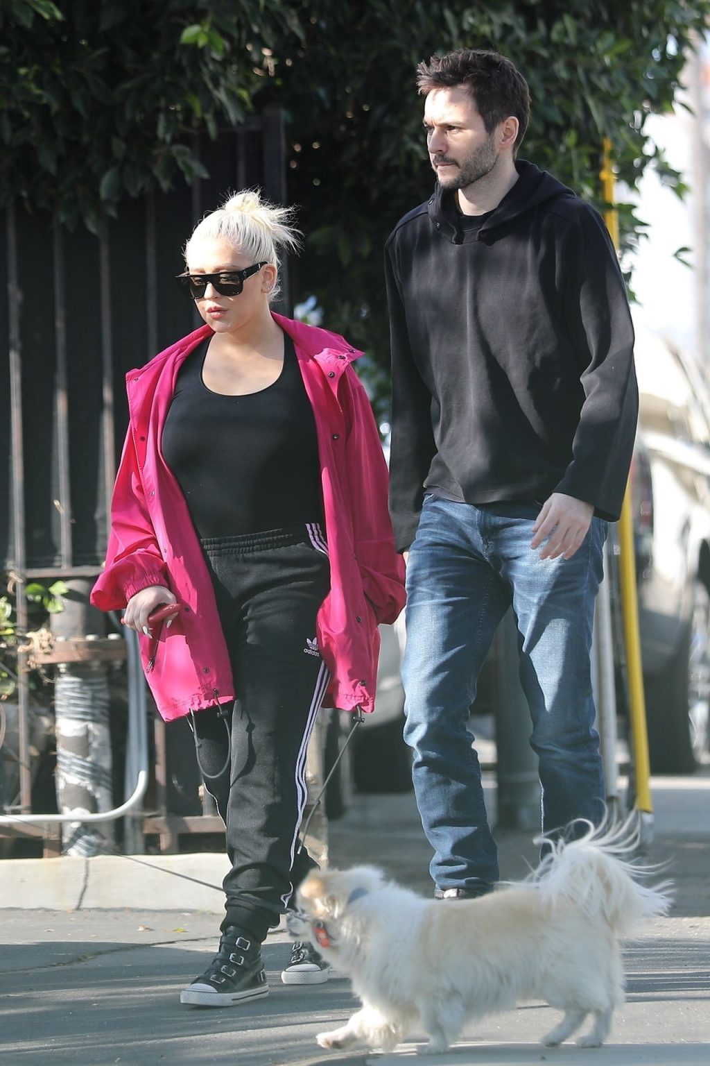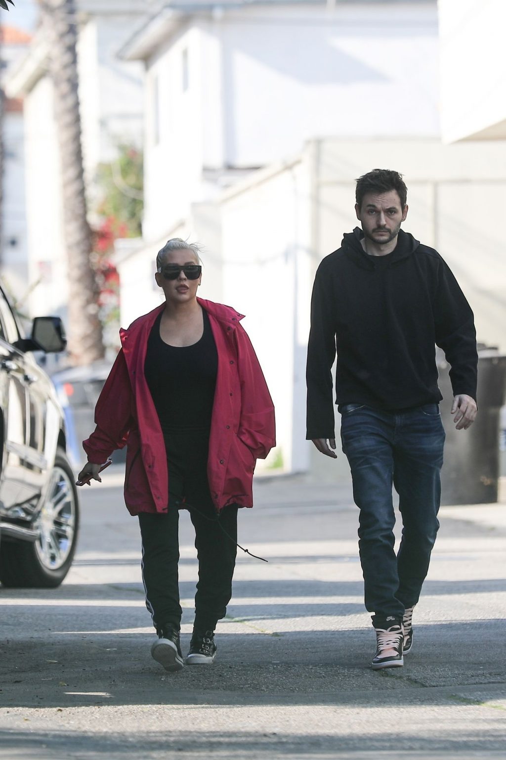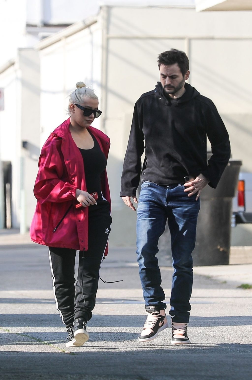 La cantante Christina Aguilera junto a su pareja Matthew Rutler llegan a la escuela de su hija Summer Rain Rutler para recogerla – Santa Mónica, 14/01/2020. Christina lleva una chaqueta cortavientos Balenciaga rosa fuerte y gafas de sol YSL. Luce su figura sin sostén, mostrando sus pechos a través de su top negro transparente.