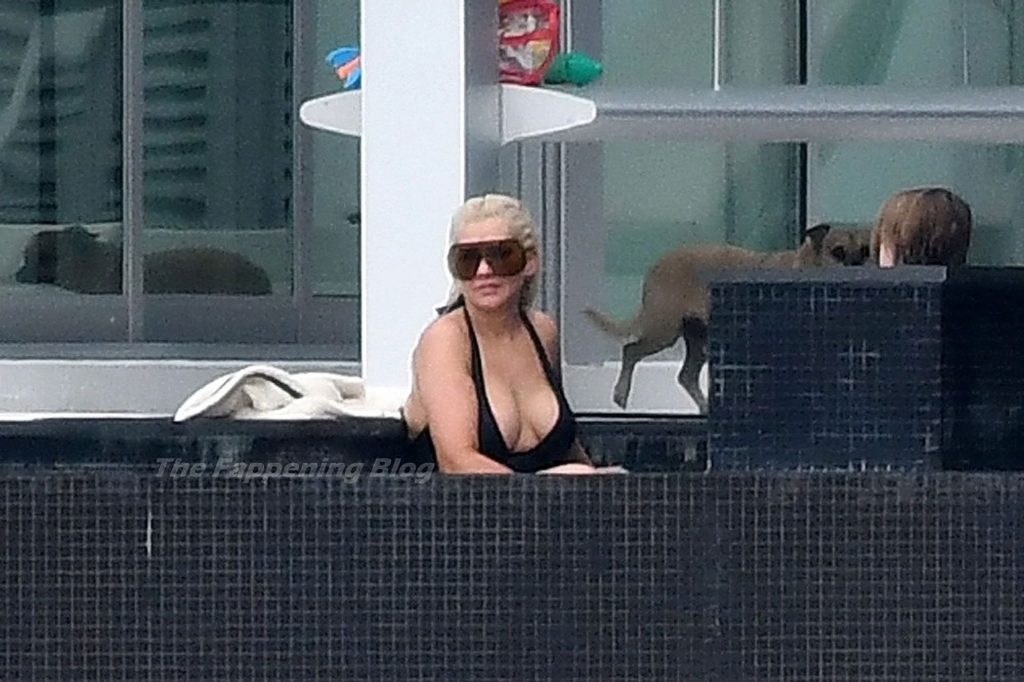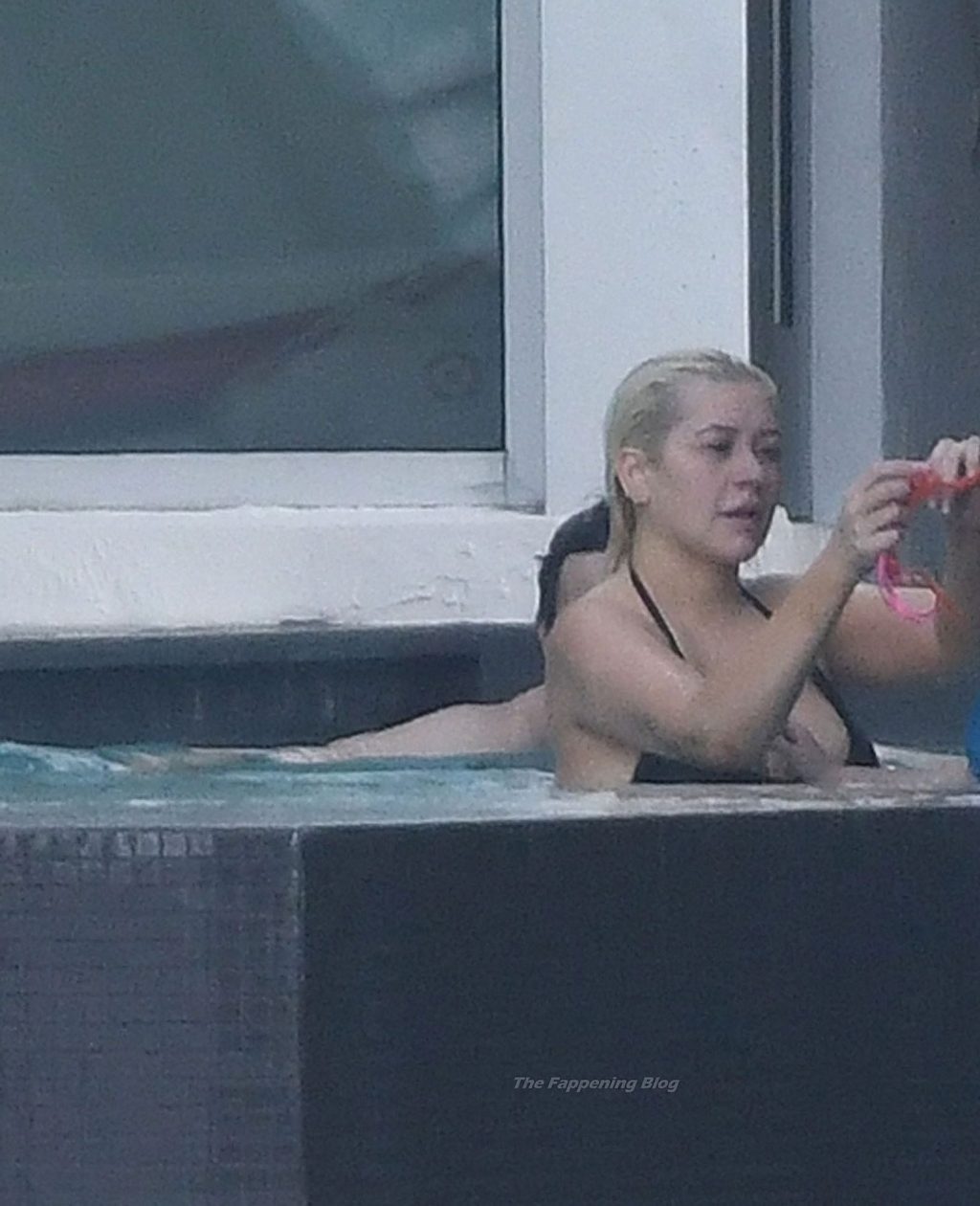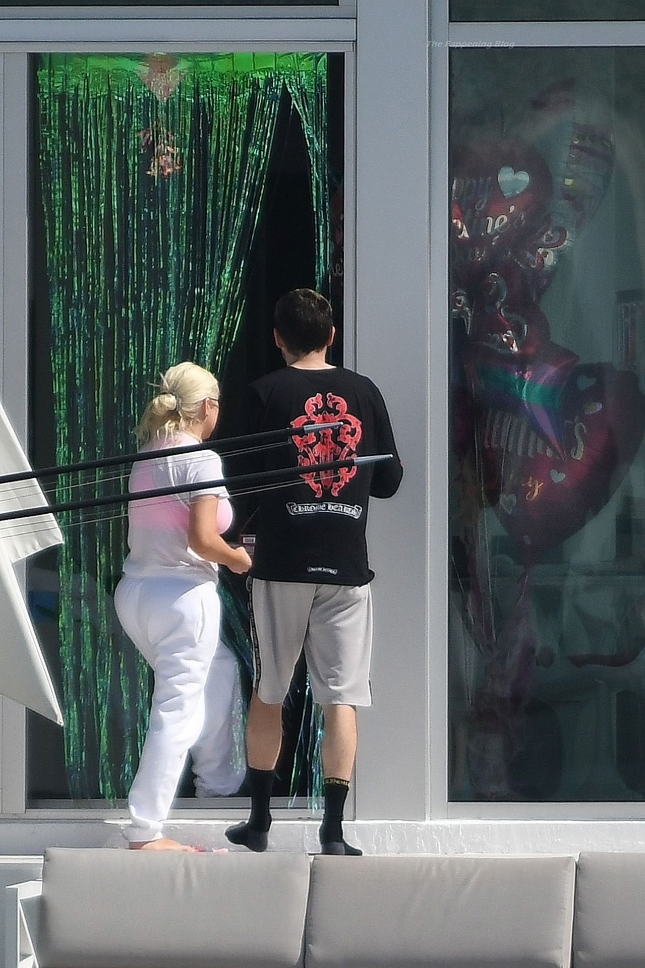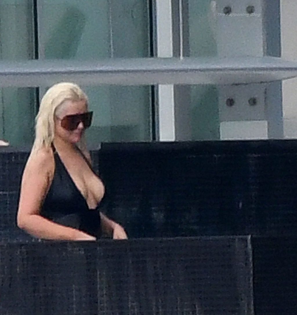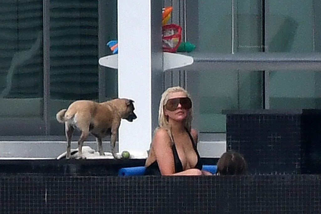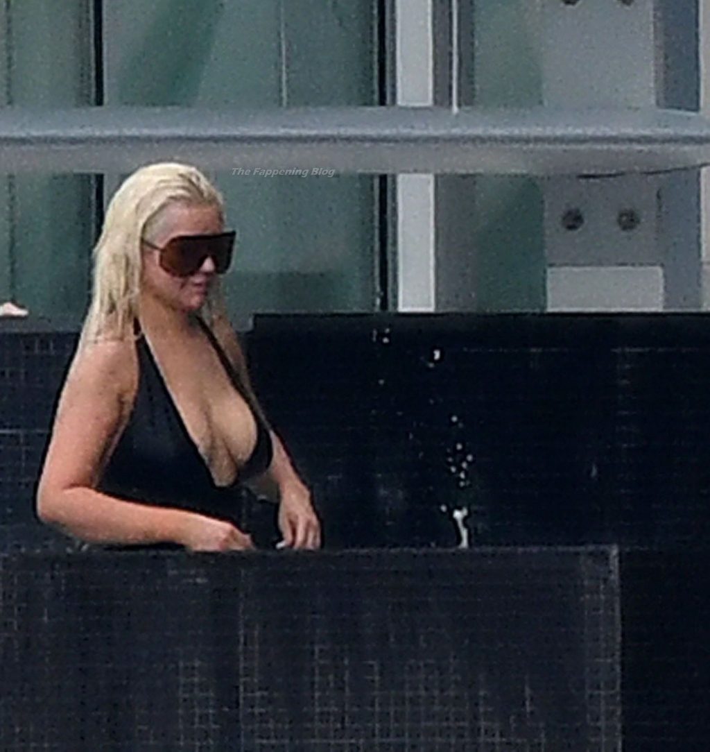 She gets balloons and flowers as she spends Valentine’s Day by the pool with her family. The popstar was first seen in a bright pink sports bra and white pants before changing into her black one-piece swimsuit for a dip in the pool. Aguilera was accompanied by her fiancé Matthew Rutler.