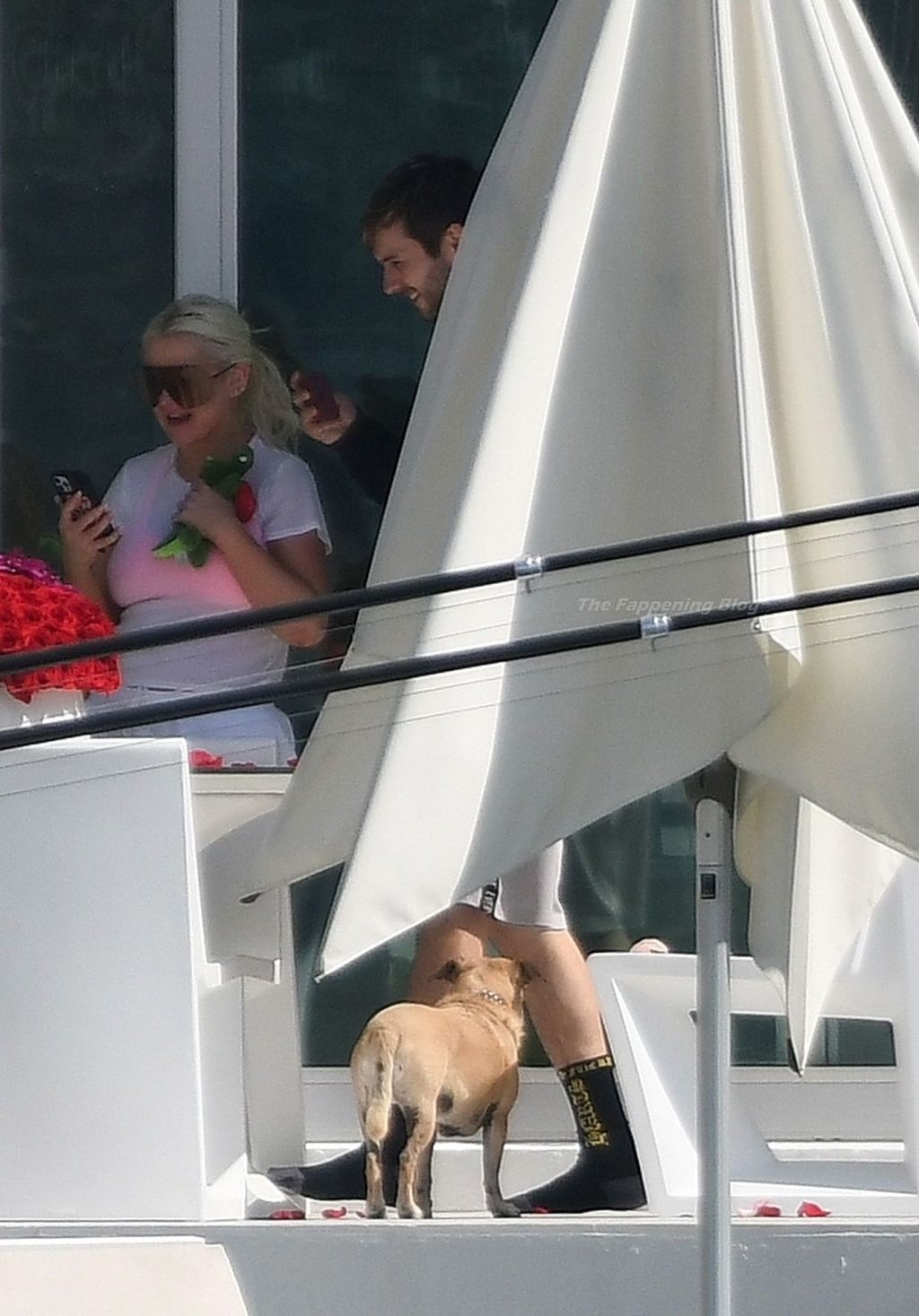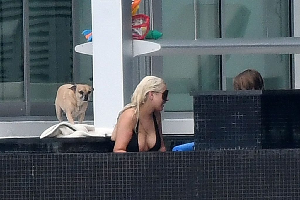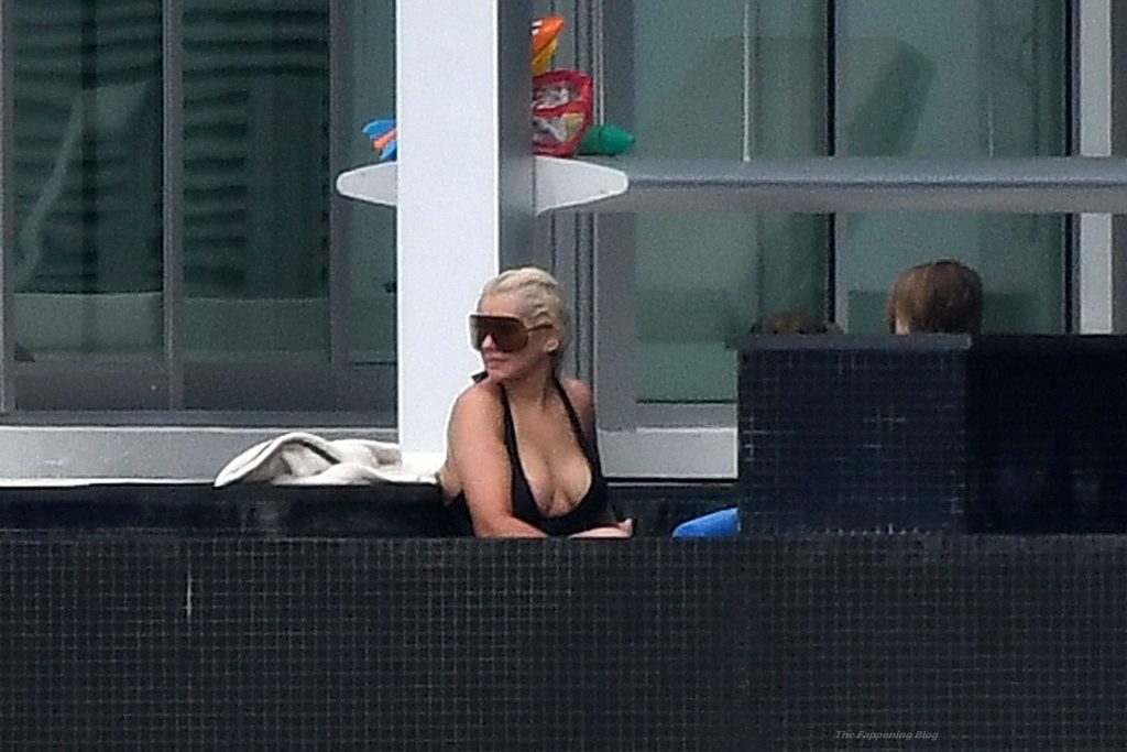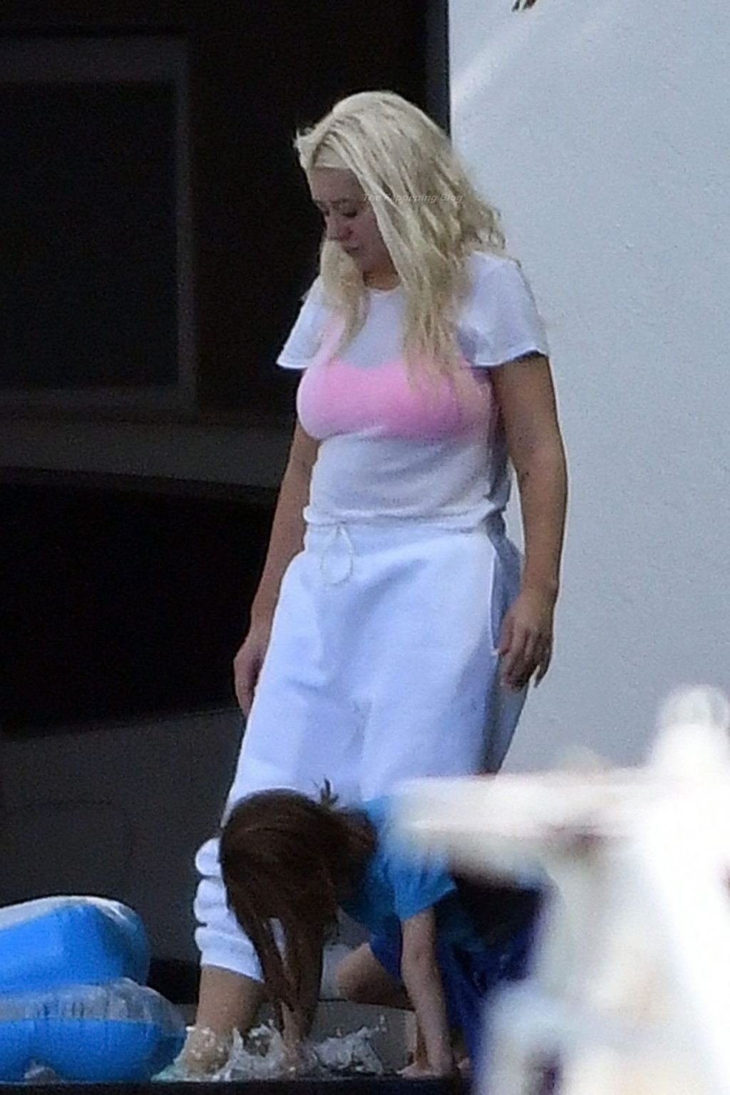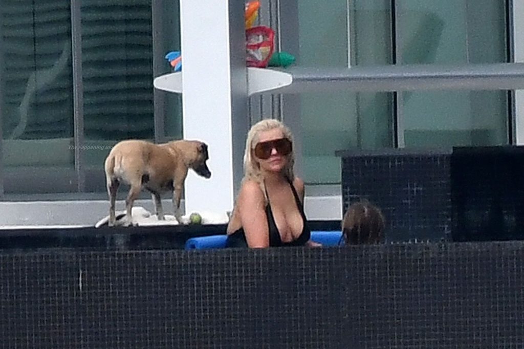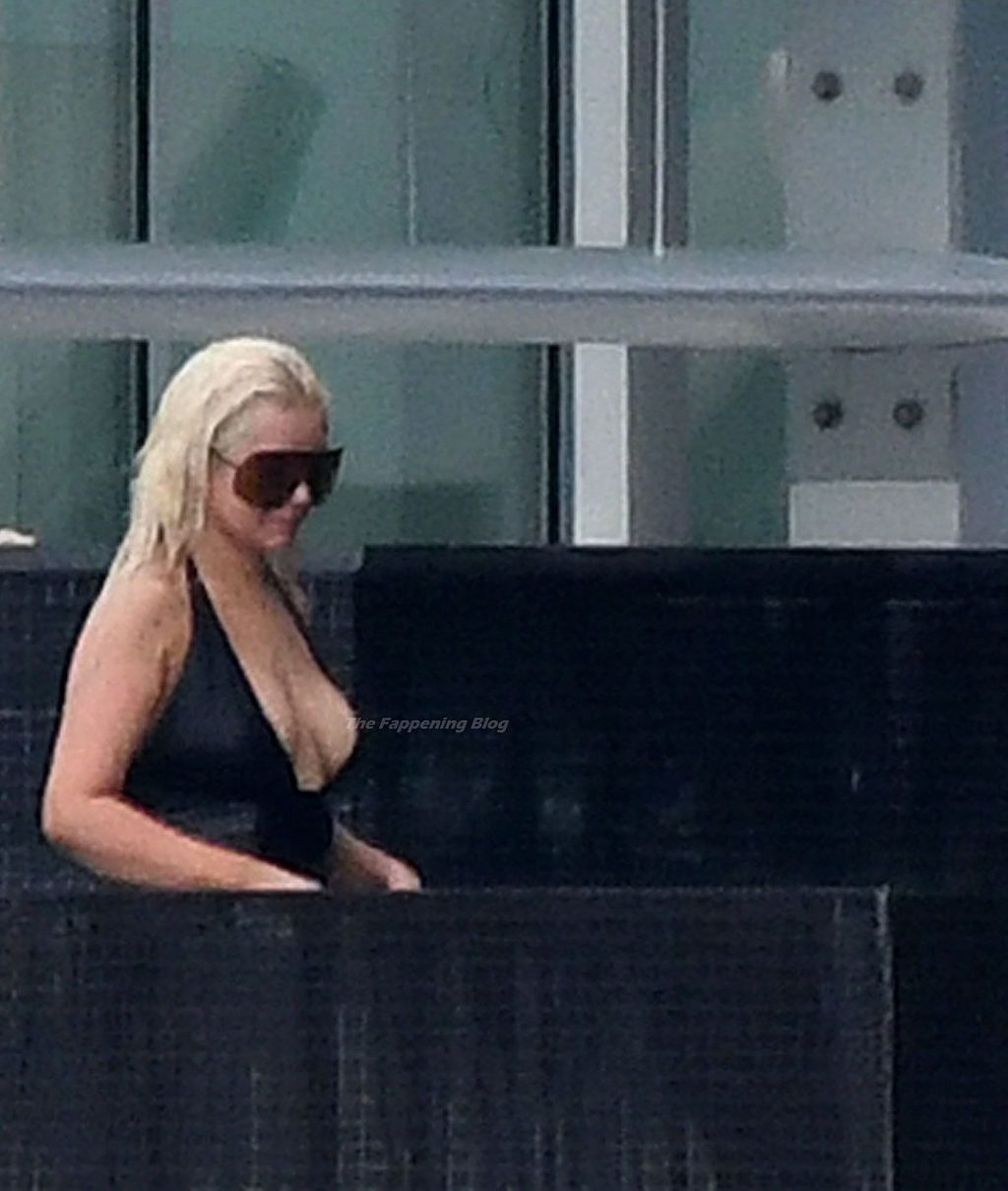 She gets balloons and flowers as she spends Valentine’s Day by the pool with her family. The popstar was first seen in a bright pink sports bra and white pants before changing into her black one-piece swimsuit for a dip in the pool. Aguilera was accompanied by her fiancé Matthew Rutler.