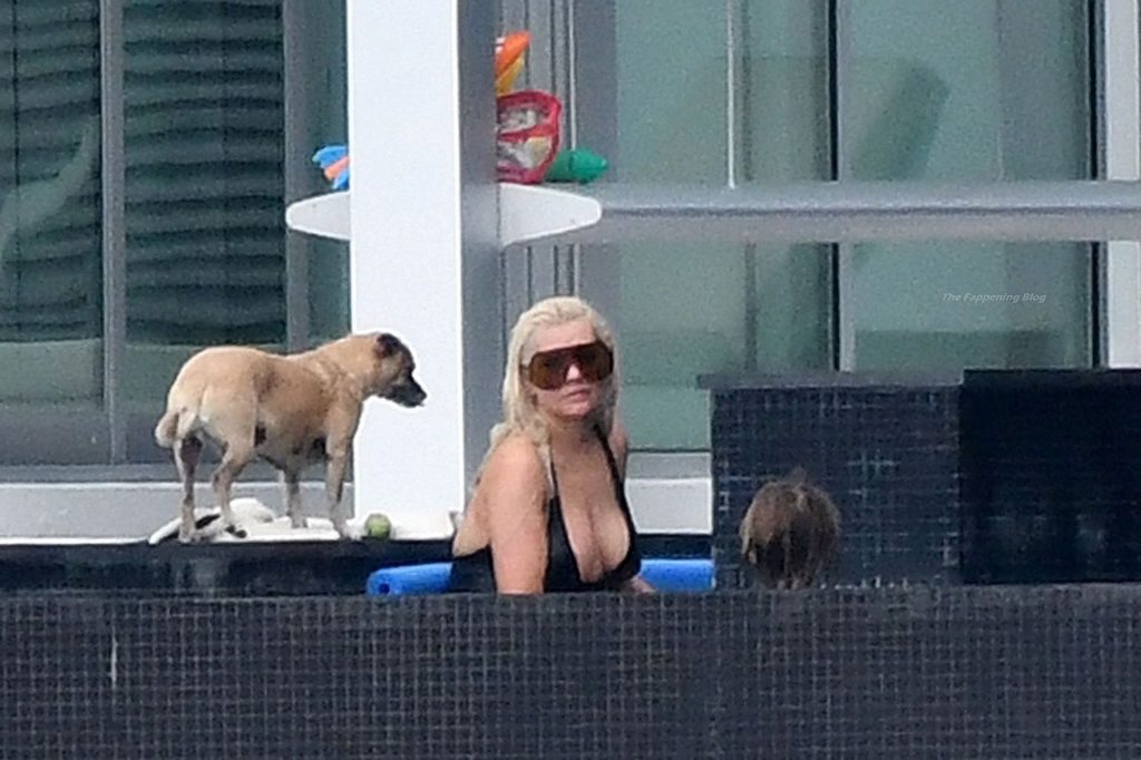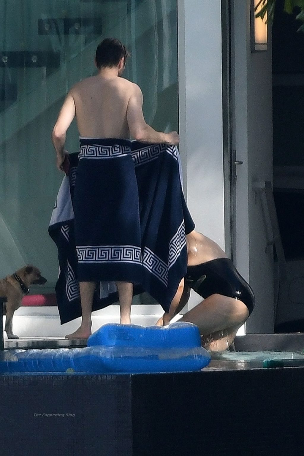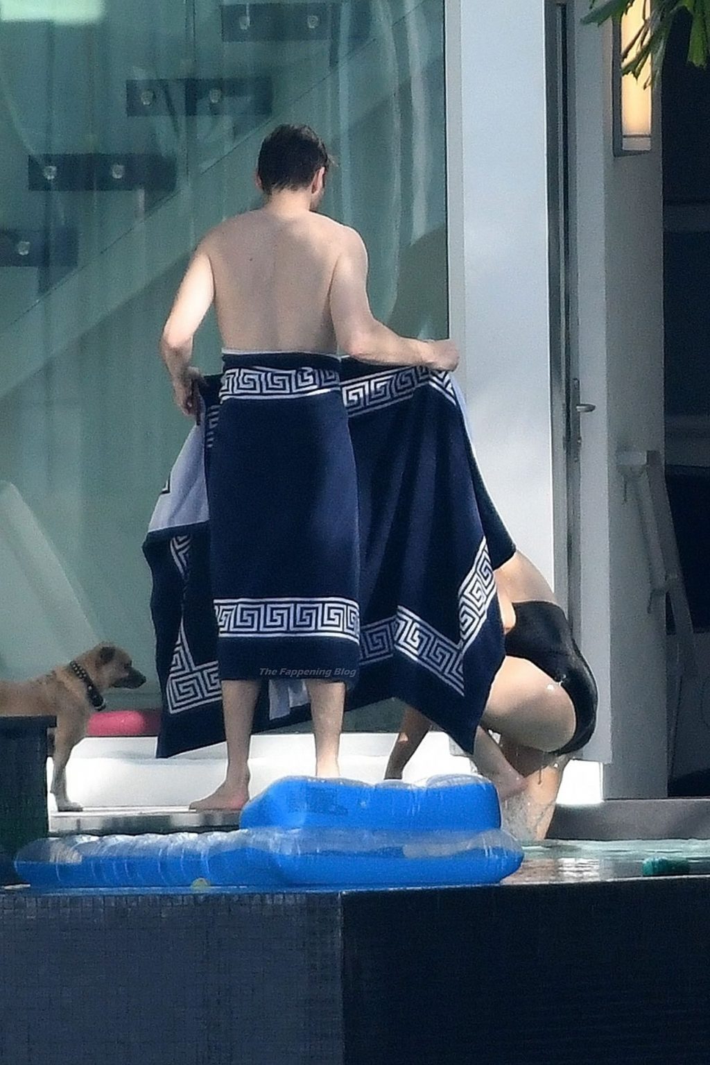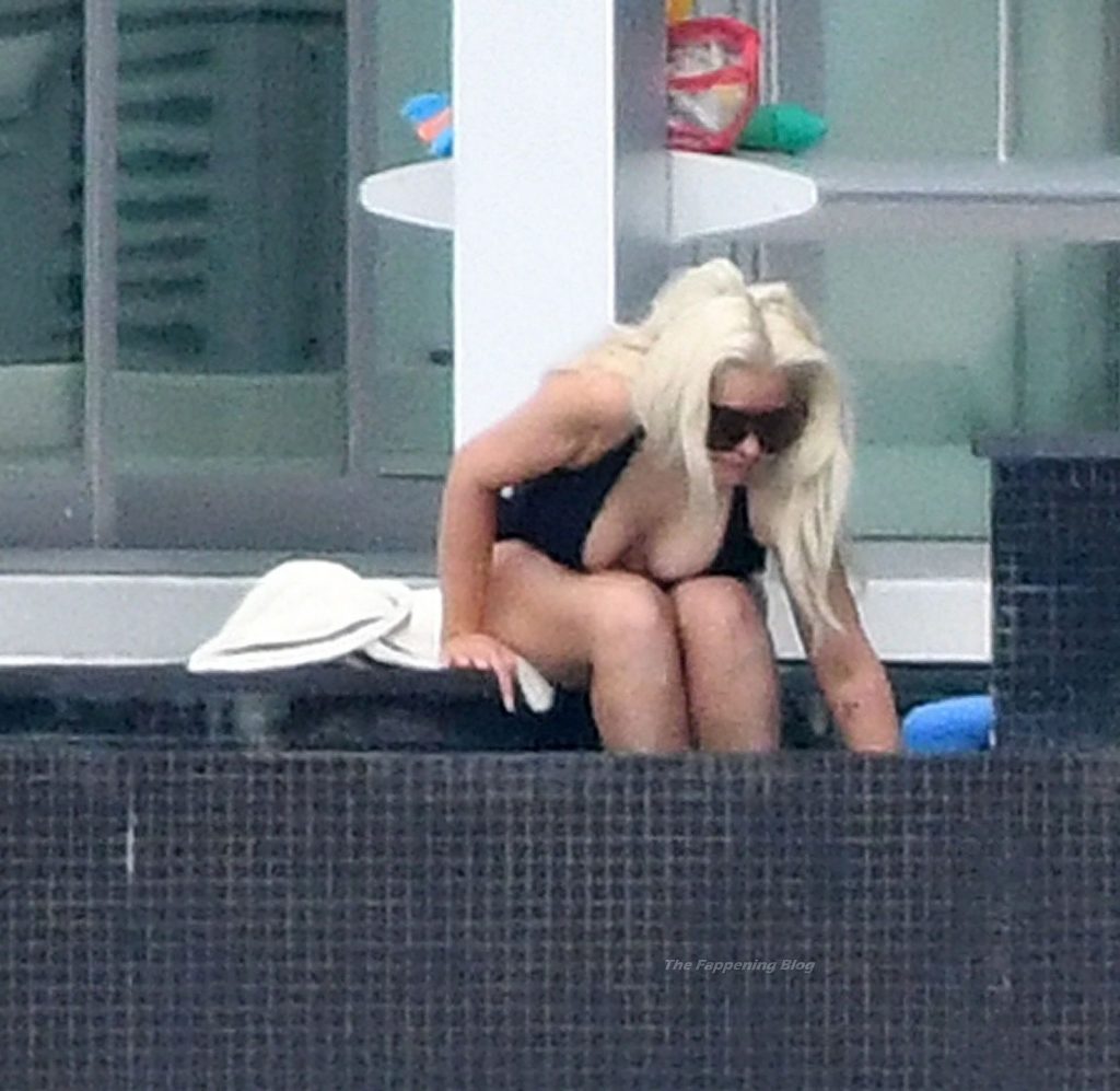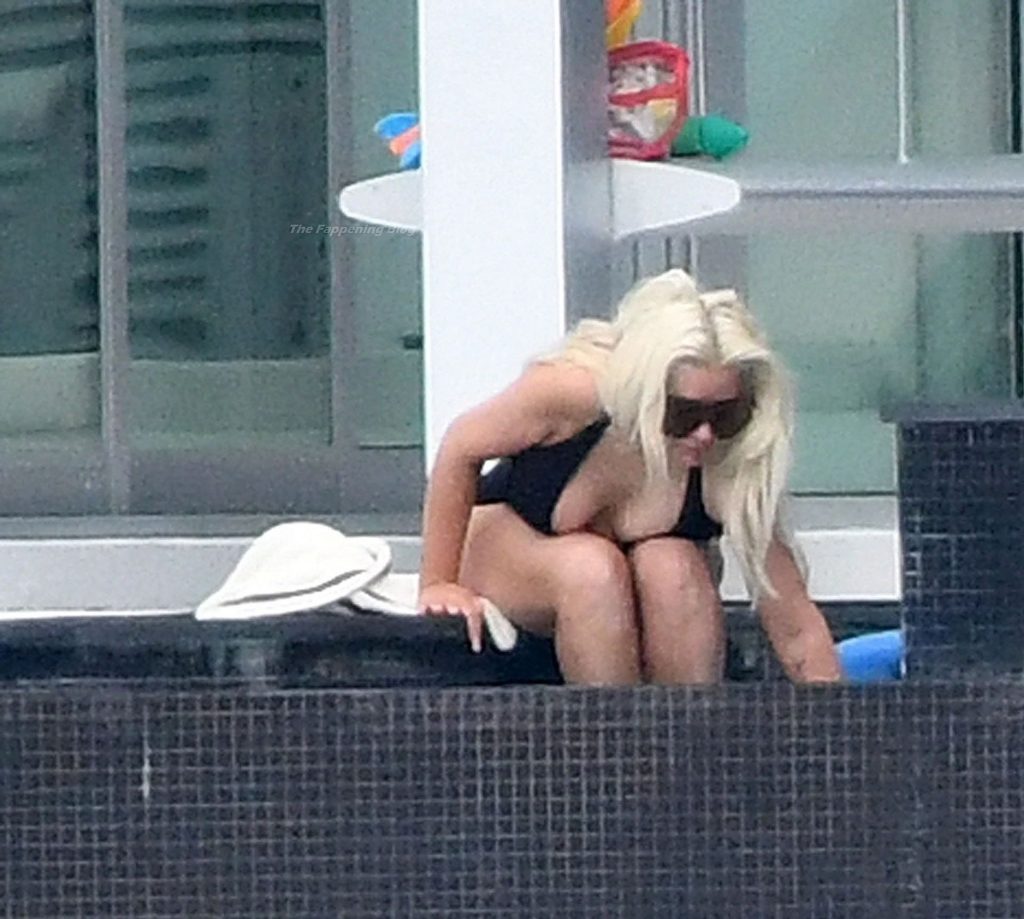 She gets balloons and flowers as she spends Valentine’s Day by the pool with her family. The popstar was first seen in a bright pink sports bra and white pants before changing into her black one-piece swimsuit for a dip in the pool. Aguilera was accompanied by her fiancé Matthew Rutler.