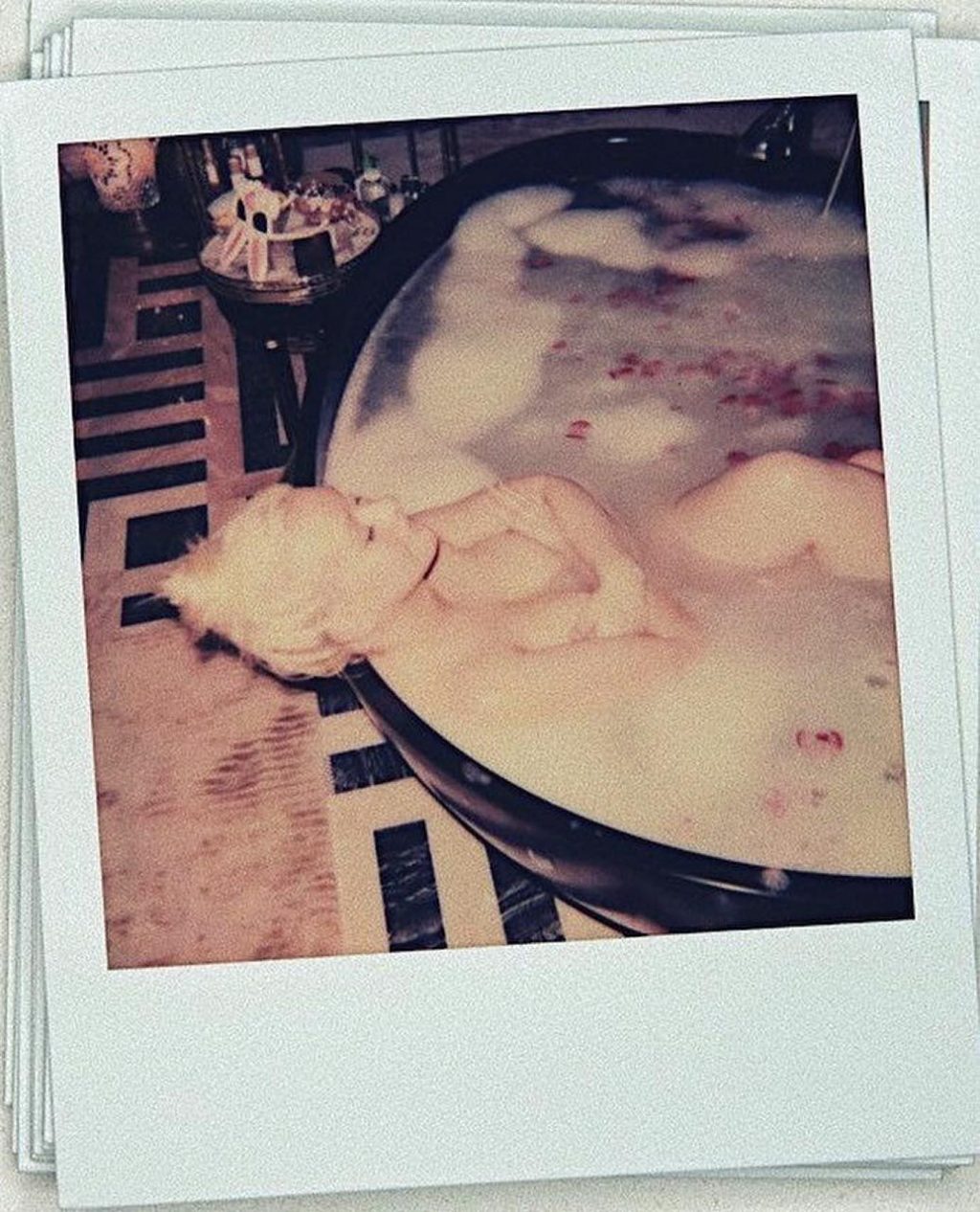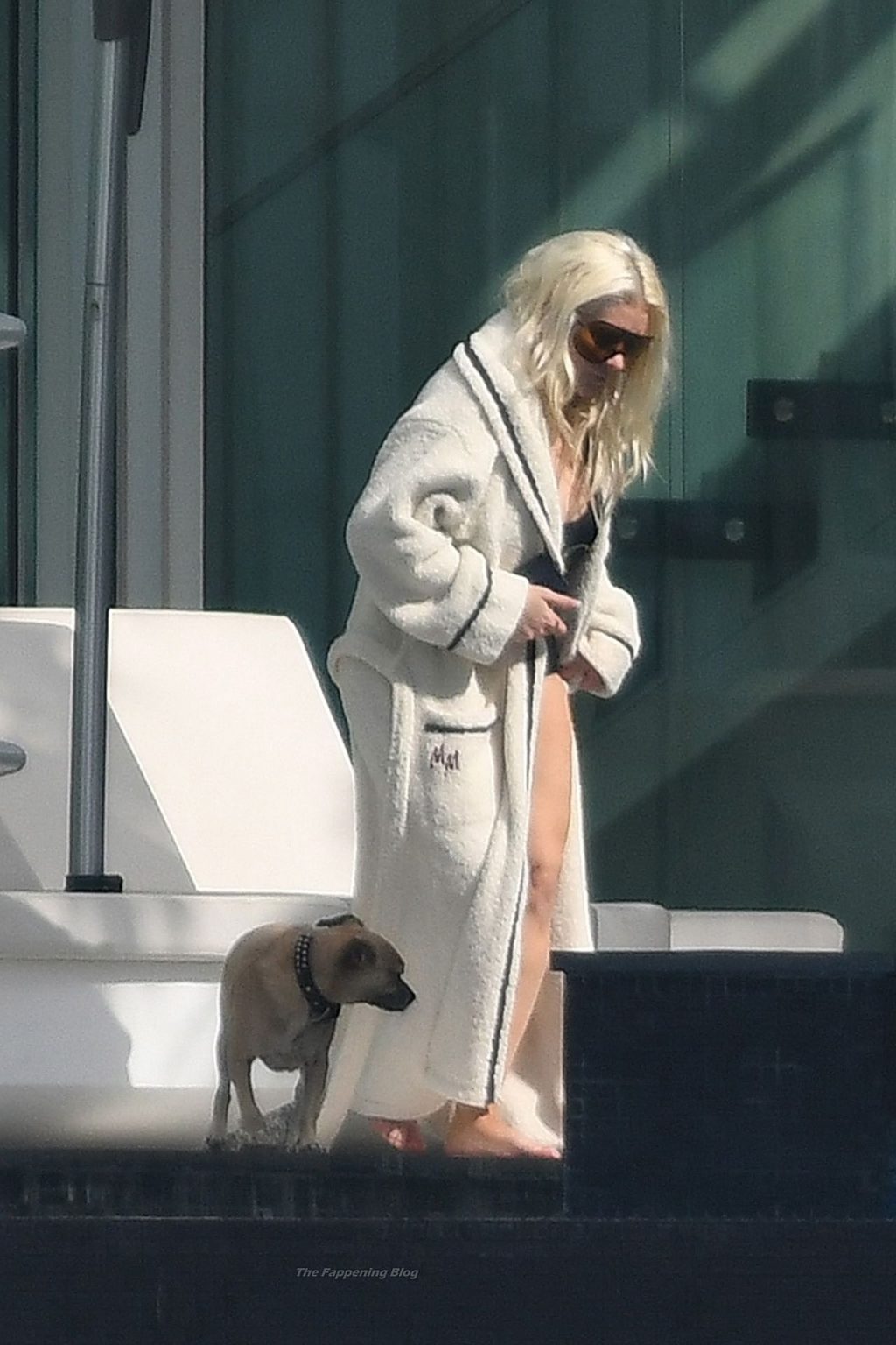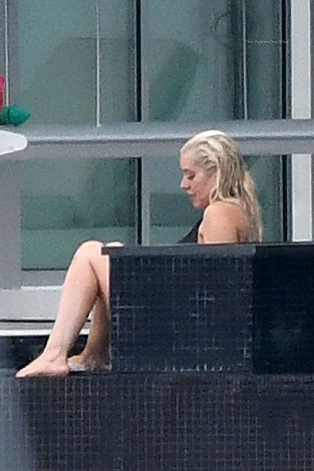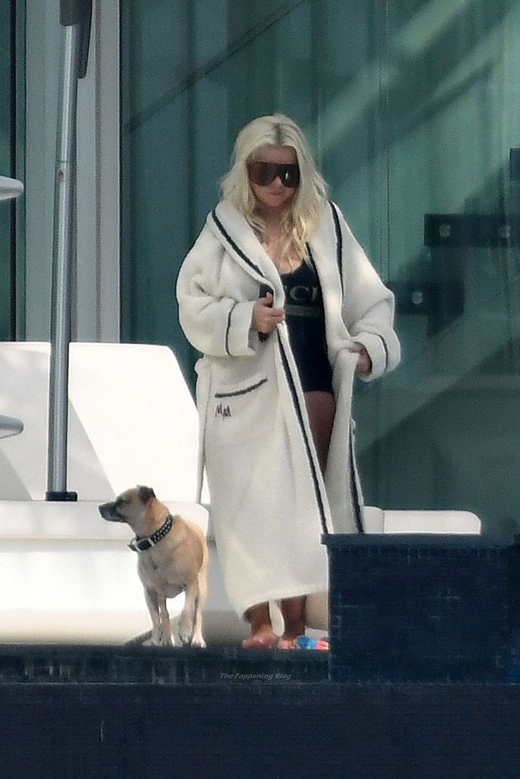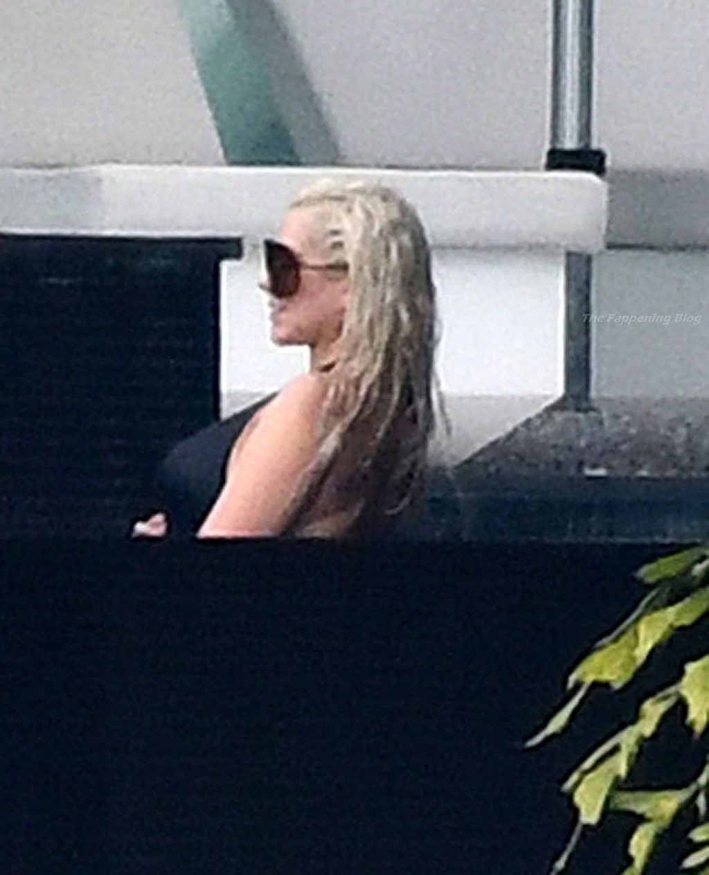 She gets balloons and flowers as she spends Valentine’s Day by the pool with her family. The popstar was first seen in a bright pink sports bra and white pants before changing into her black one-piece swimsuit for a dip in the pool. Aguilera was accompanied by her fiancé Matthew Rutler.