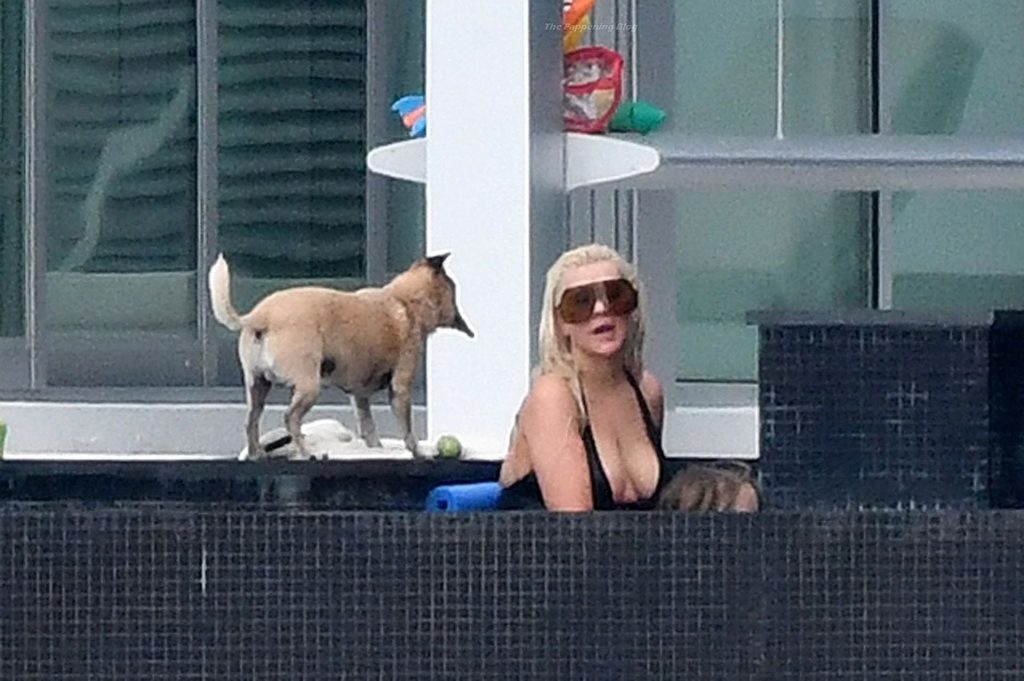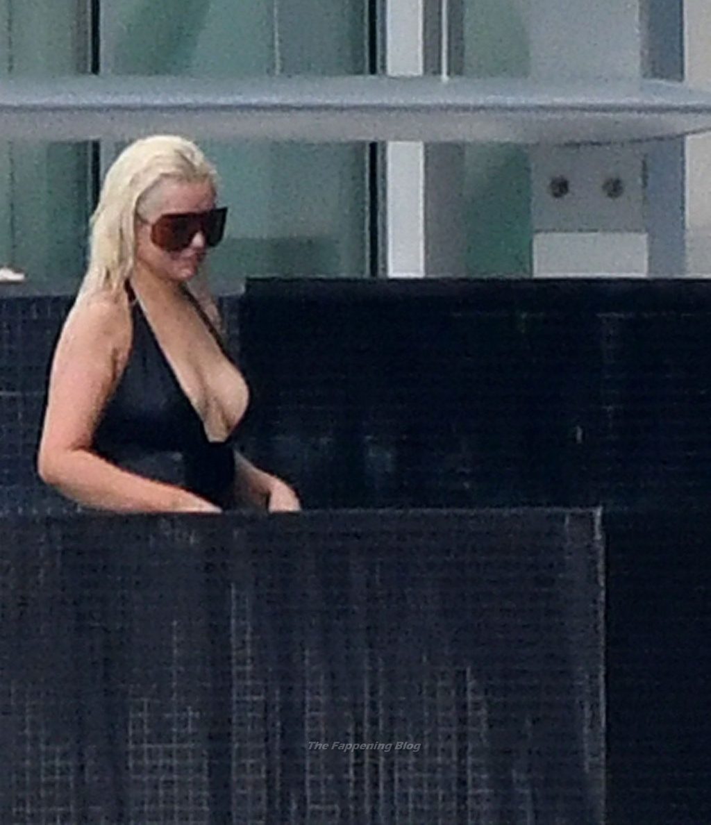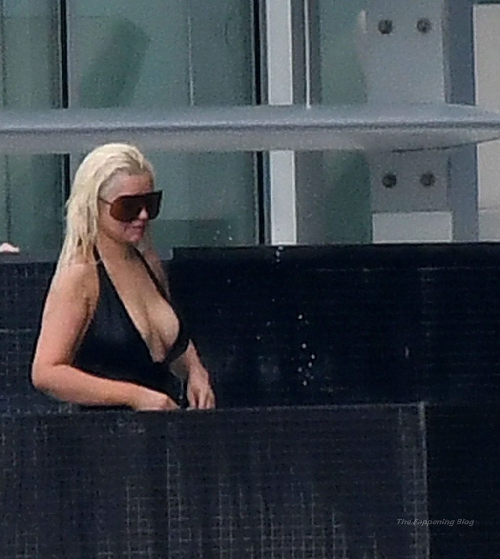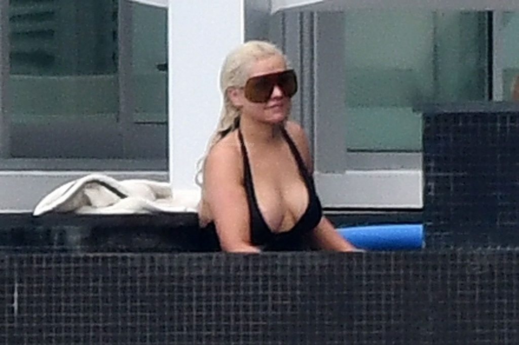 Christina Aguilera wears a black swimsuit and oversized sunglasses as she takes a dip in the pool between recording sessions in Miami. The pop star was also seen playing with her dog and her children and covering up with a white Minnie Mouse robe.