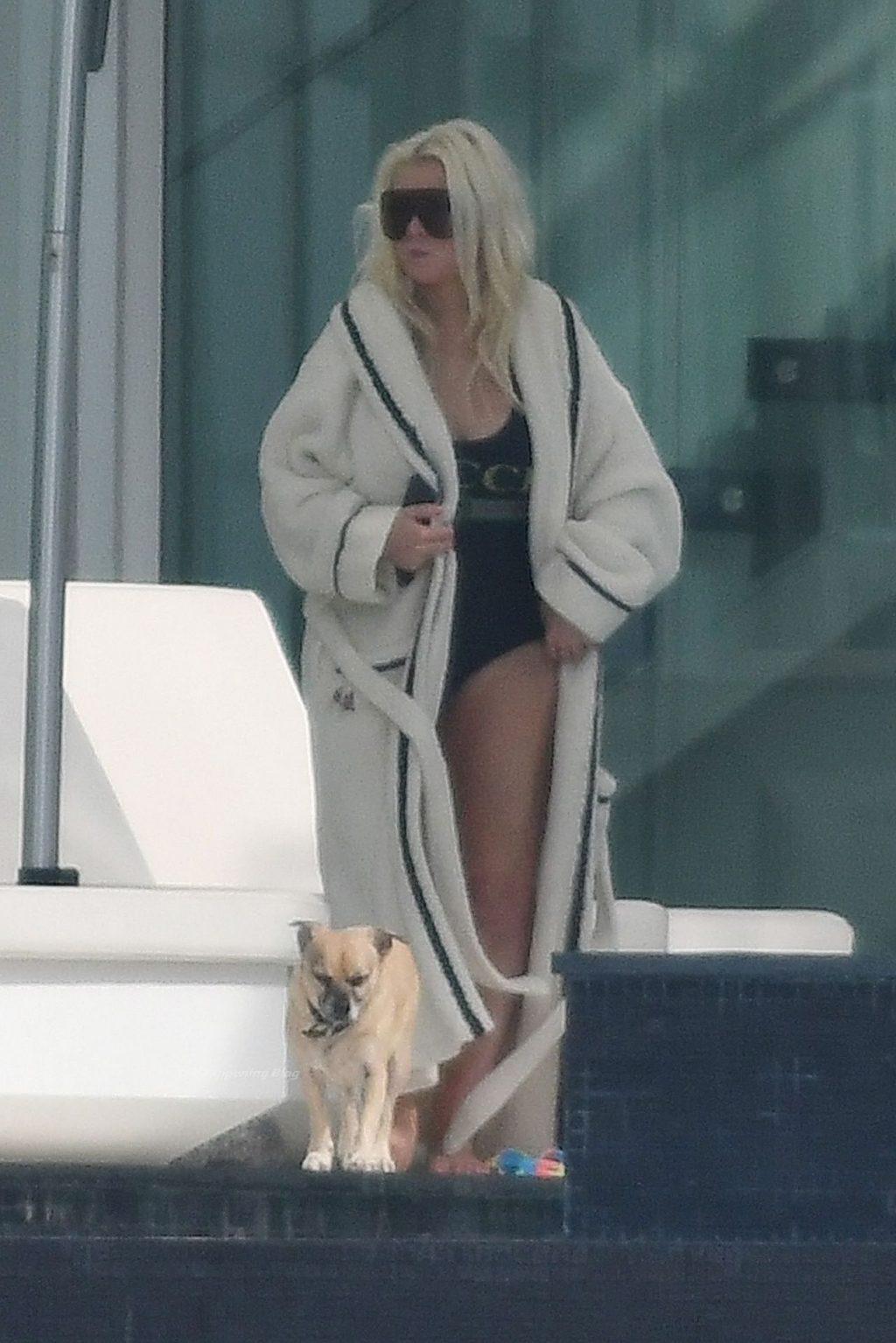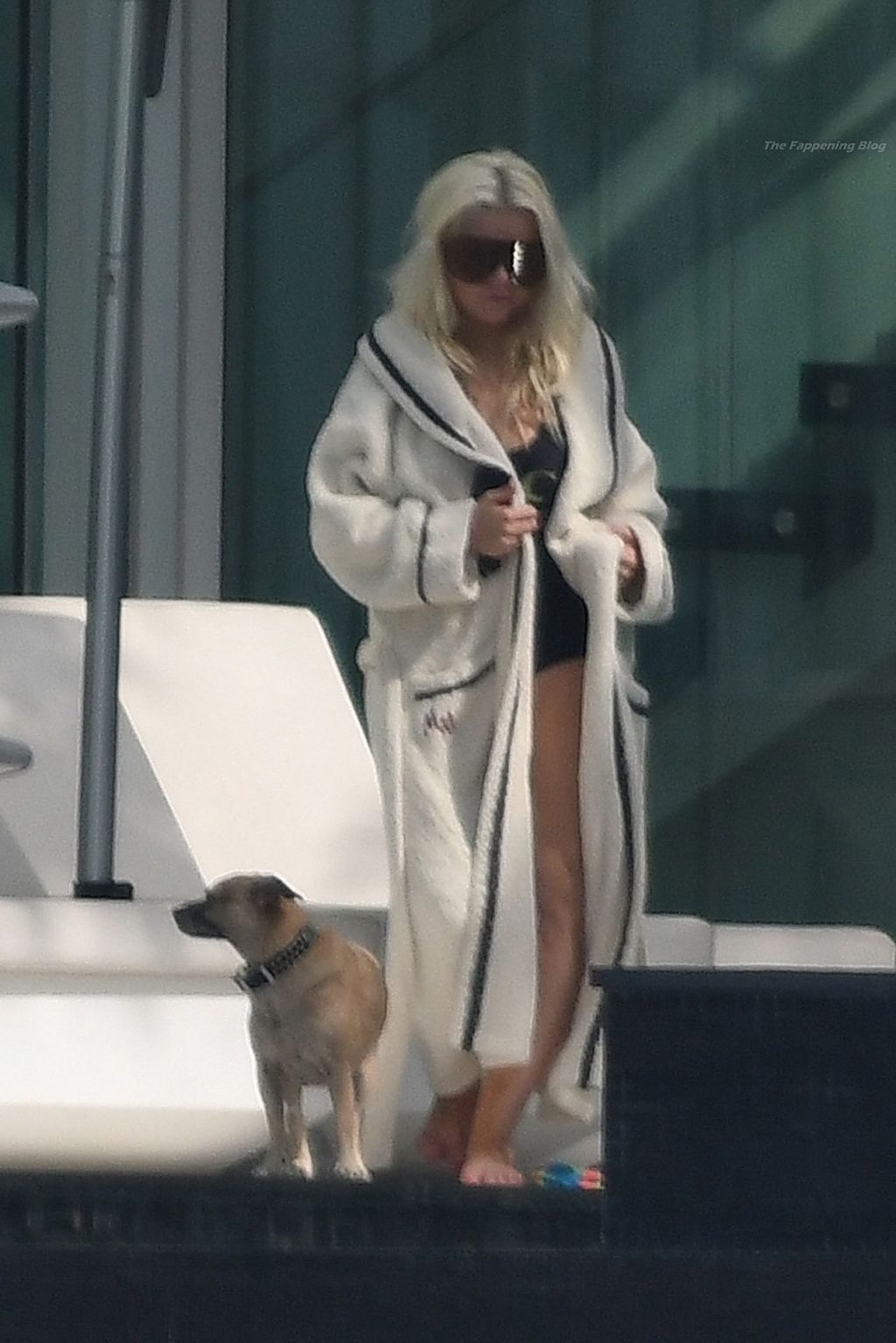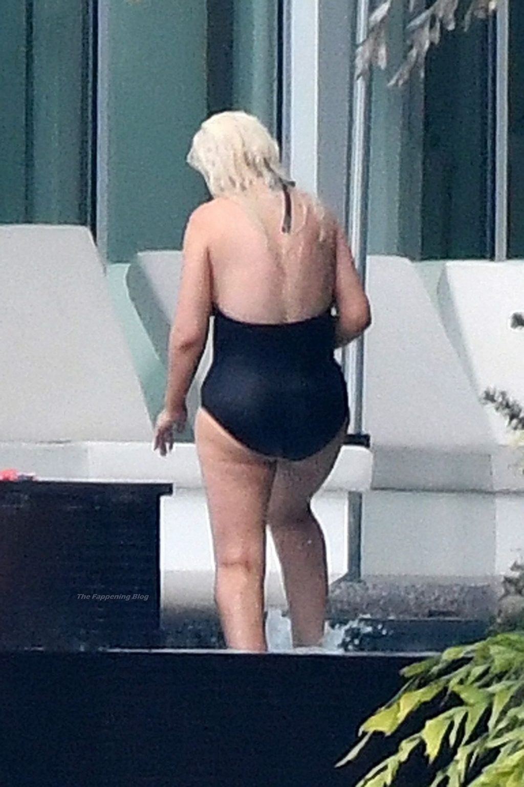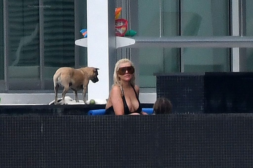 Christina Aguilera wears a black swimsuit and oversized sunglasses as she takes a dip in the pool between recording sessions in Miami. The pop star was also seen playing with her dog and her children and covering up with a white Minnie Mouse robe.