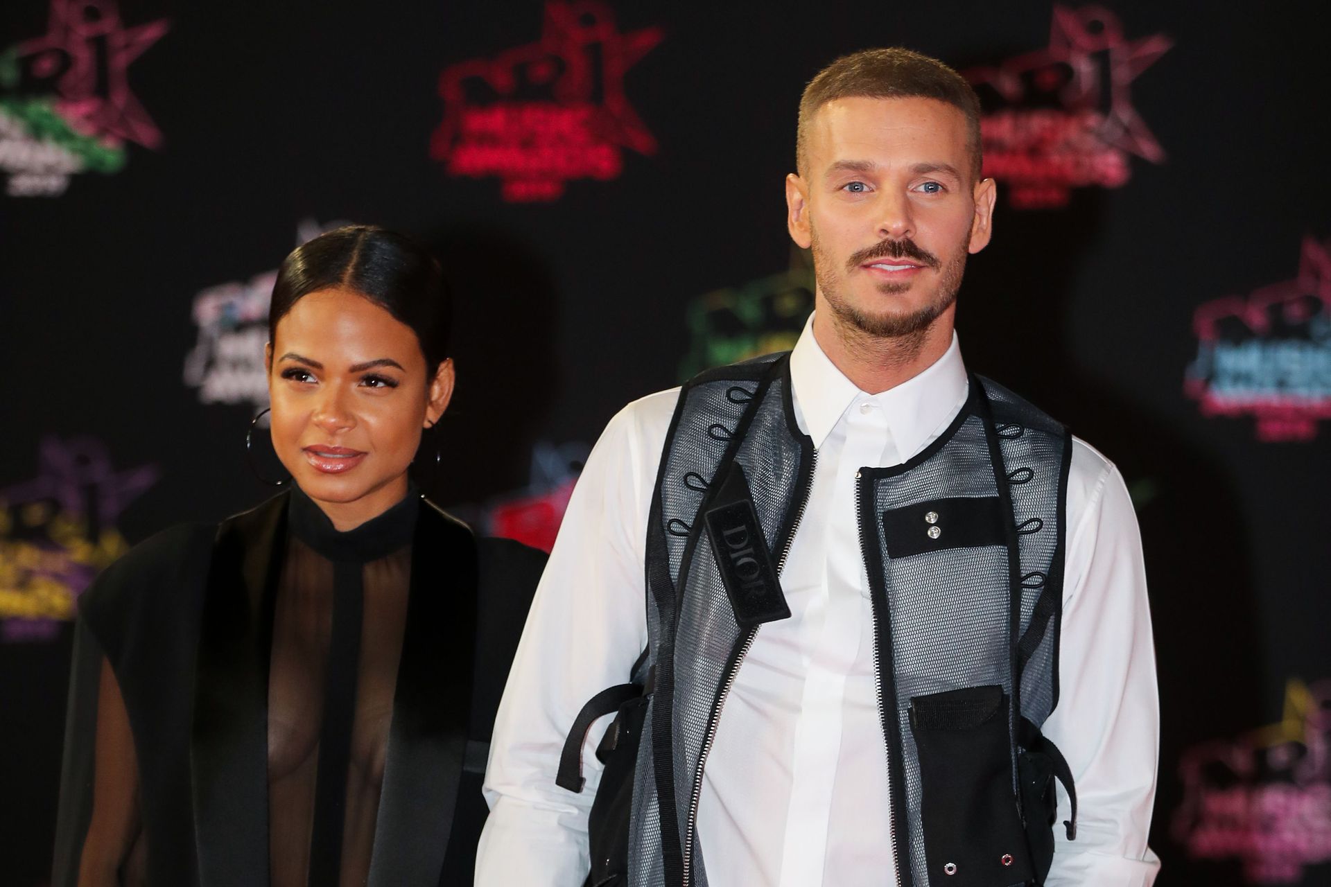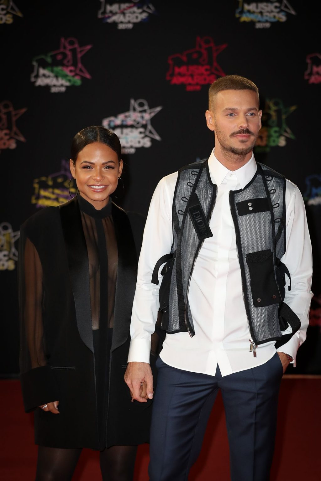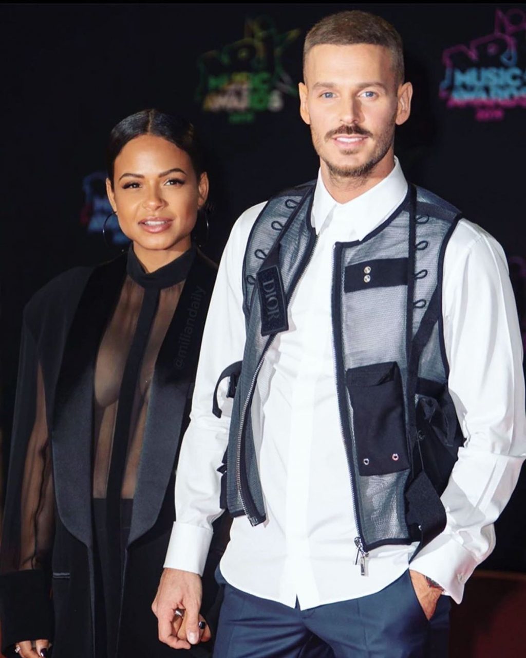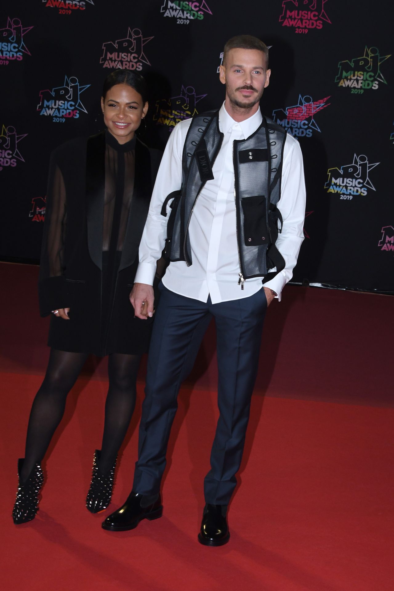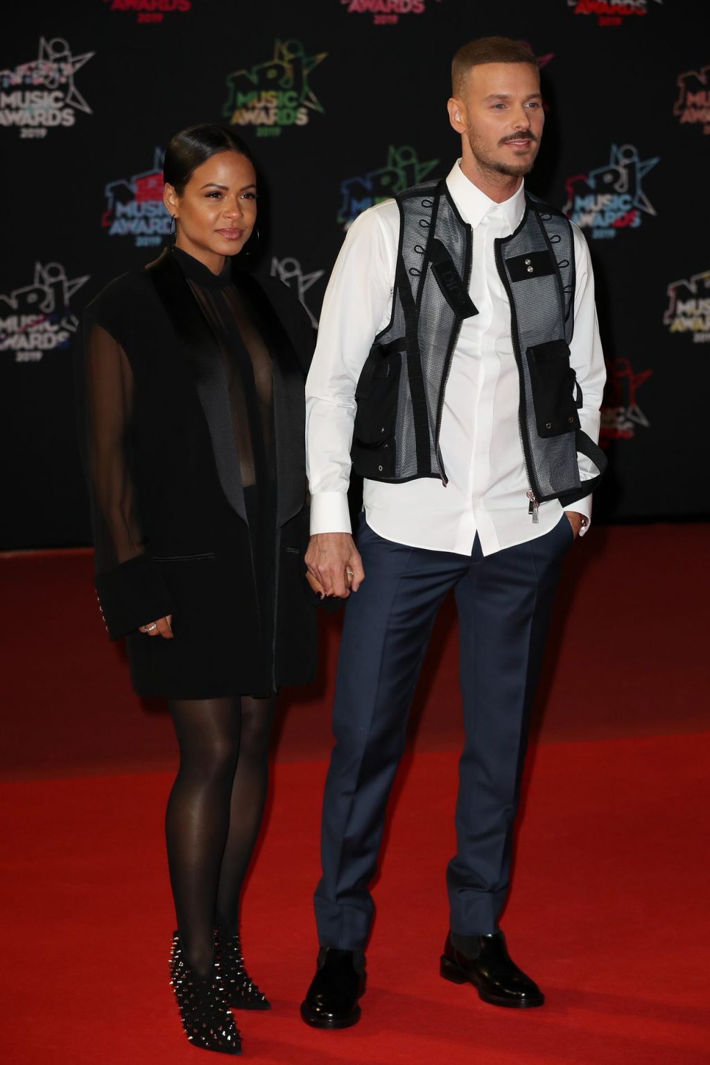 Cantante estadounidense Christina Milian y cantante francés M Pokora posan en la alfombra roja al llegar para asistir a la ceremonia de los 21º Premios NRJ Music en el Palais des Festivals en Cannes, sureste de Francia, 11/09/2019.