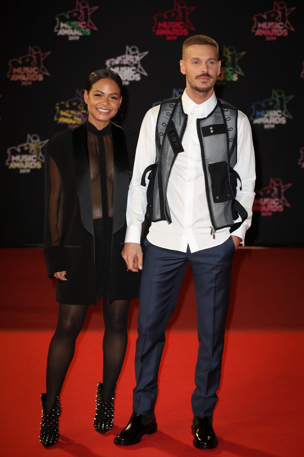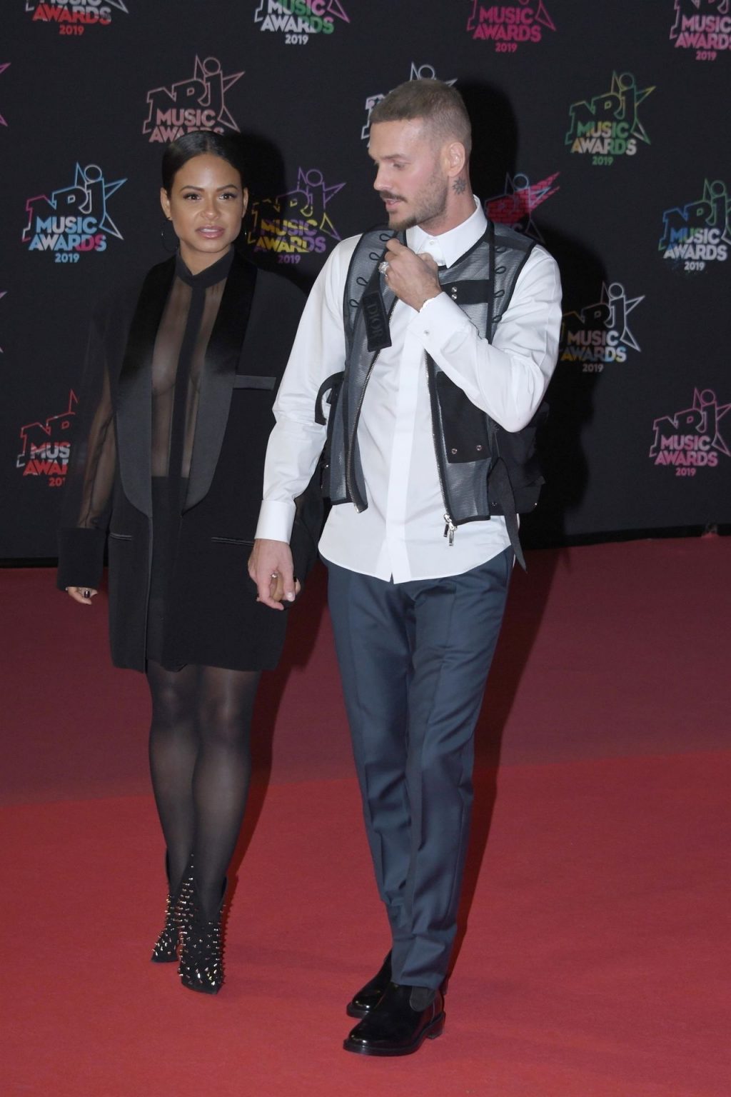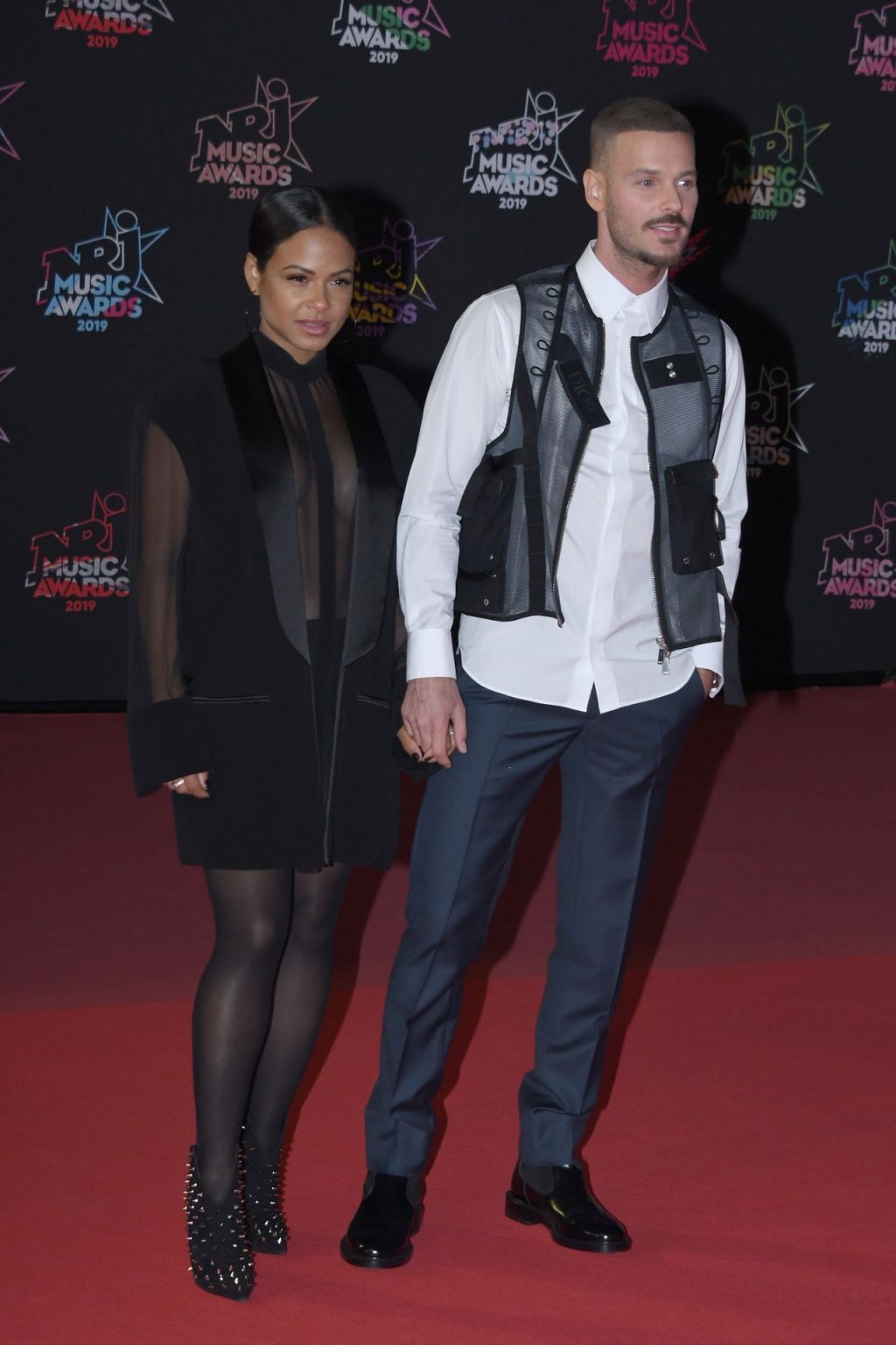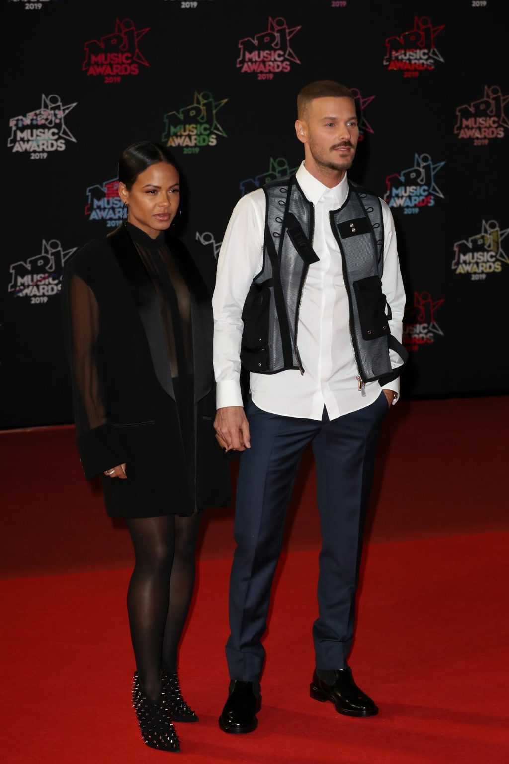 Cantante estadounidense Christina Milian y cantante francés M Pokora posan en la alfombra roja al llegar para asistir a la ceremonia de los 21º Premios NRJ Music en el Palais des Festivals en Cannes, sureste de Francia, 11/09/2019.