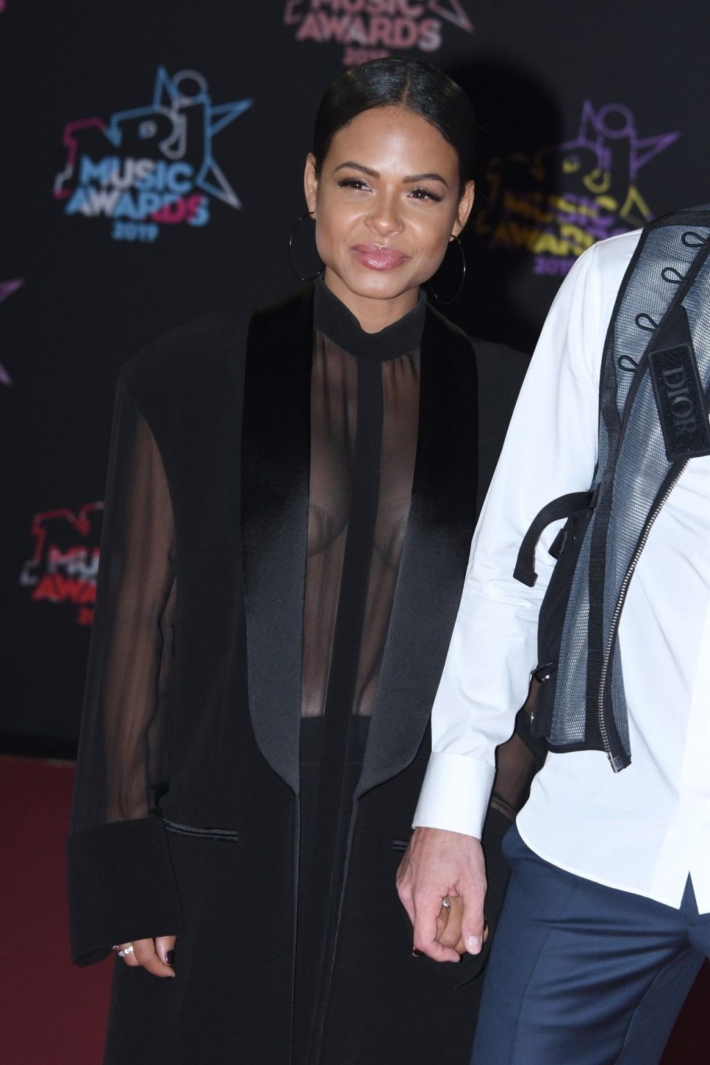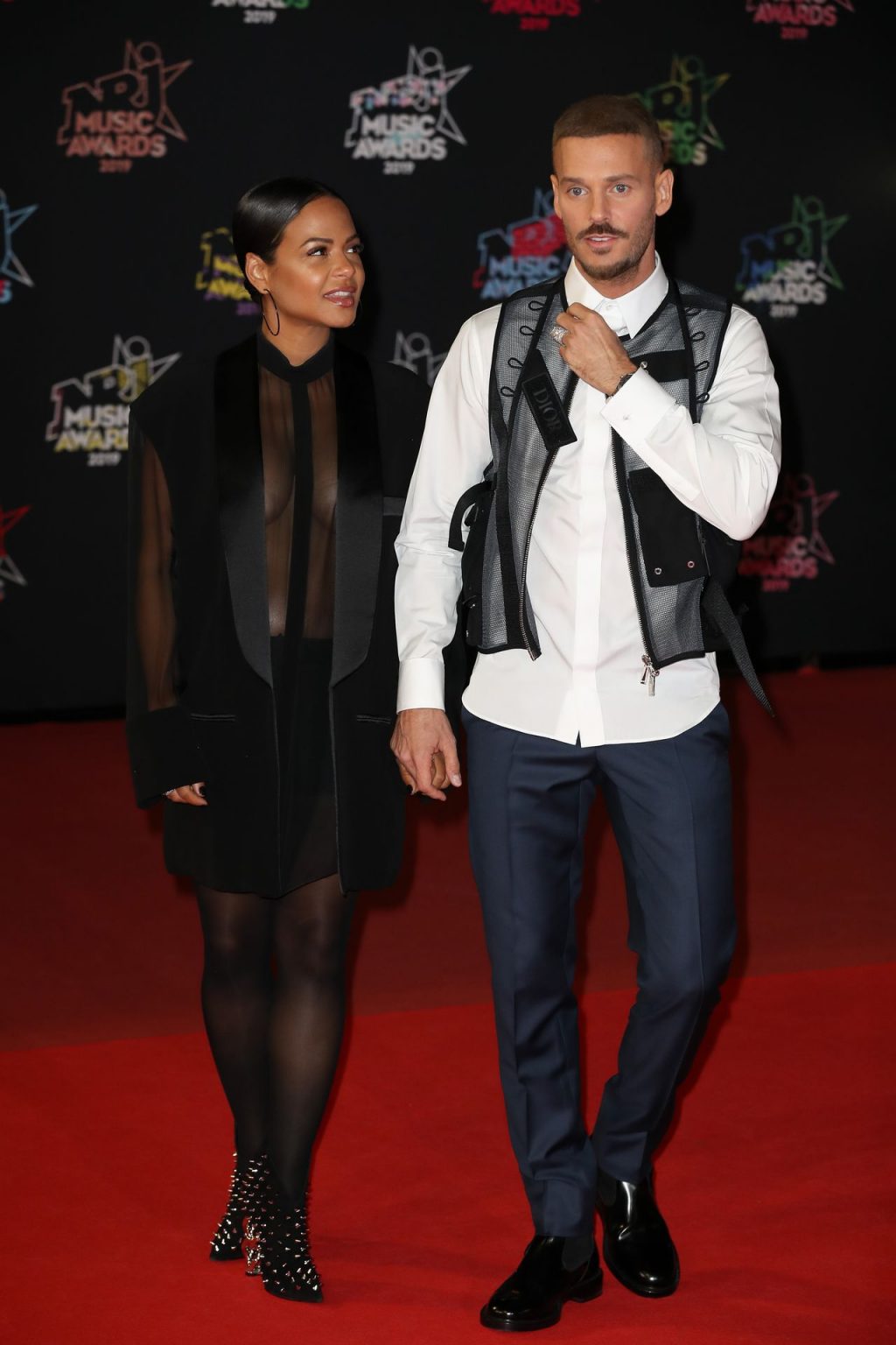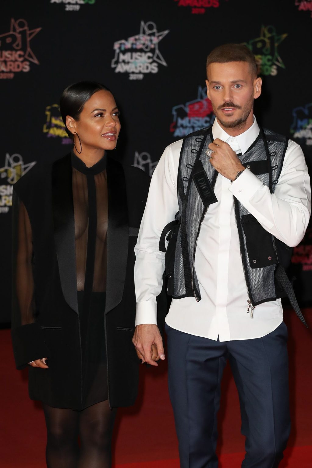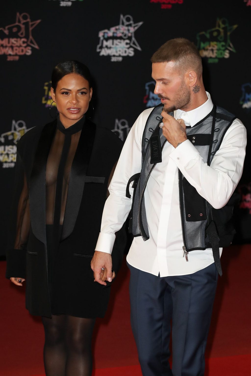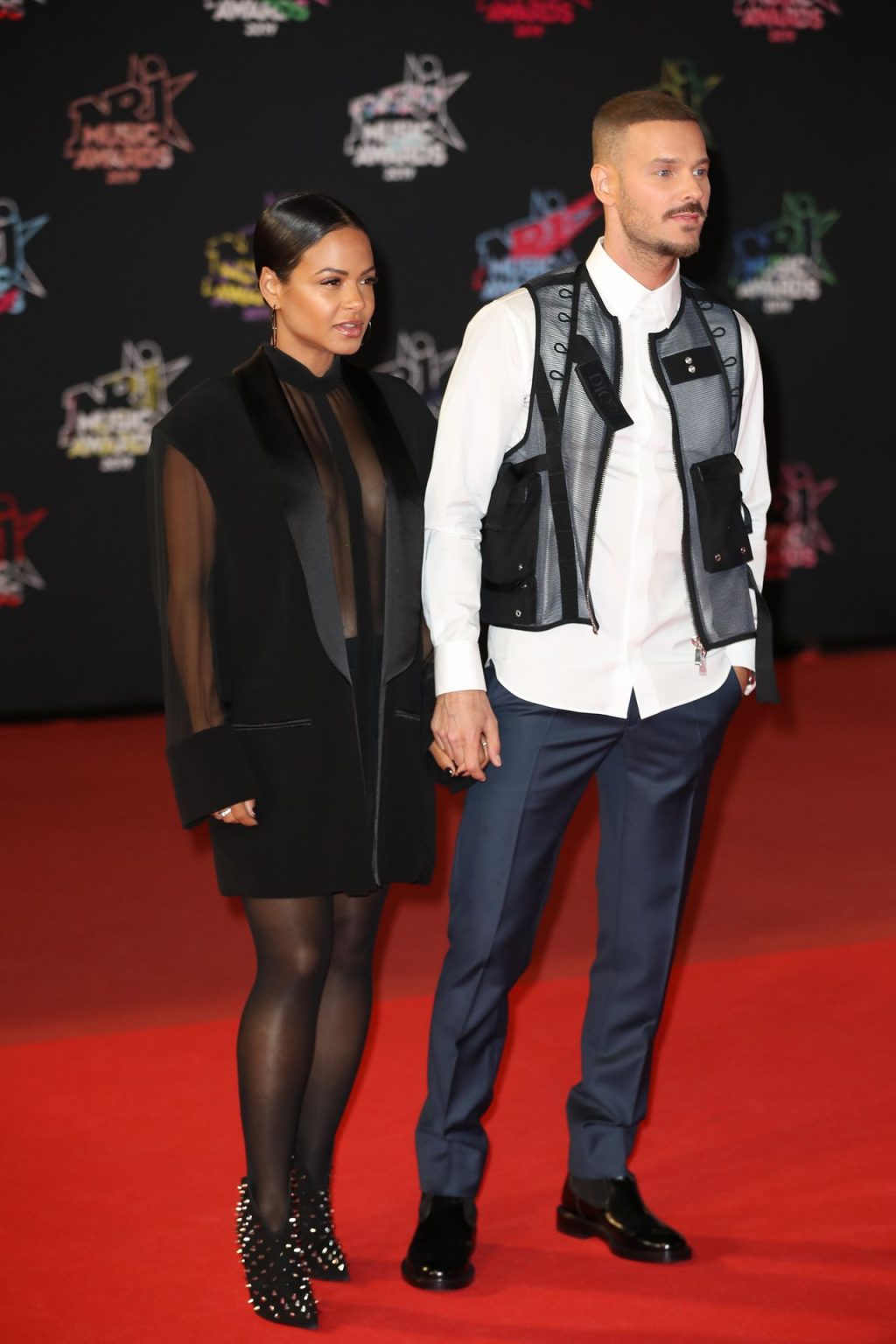 Cantante estadounidense Christina Milian y cantante francés M Pokora posan en la alfombra roja al llegar para asistir a la ceremonia de los 21º Premios NRJ Music en el Palais des Festivals en Cannes, sureste de Francia, 11/09/2019.