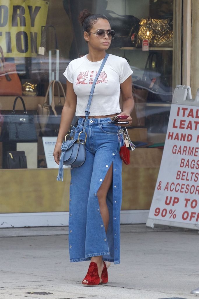 Actriz y cantante Christina Milian, 36, fue vista haciendo diligencias en West Hollywood. Lucía elegante con una camiseta blanca sin sujetador.