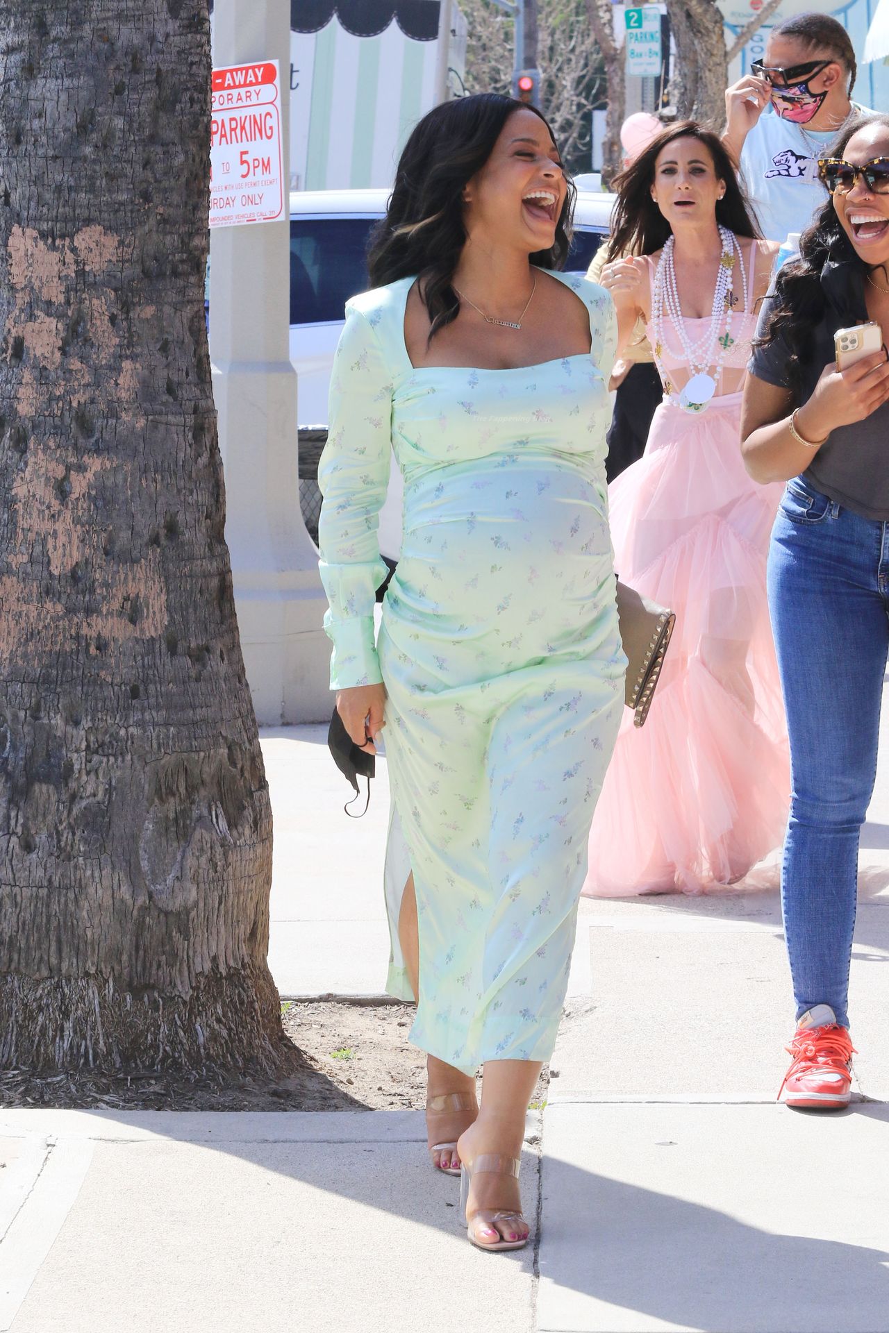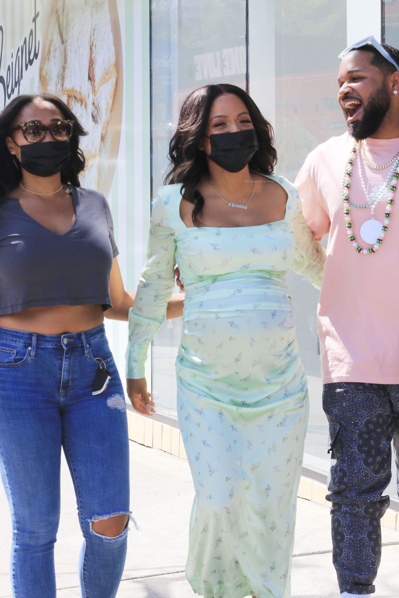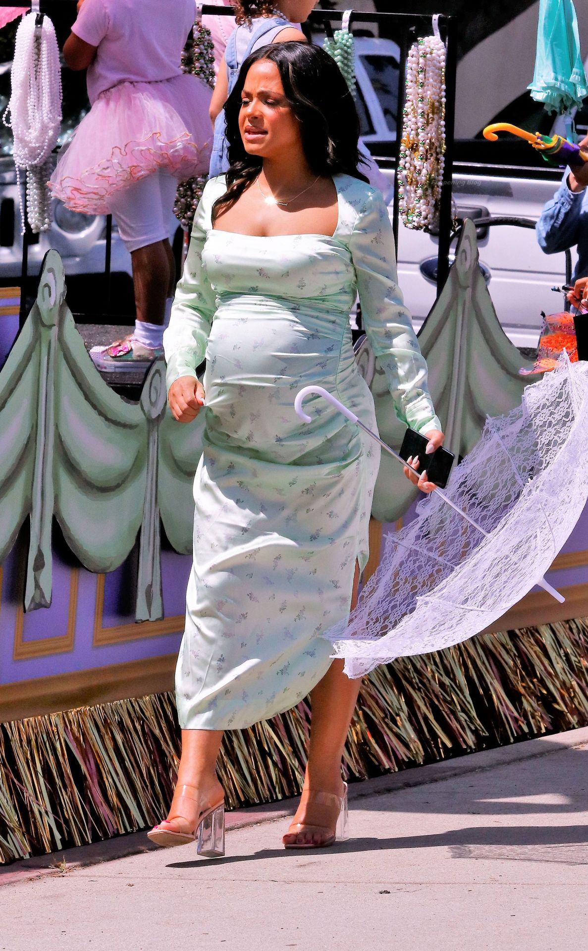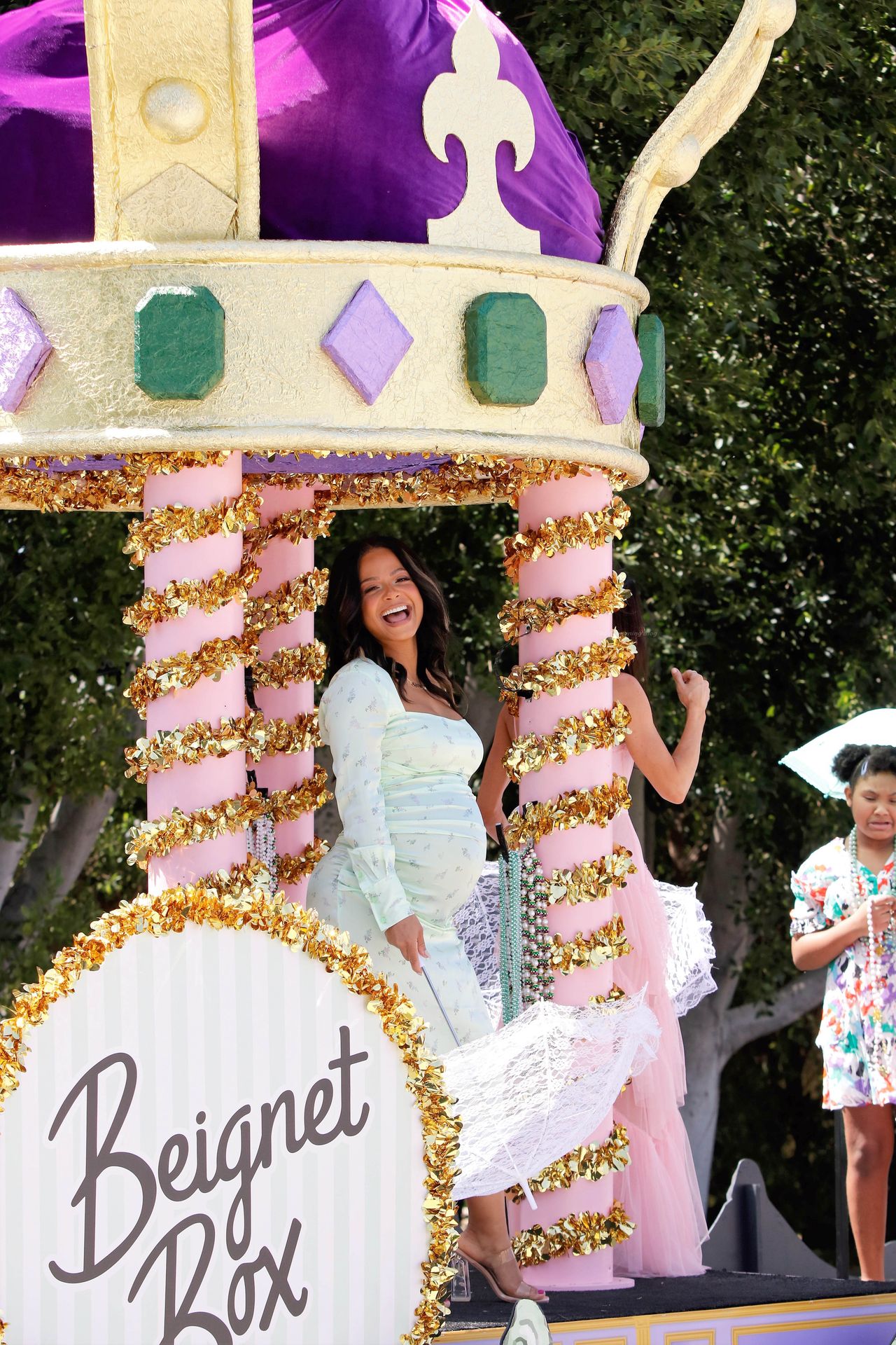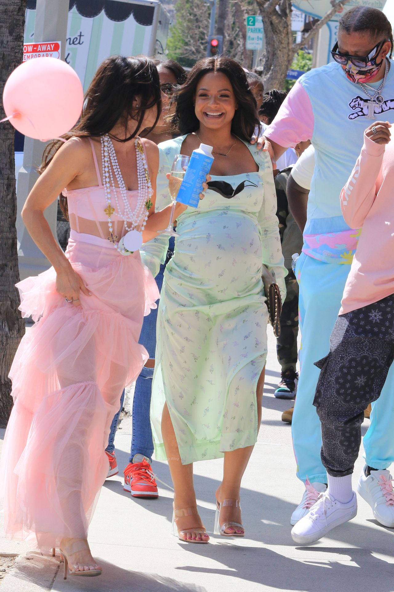 Christina Milian muestra su barriguita de embarazo antes de subirse a una carroza en un desfile en Los Ángeles, 10/04/2021.