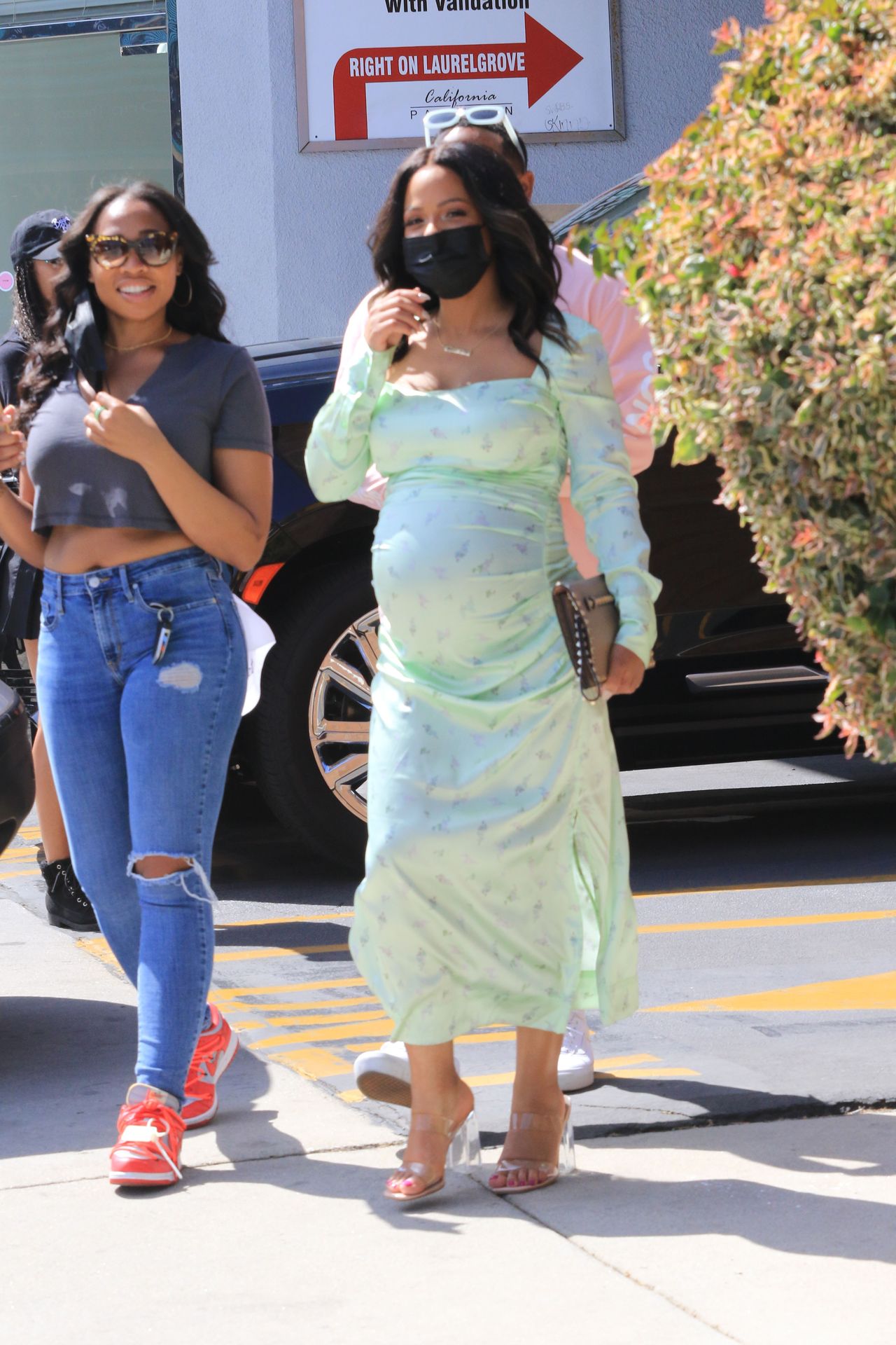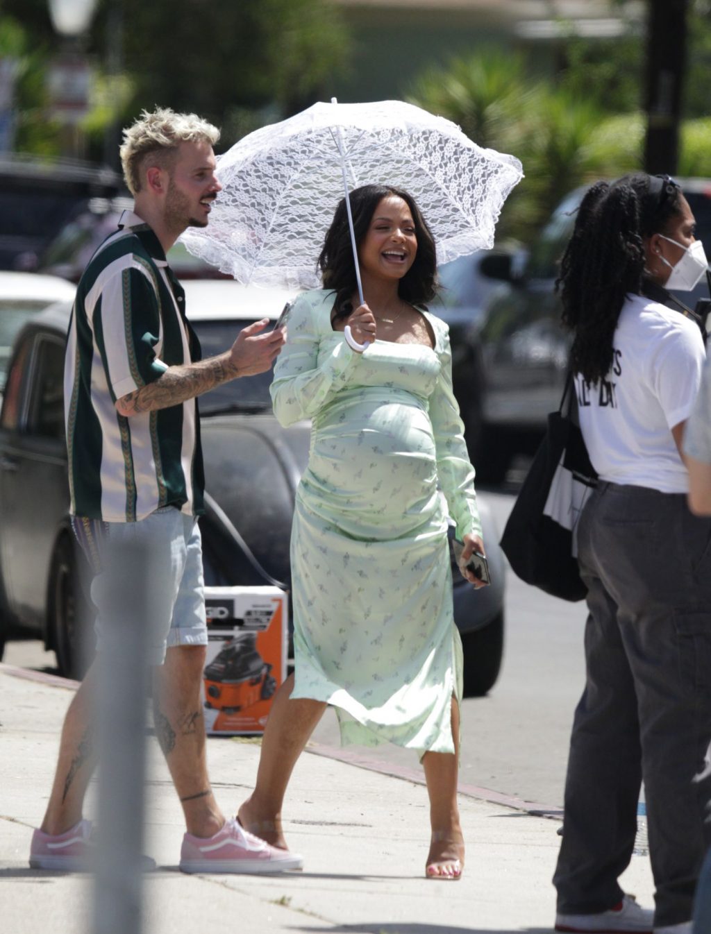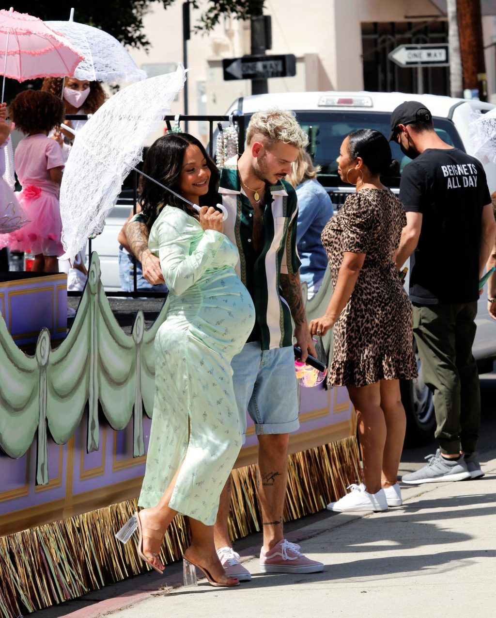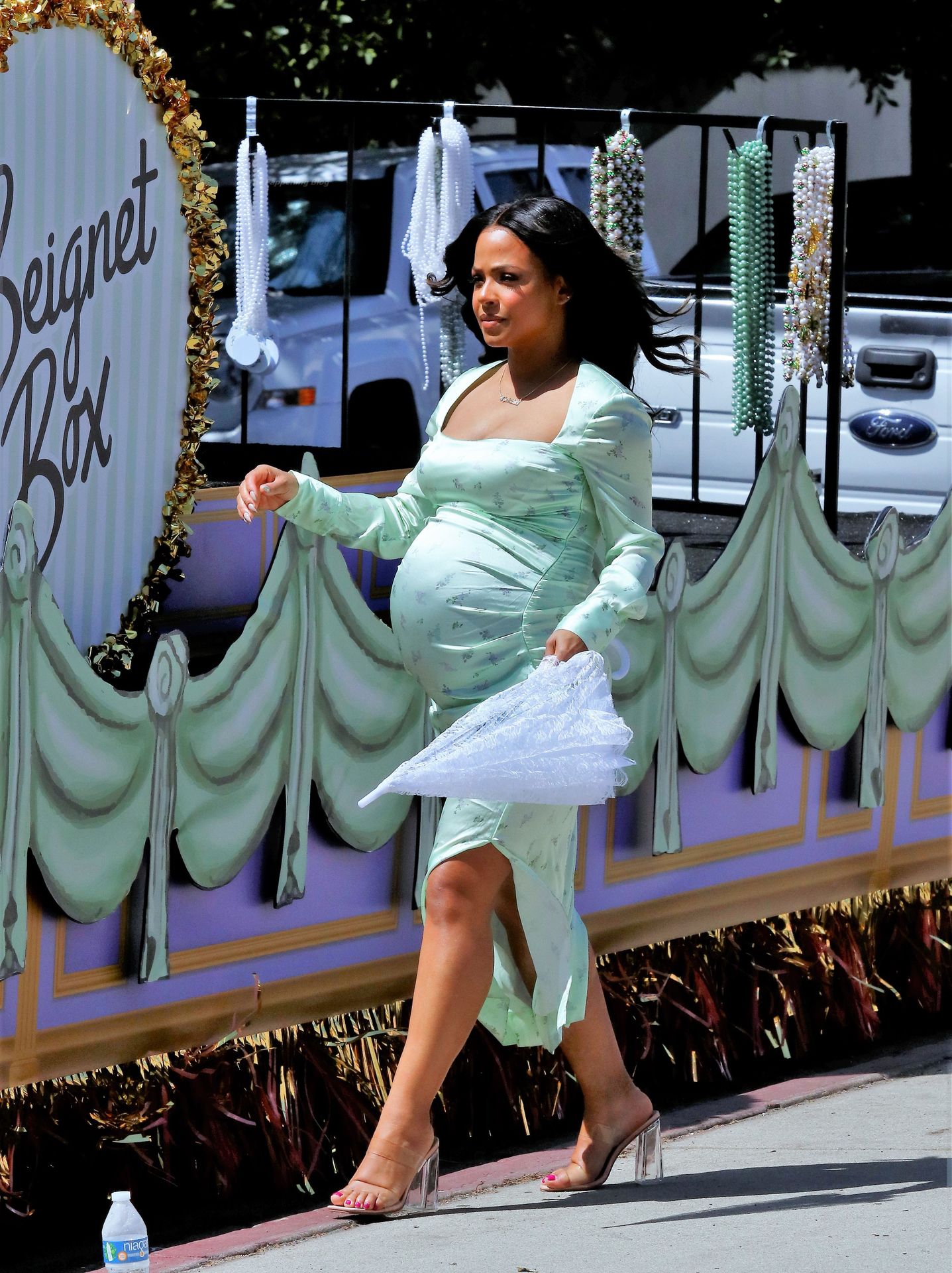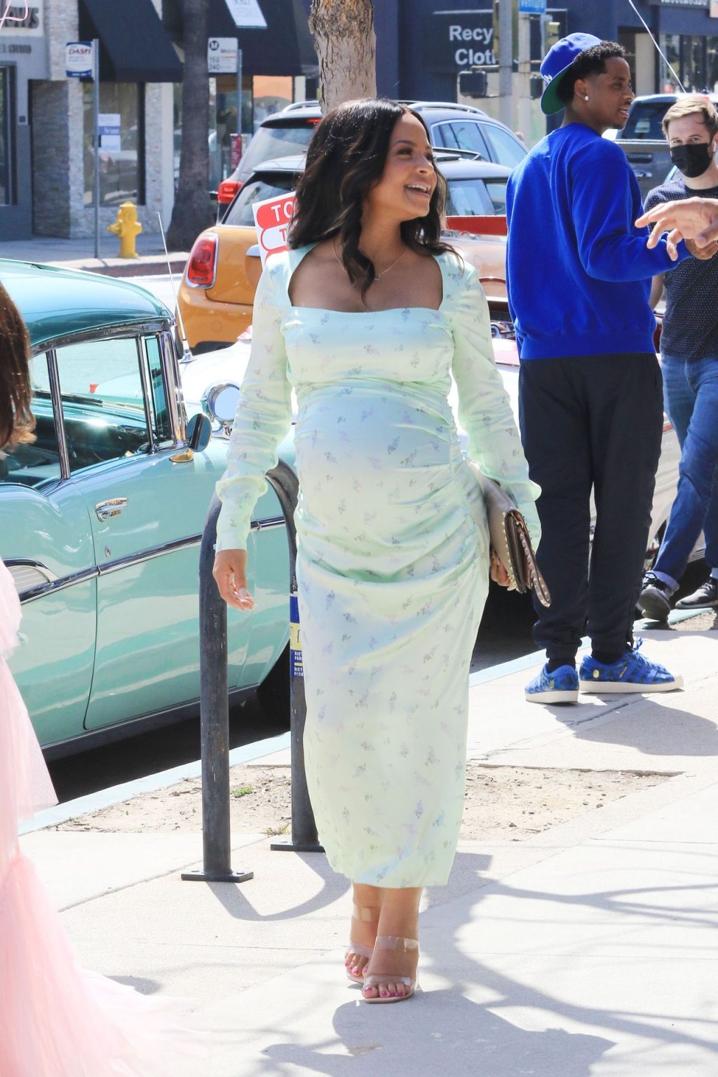 Christina Milian muestra su barriguita de embarazo antes de subirse a una carroza en un desfile en Los Ángeles, 10/04/2021.
