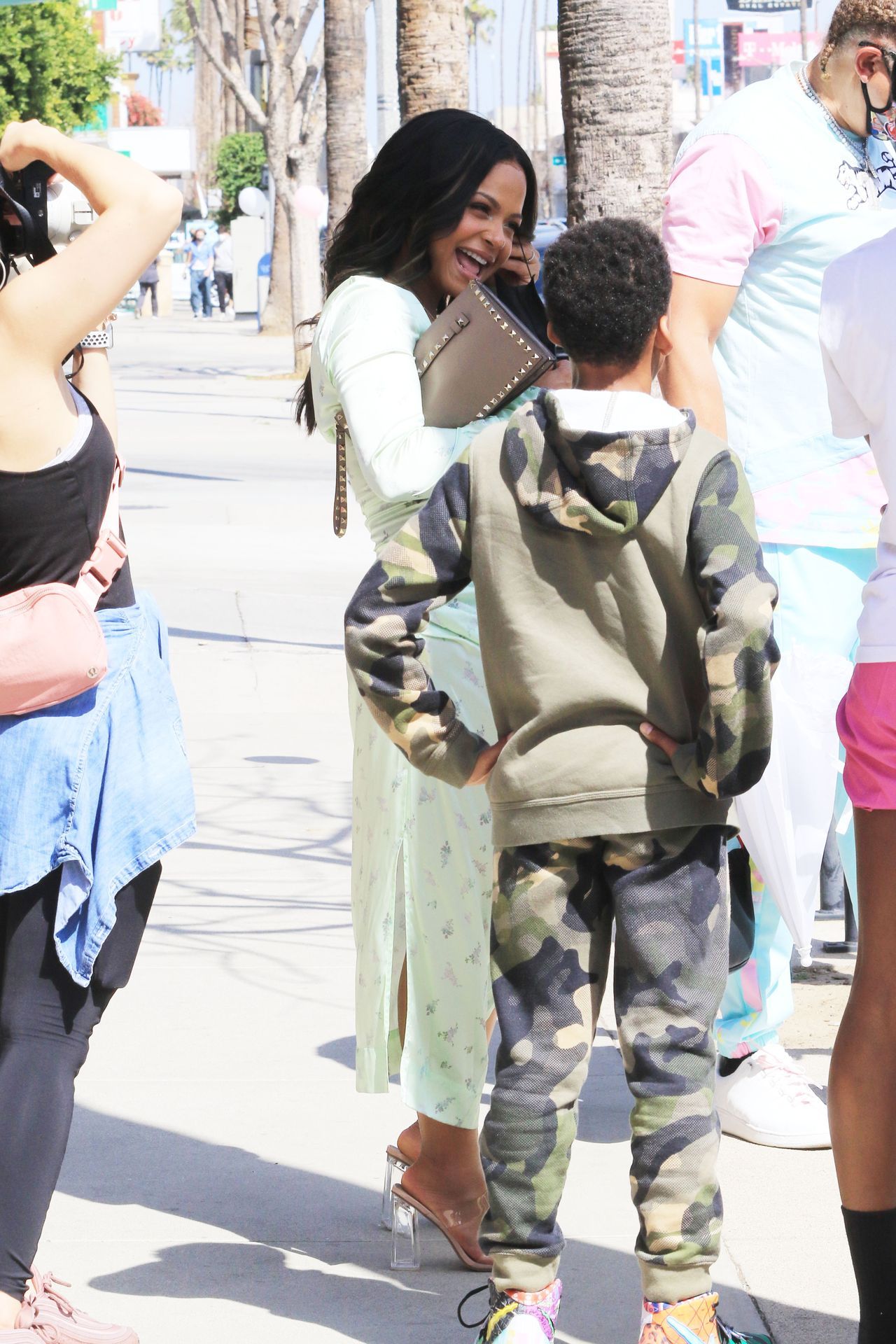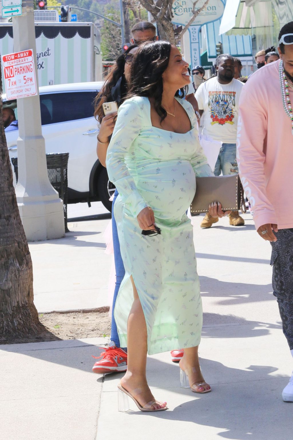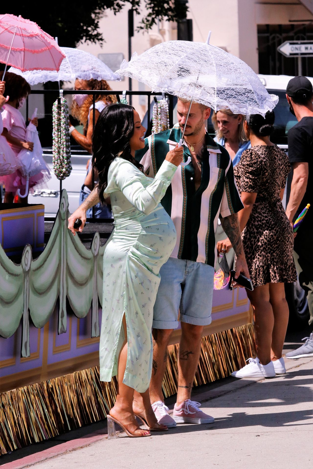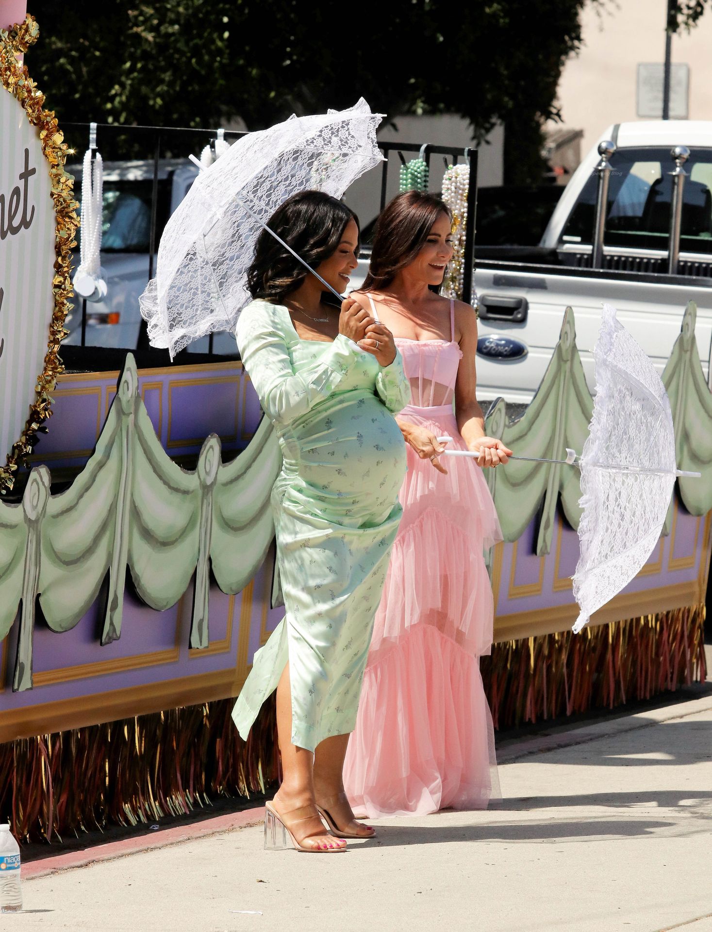 Christina Milian muestra su barriguita de embarazo antes de subirse a una carroza en un desfile en Los Ángeles, 10/04/2021.