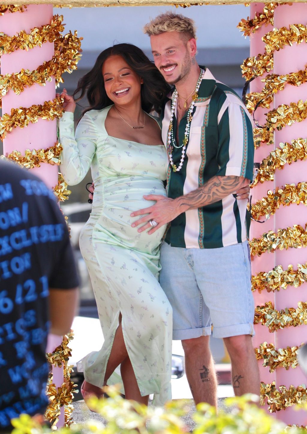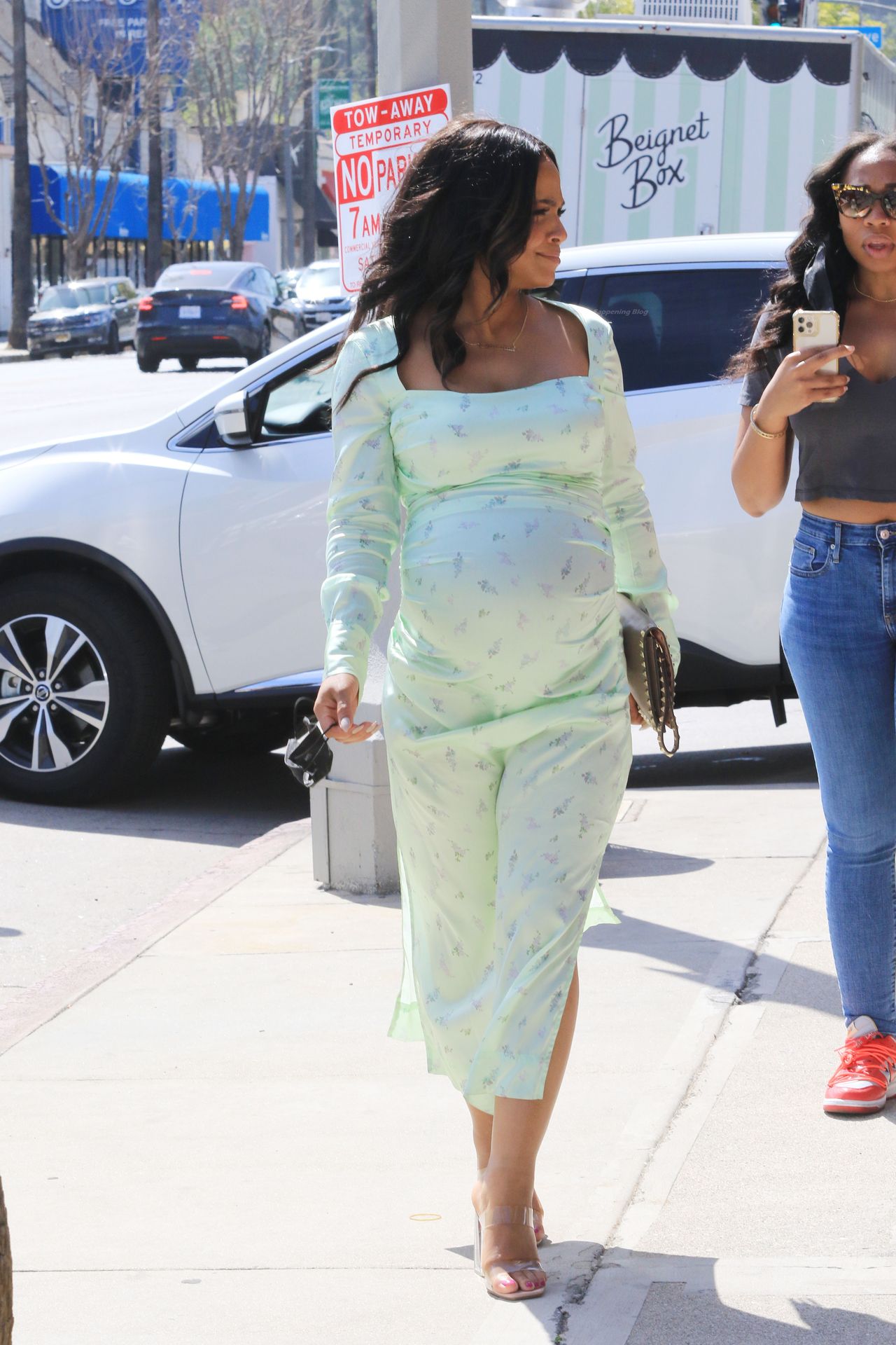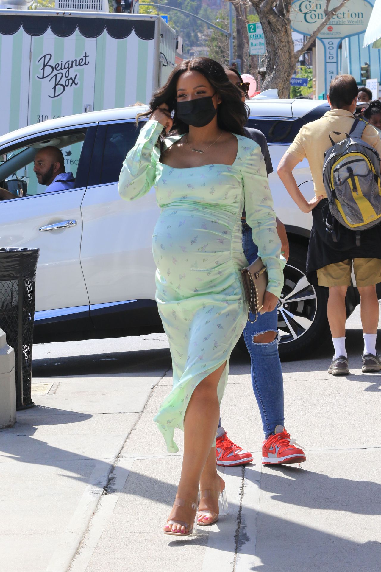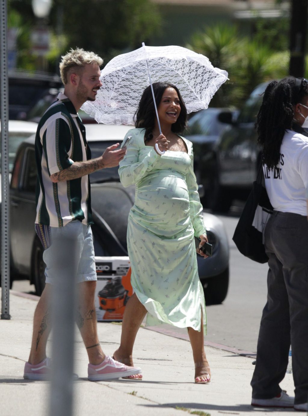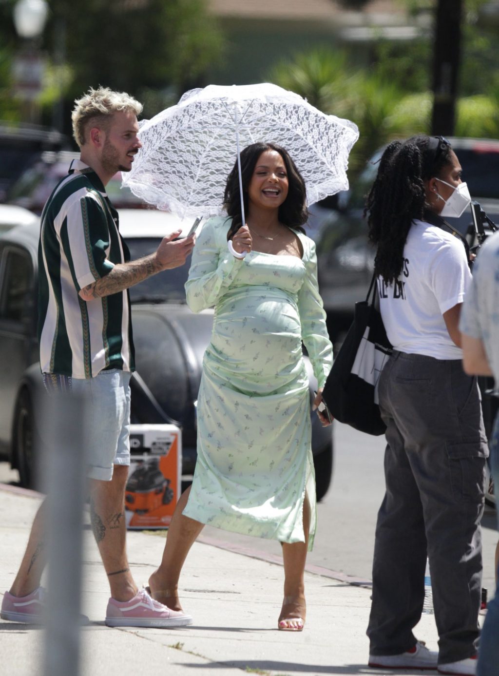 Christina Milian muestra su barriguita de embarazo antes de subirse a una carroza en un desfile en Los Ángeles, 10/04/2021.