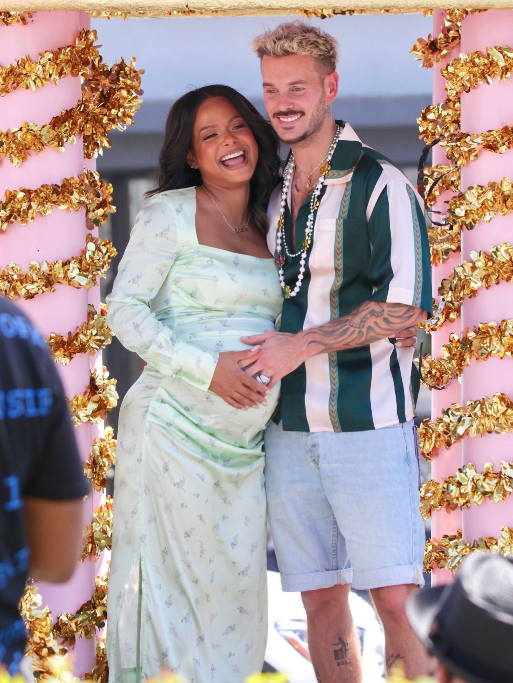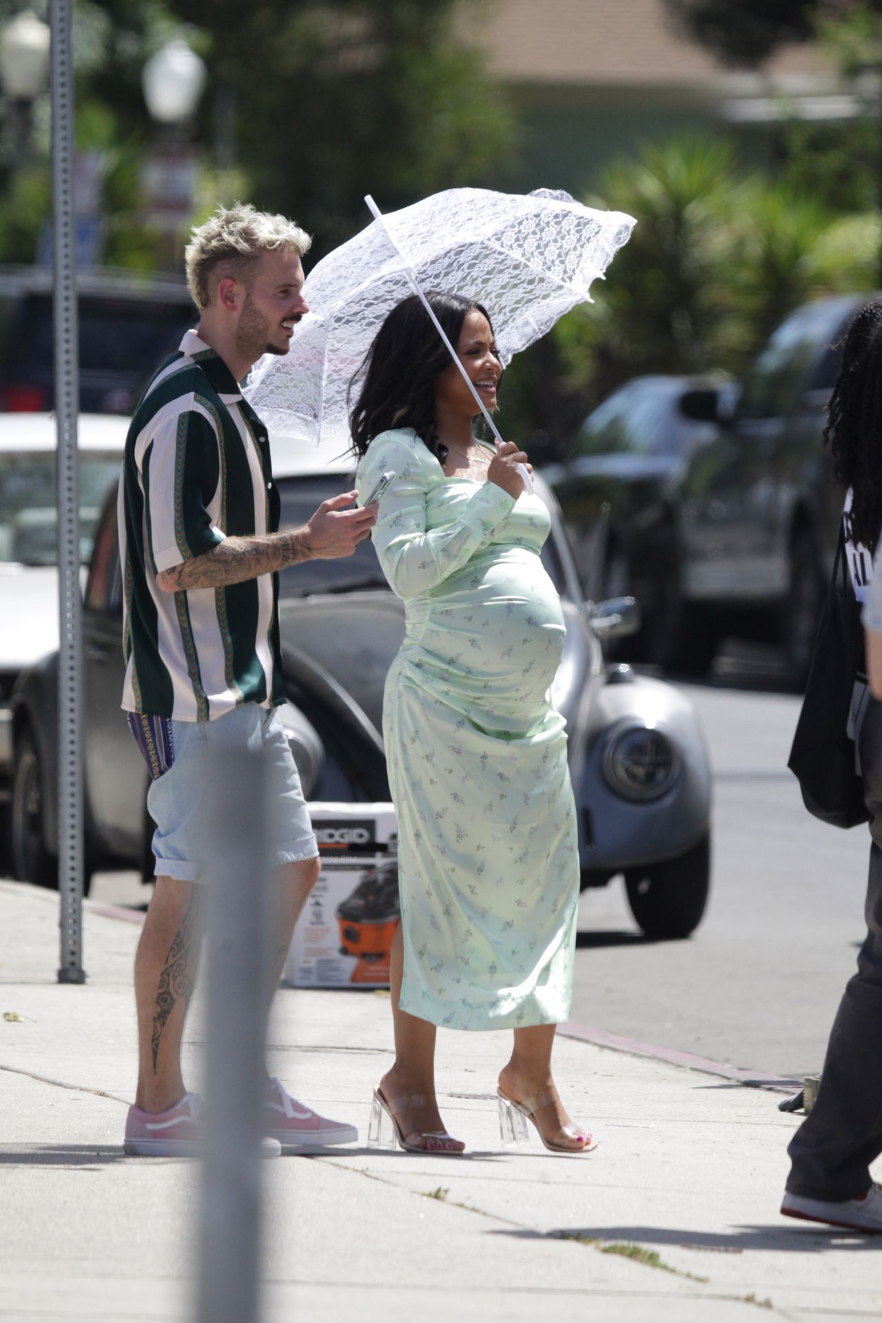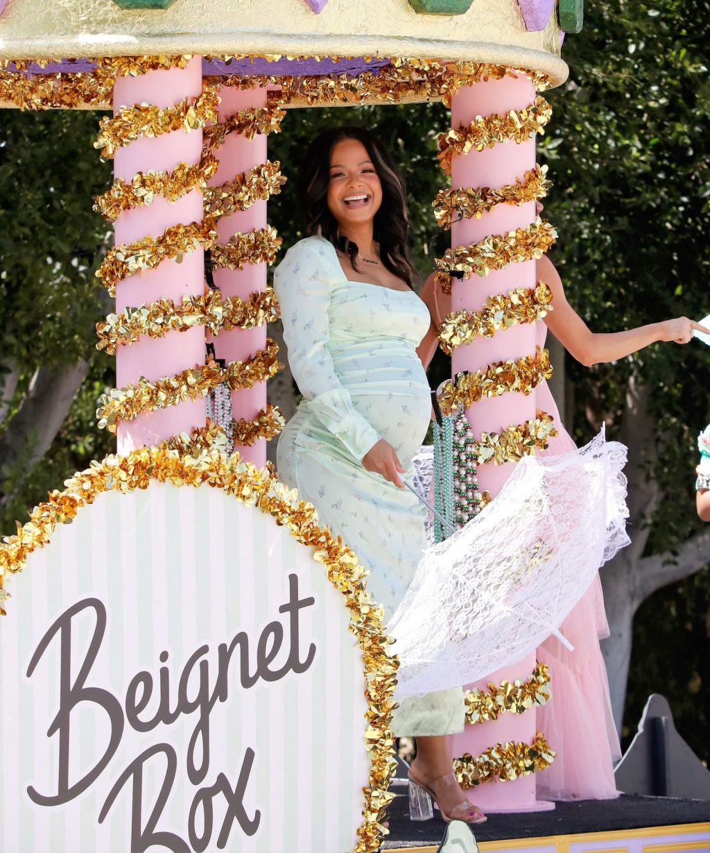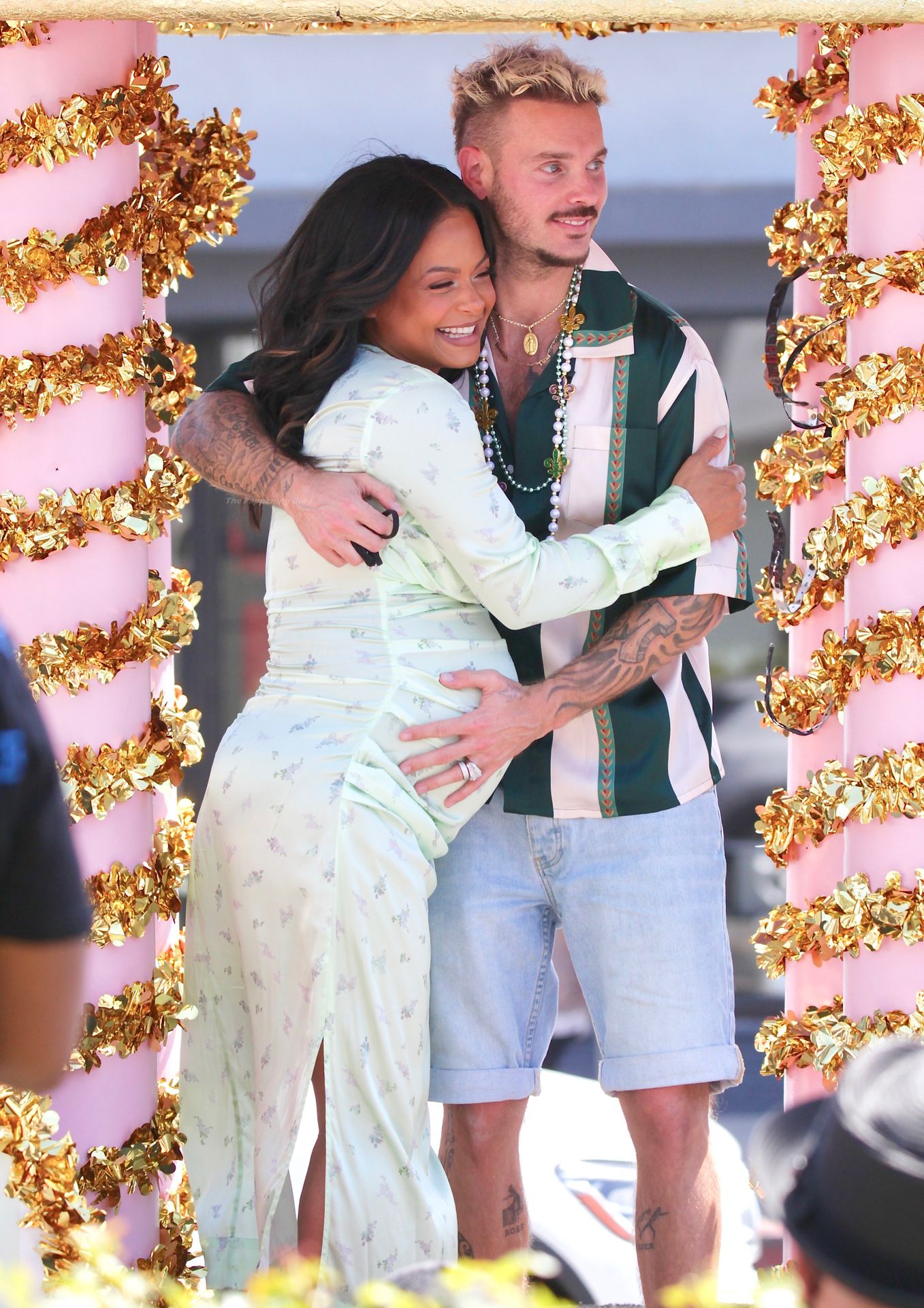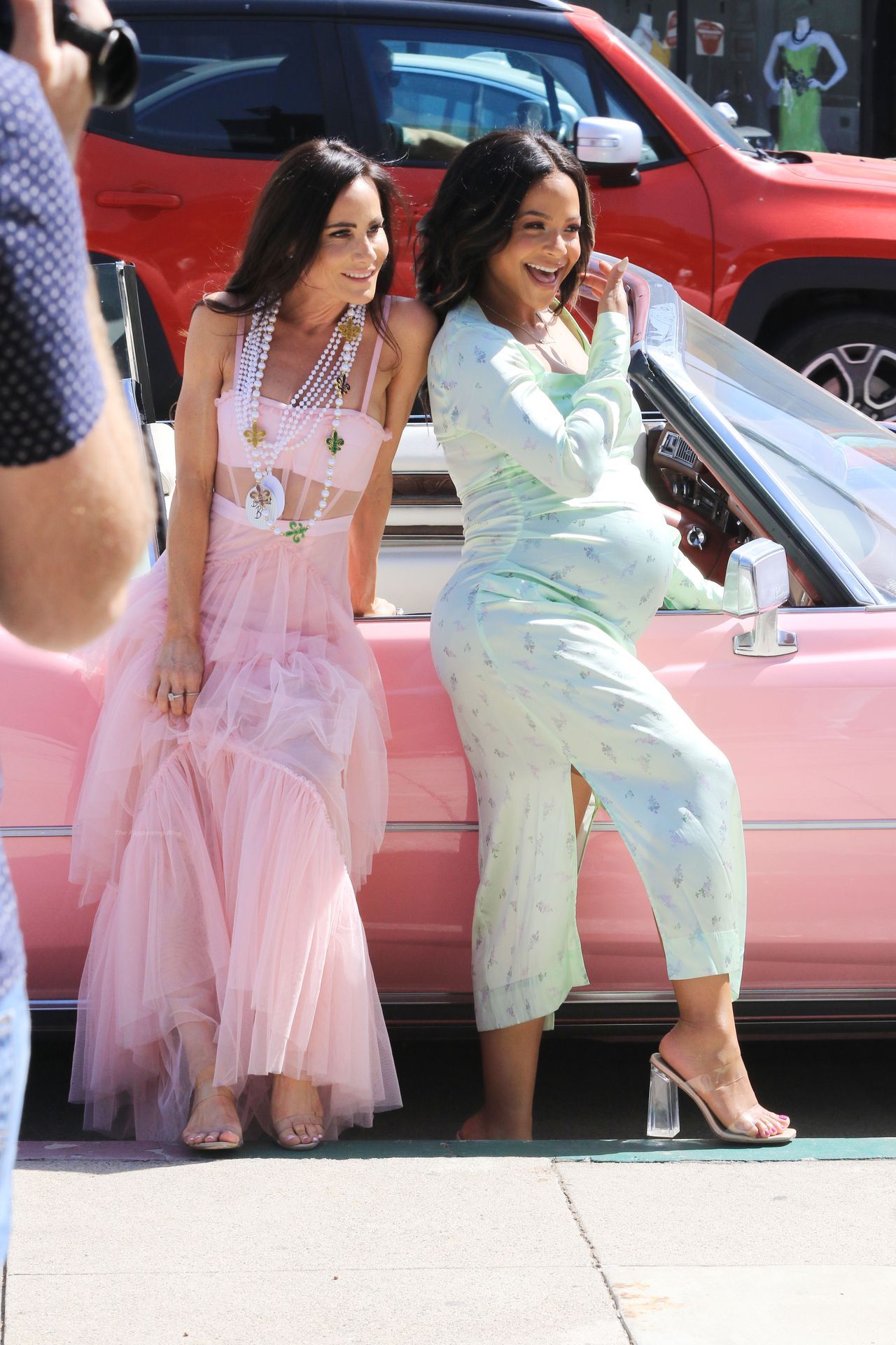 Christina Milian muestra su barriguita de embarazo antes de subirse a una carroza en un desfile en Los Ángeles, 10/04/2021.