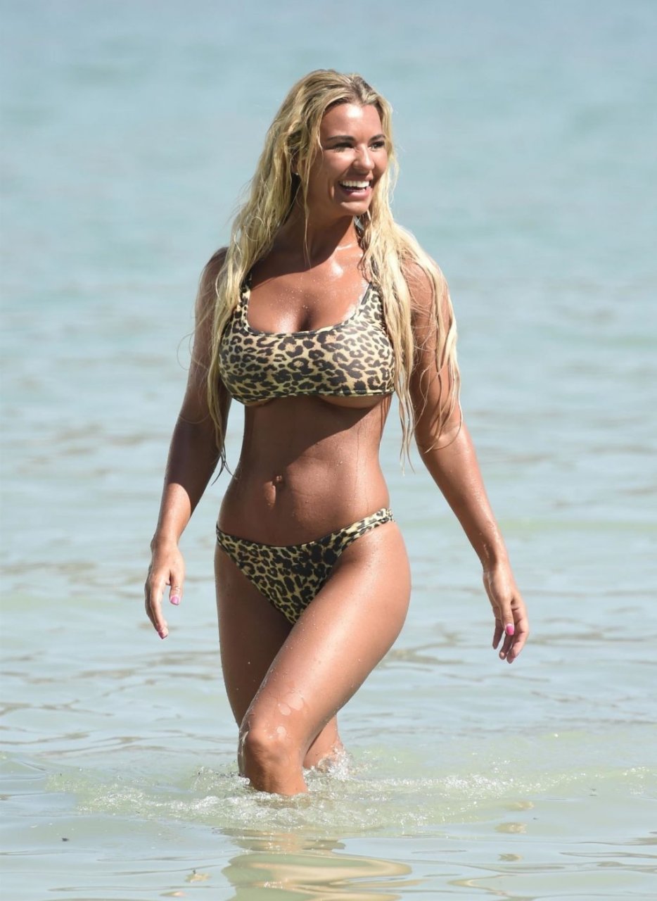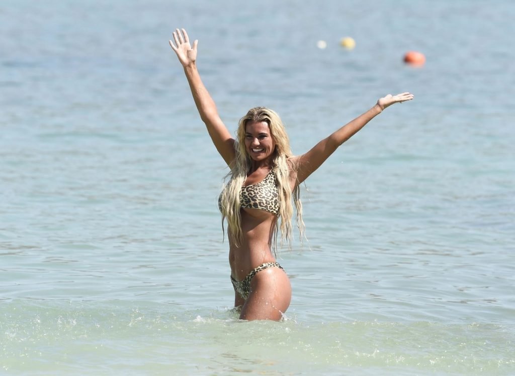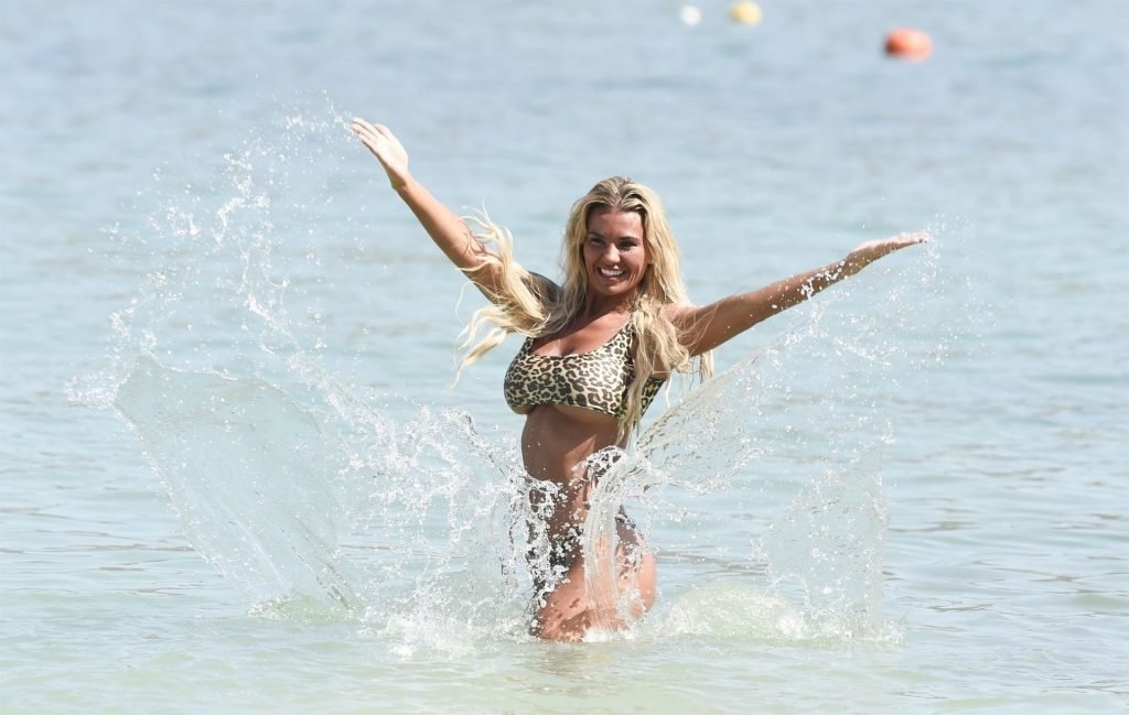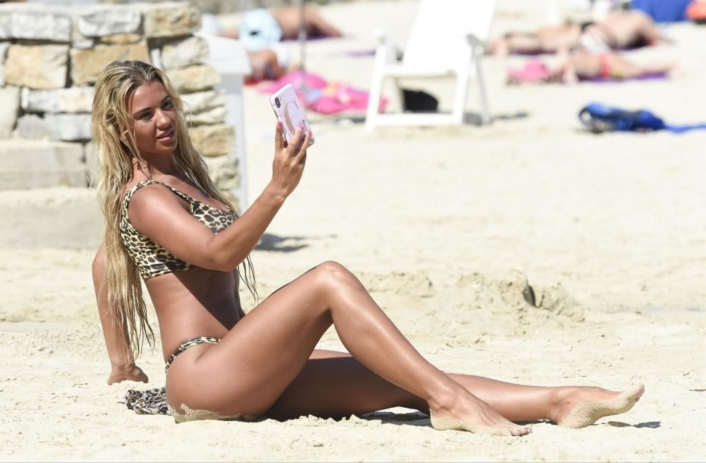 La estrella de “Real Housewives of Cheshire”, la sexy Christine McGuinness, lleva su atrevido bikini de estampado de leopardo bajo el sol de España, 22/08/2019.