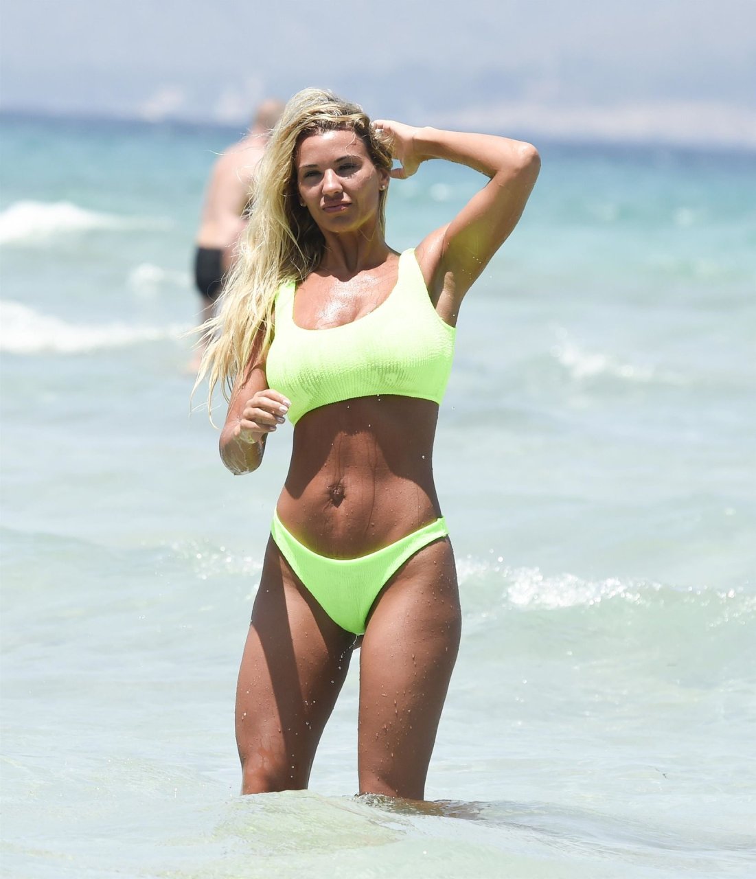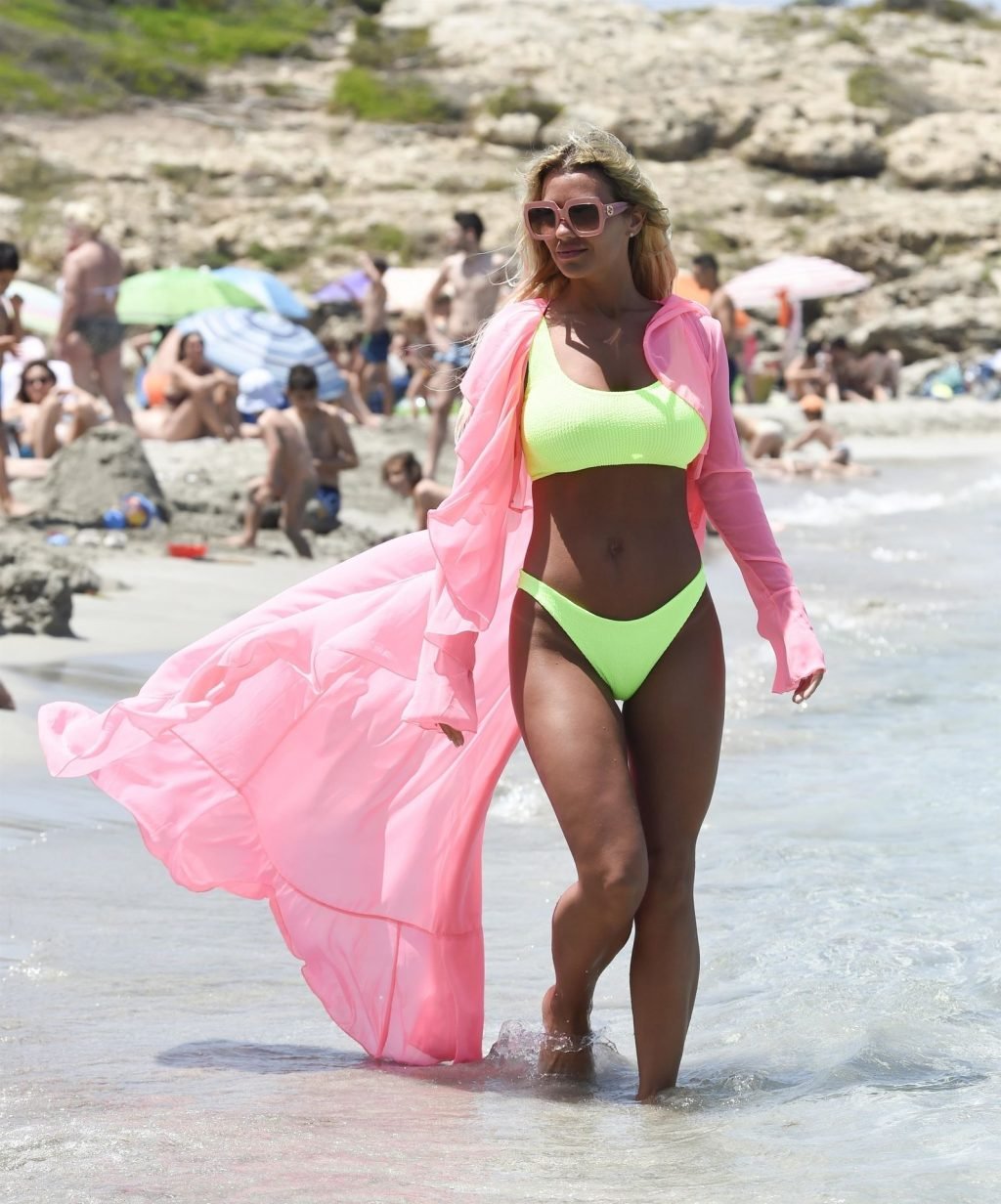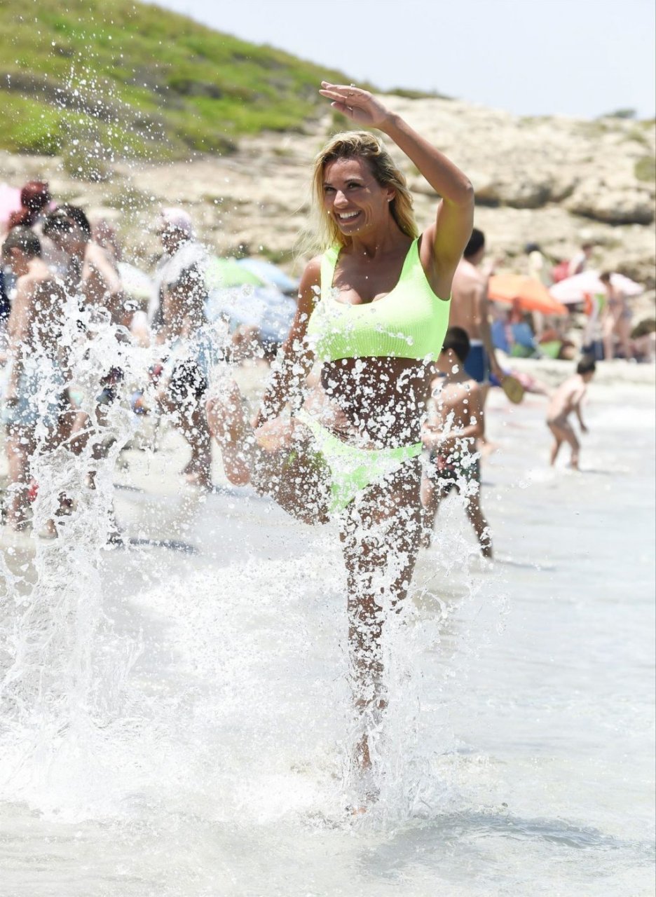 “Estrella de “Real Housewife of Cheshire” y esposa de Paddy McGuinness, Christine McGuinness disfrutó de un baño en el mar mostrando sus curvas sensacionales, 07/02/2019. Christine deslumbró bajo el intenso sol español y se refrescó haciendo salpicaduras con su bikini verde lima llamativo mientras estaba de vacaciones en España.