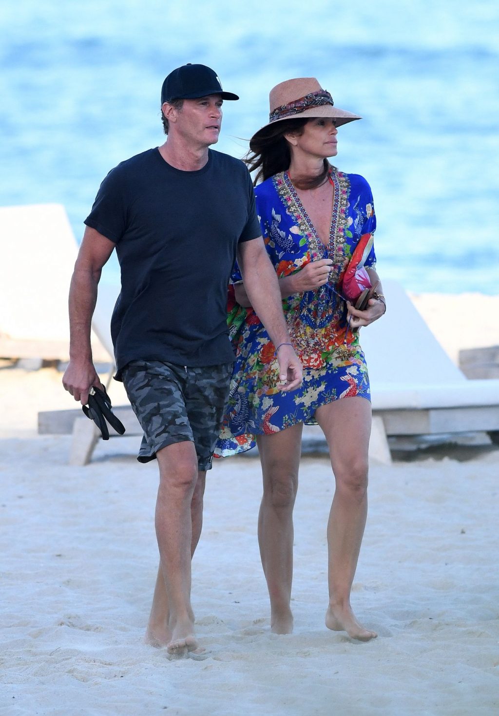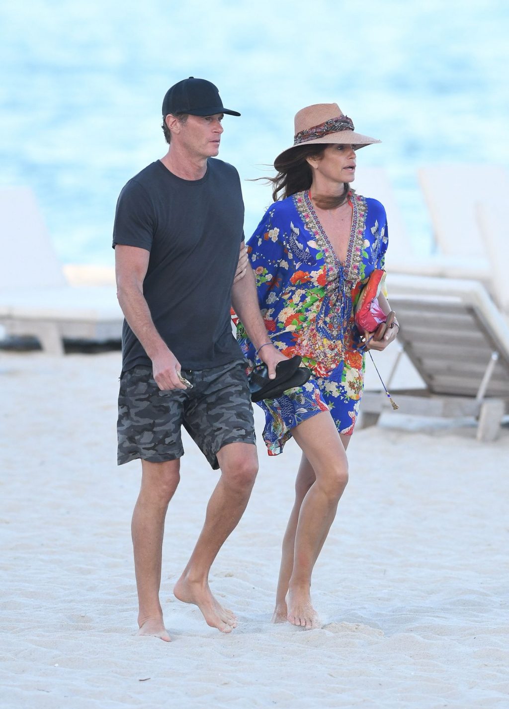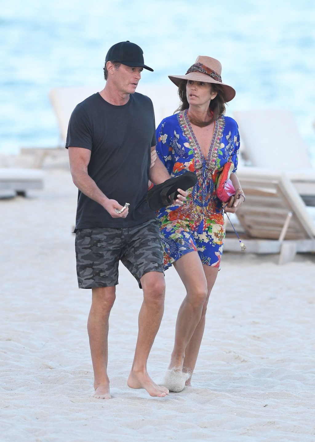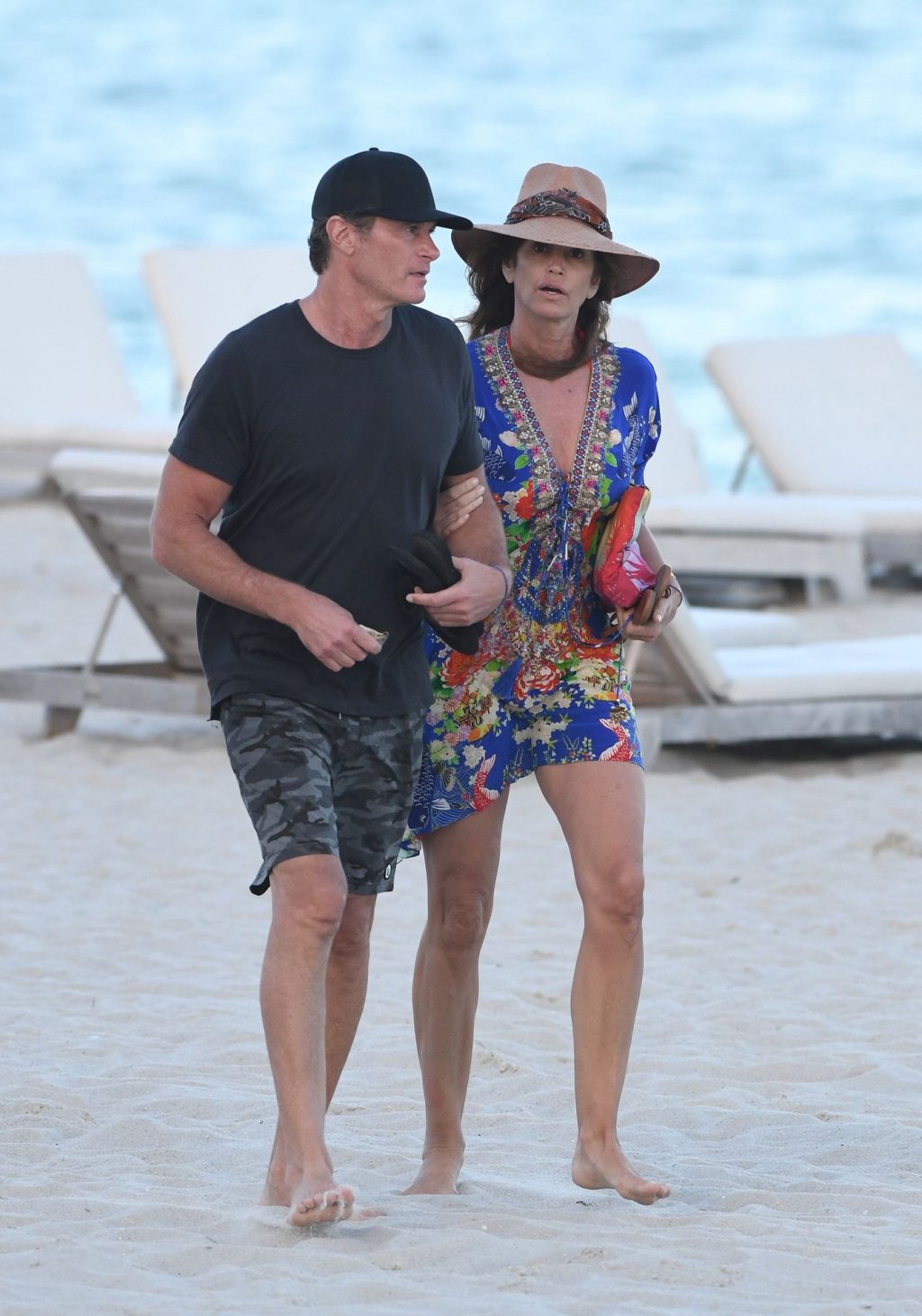 La esbelta supermodelo estadounidense Cindy Crawford (53) y su esposo Rande Gerber se relajan en la playa de Miami, 01/03/2020.