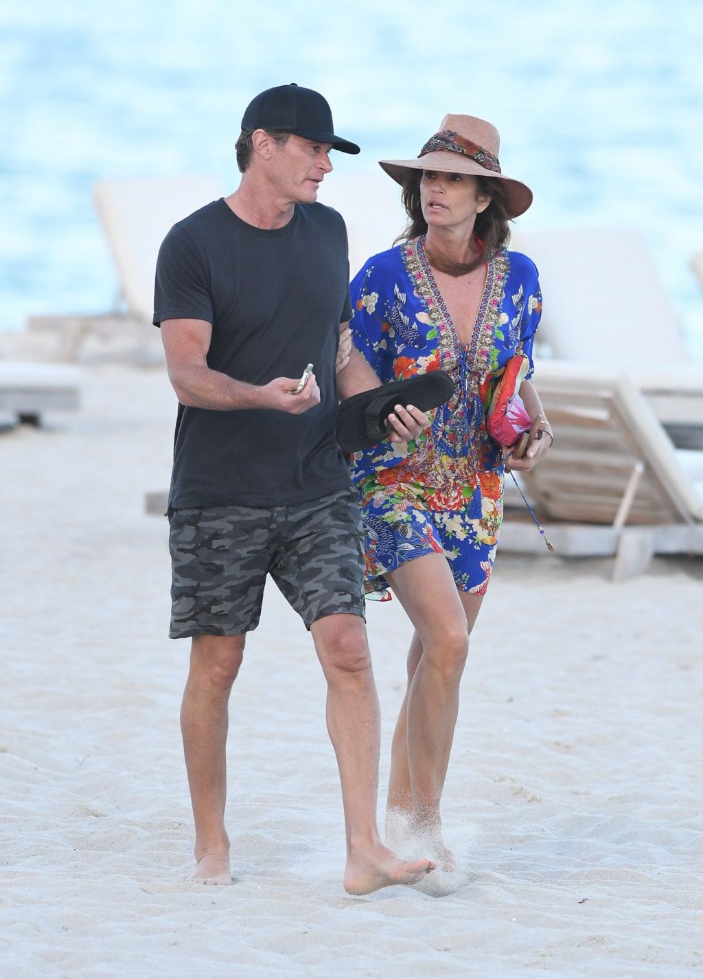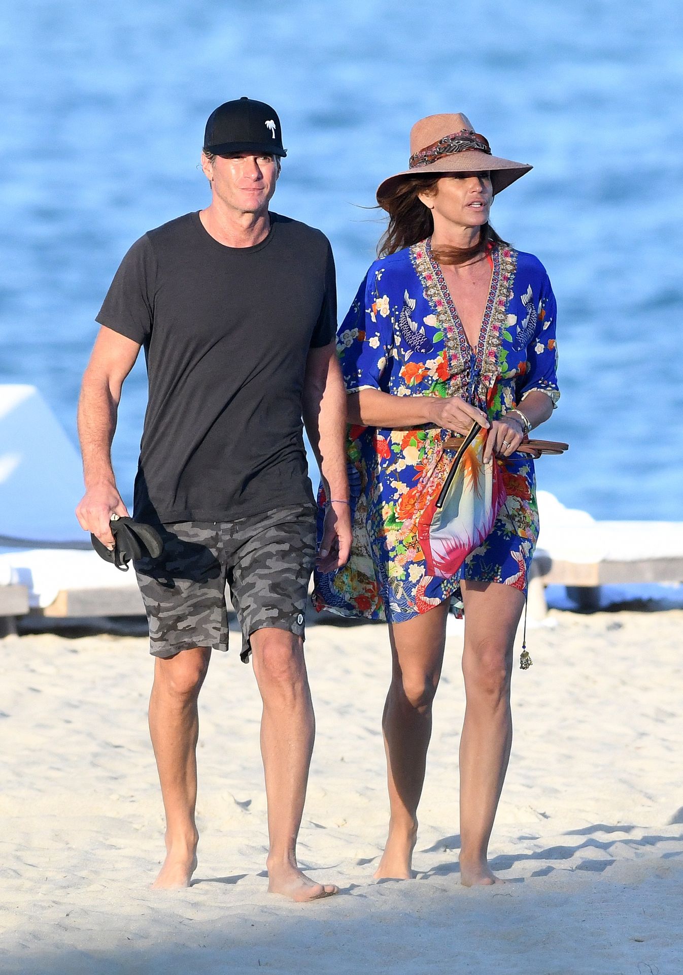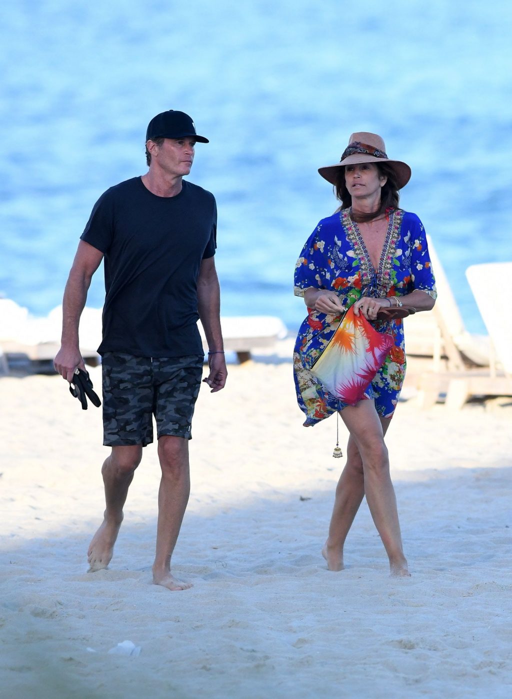 La esbelta supermodelo estadounidense Cindy Crawford (53) y su esposo Rande Gerber se relajan en la playa de Miami, 01/03/2020.