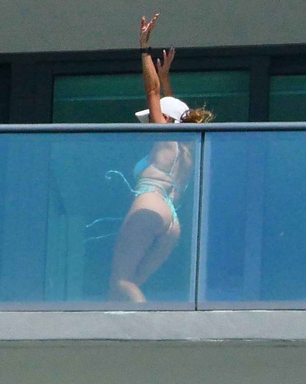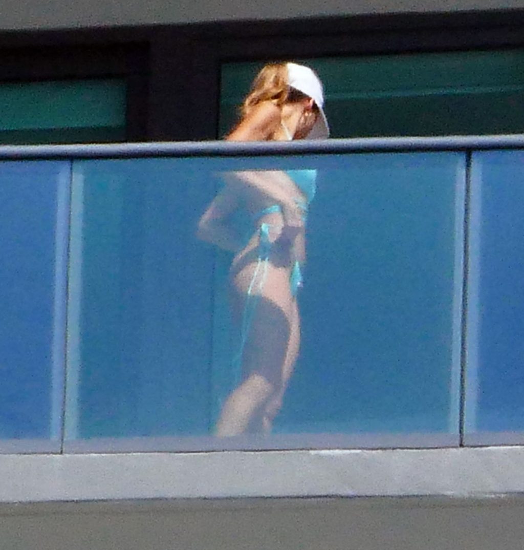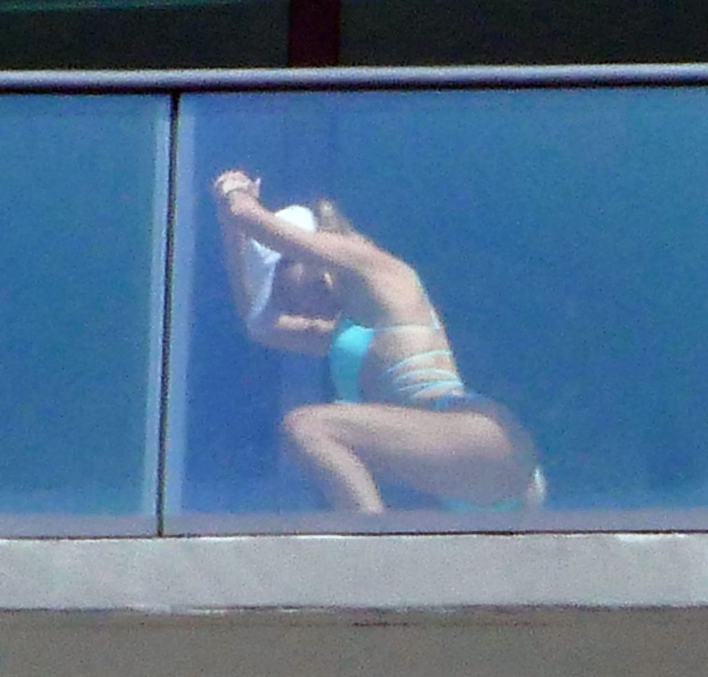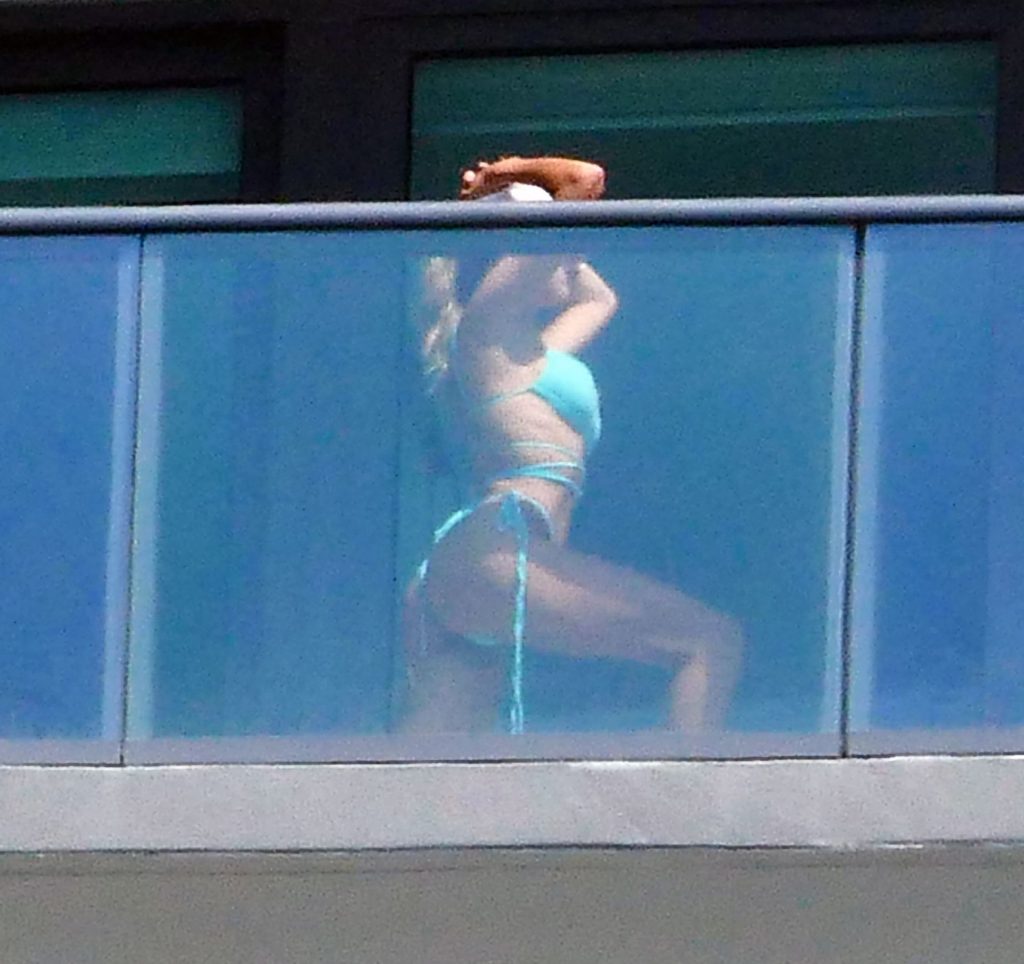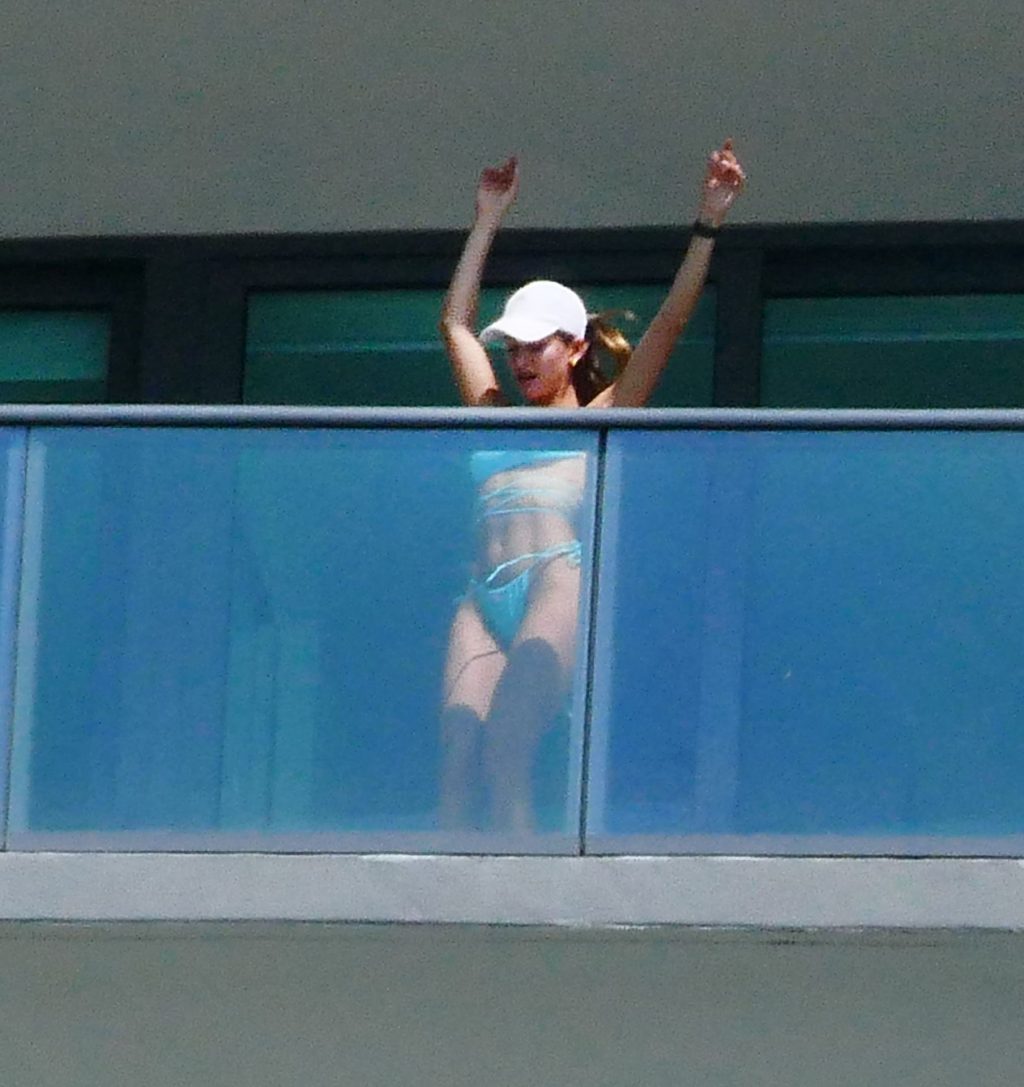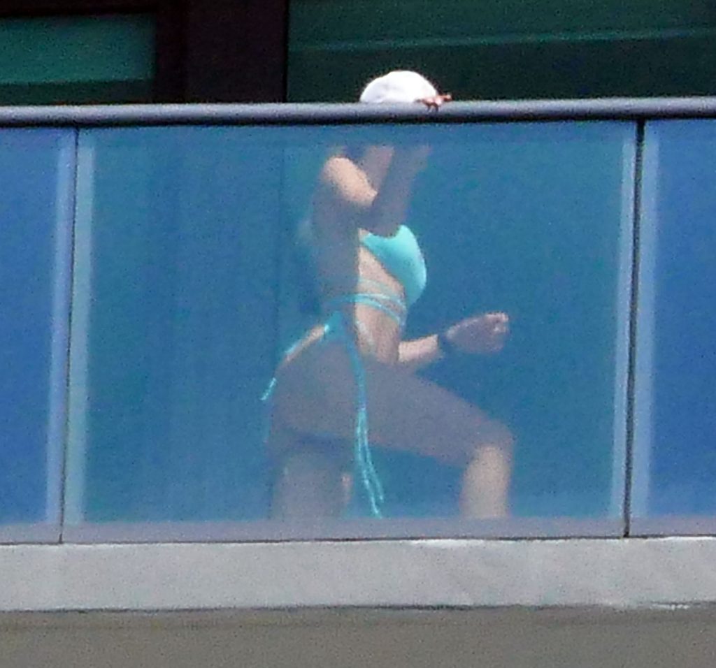 La modelo cubano-británica Cindy Prado presume sus curvas mientras lleva un pequeño bikini azul y hace ejercicio en un balcón durante el día mientras la pandemia del Coronavirus continúa en Miami, 15/04/2020.
