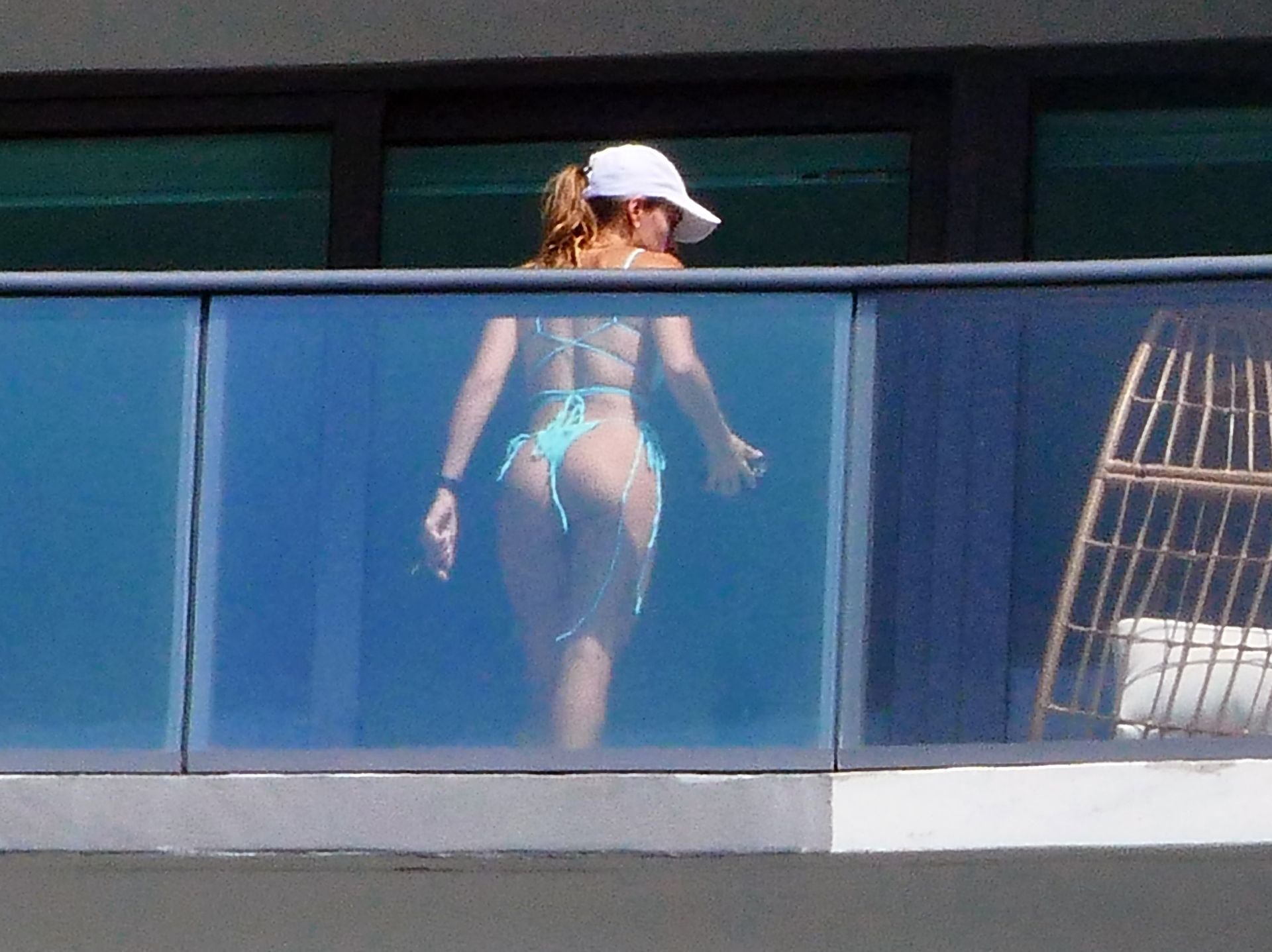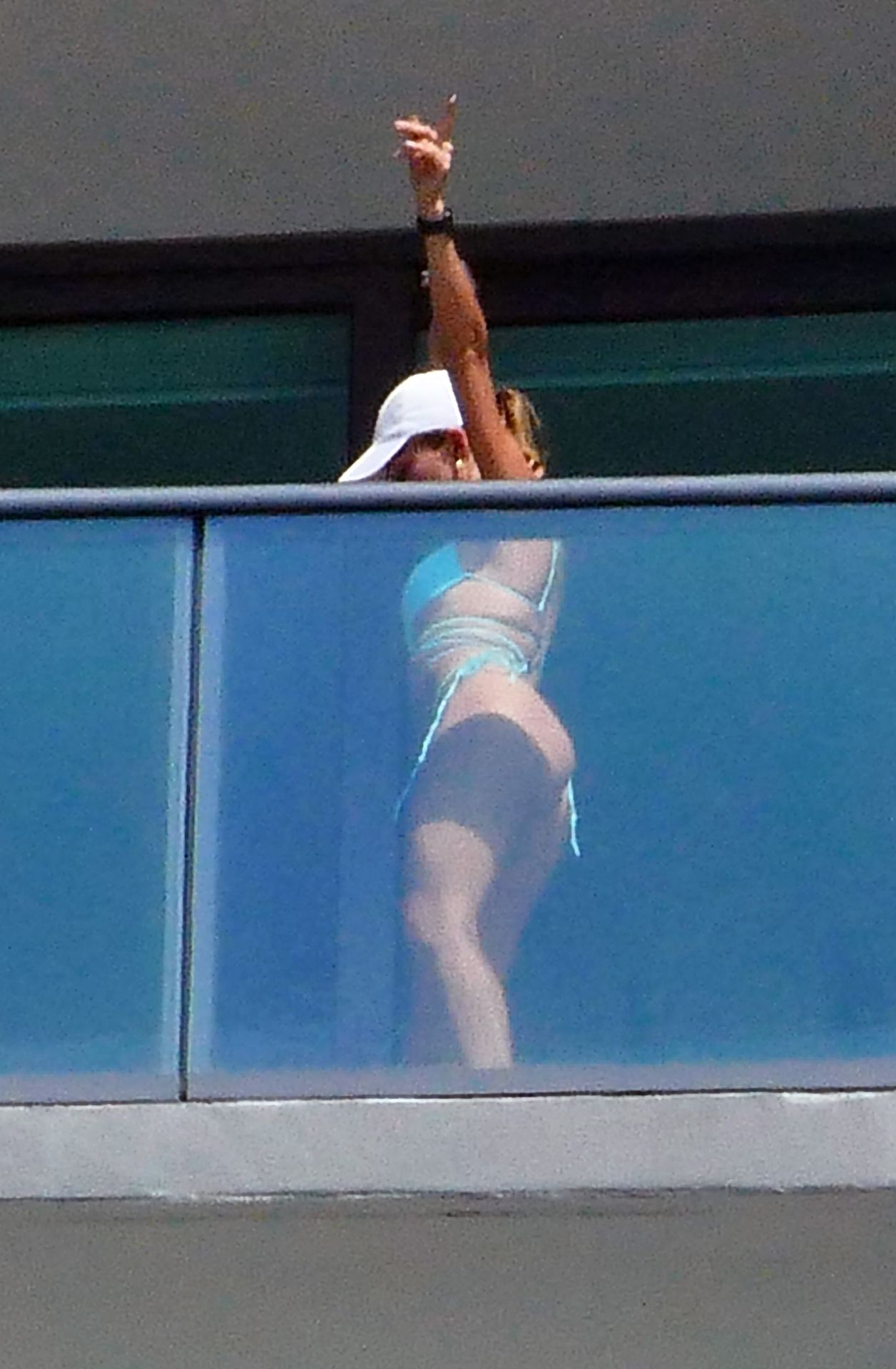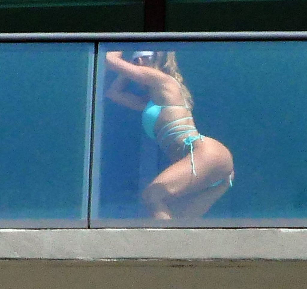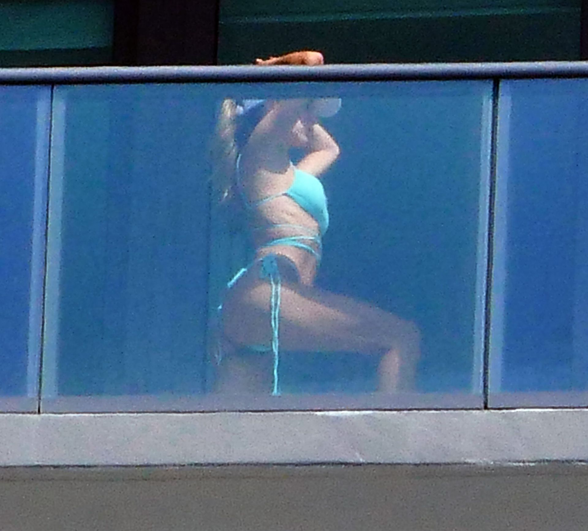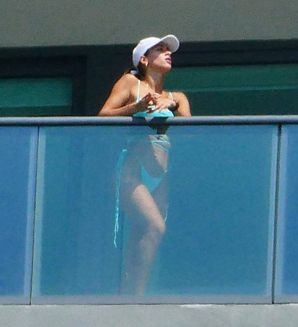La modelo cubano-británica Cindy Prado presume sus curvas mientras lleva un pequeño bikini azul y hace ejercicio en un balcón durante el día mientras la pandemia del Coronavirus continúa en Miami, 15/04/2020.