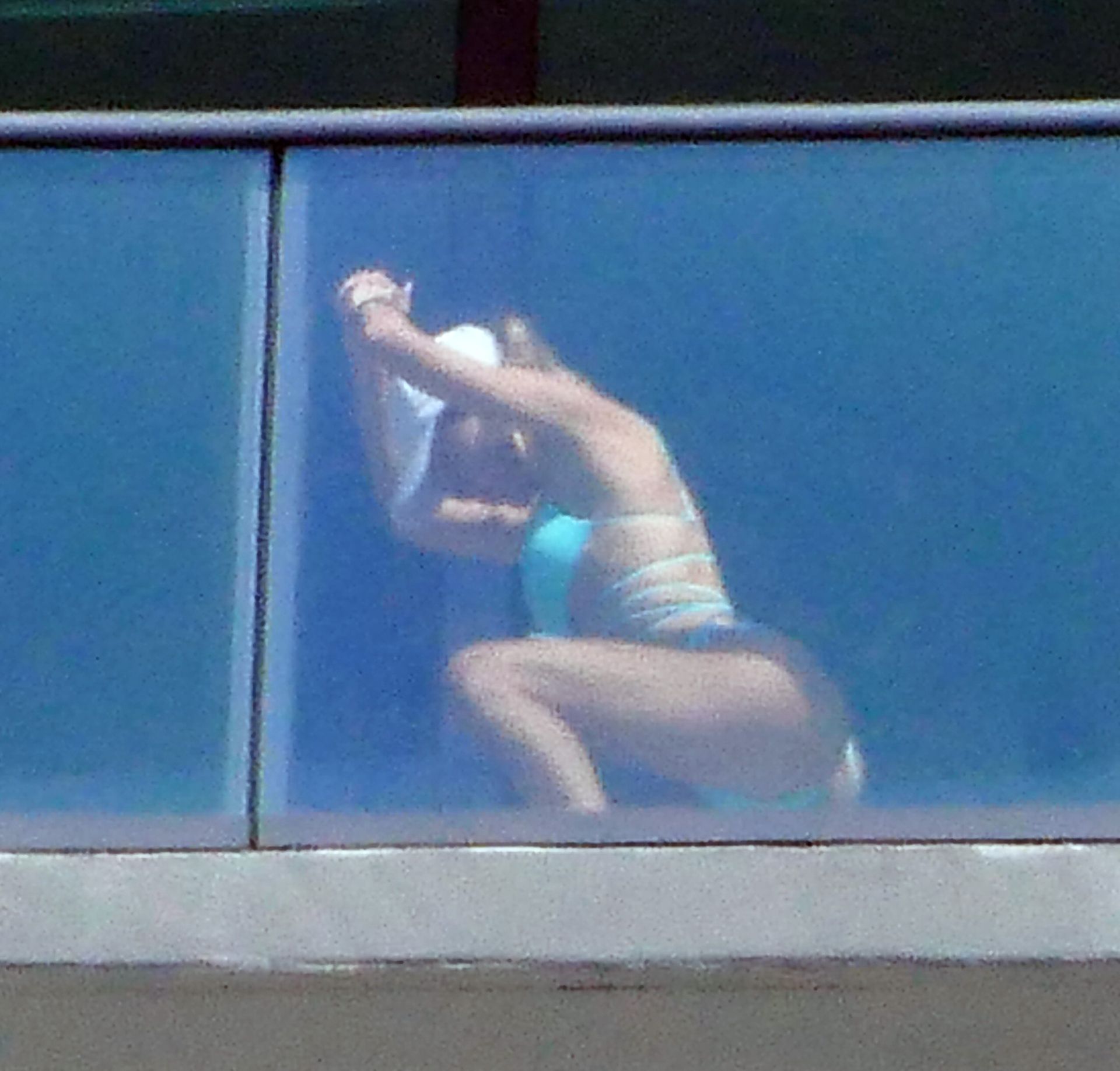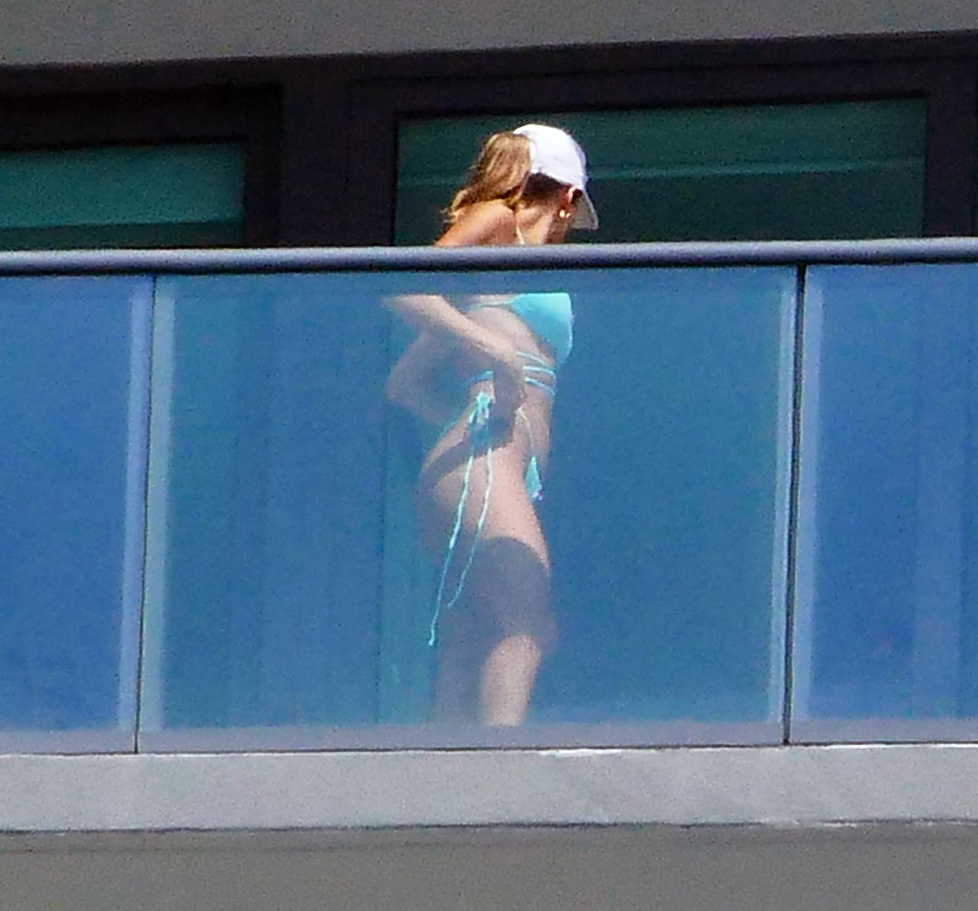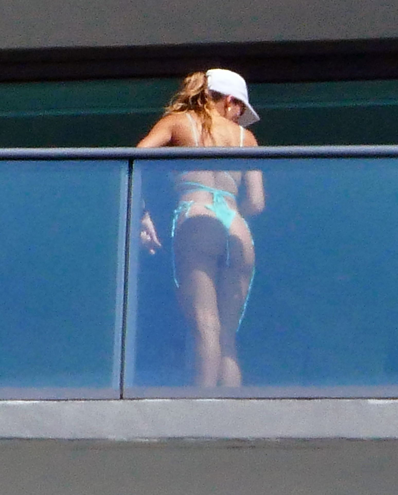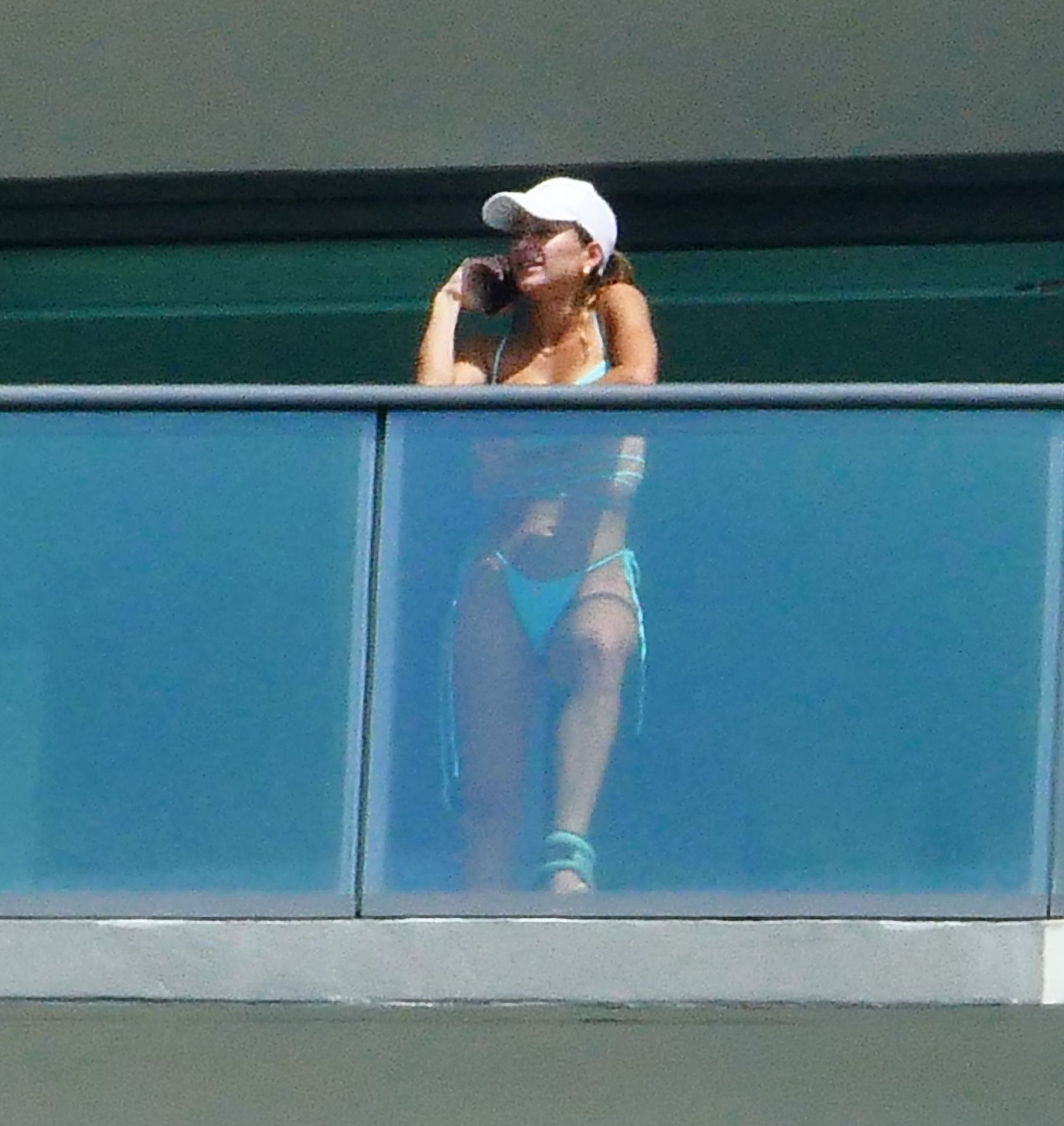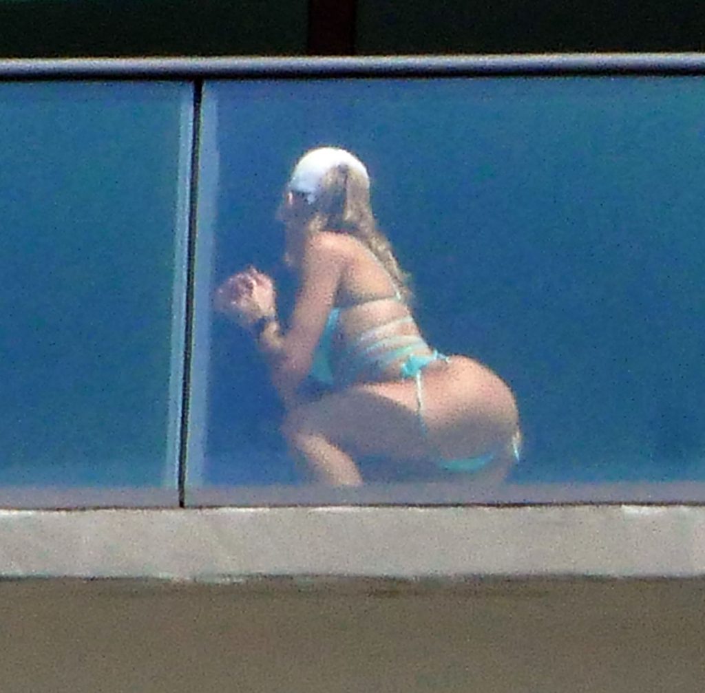 La modelo cubano-británica Cindy Prado presume sus curvas mientras lleva un pequeño bikini azul y hace ejercicio en un balcón durante el día mientras la pandemia del Coronavirus continúa en Miami, 15/04/2020.