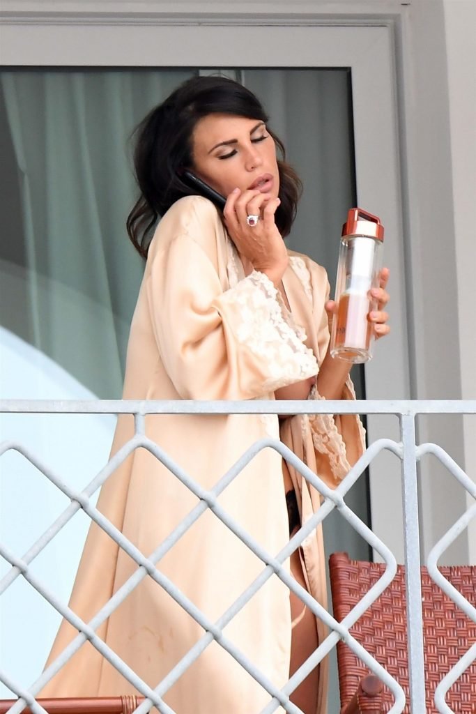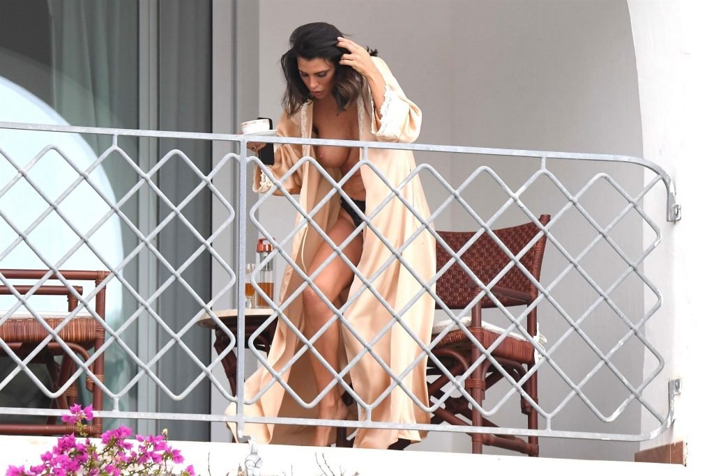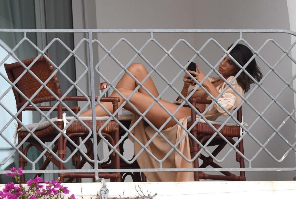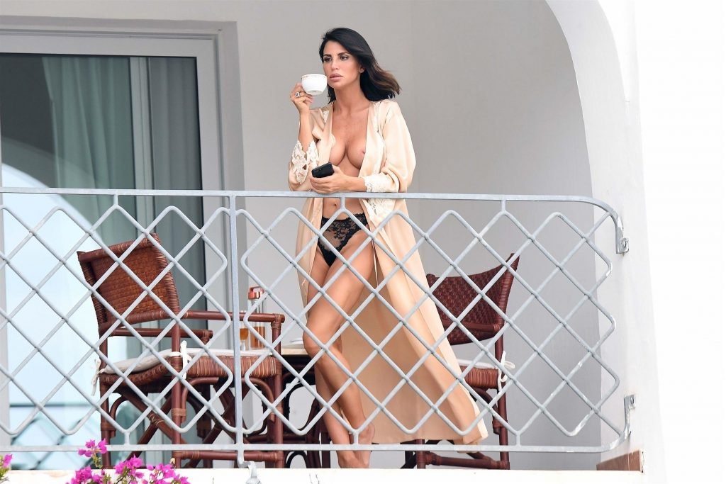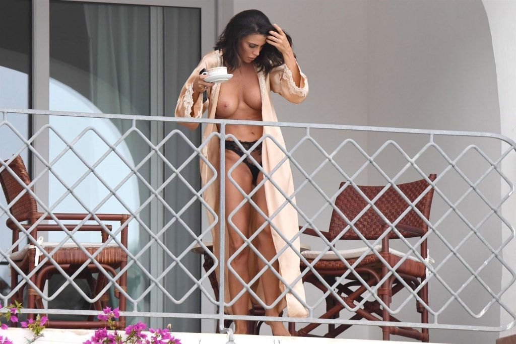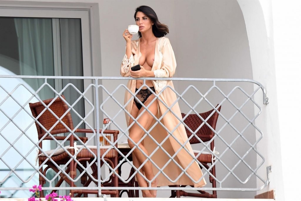 Modelo paraguaya, showgirl y actriz Claudia Galanti muestra su figura topless desde el balcón de un hotel en Porto Cervo, Cerdeña, Italia, 19/07/2017.