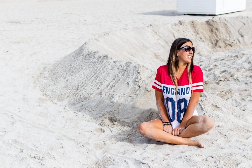 Modelo, estrella de reality TV, árbitra, reina del tanga Claudia Romani apoya a Inglaterra una vez más antes de su partido de cuartos de final – South Beach, 07/06/2018. Ella llevaba una camiseta de Inglaterra y un tanga rojo muy pequeño.