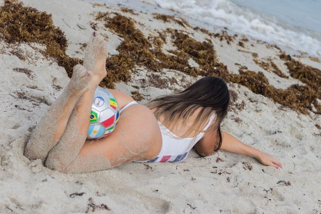 Modelo italiana de trajes de baño, árbitra y estrella de la televisión reality Claudia Romani quiere que sepamos que está apoyando a Inglaterra en la Copa Mundial 2018, 21/06/2018. Estaba en South Beach con un nuevo y sexy traje de baño de una pieza.