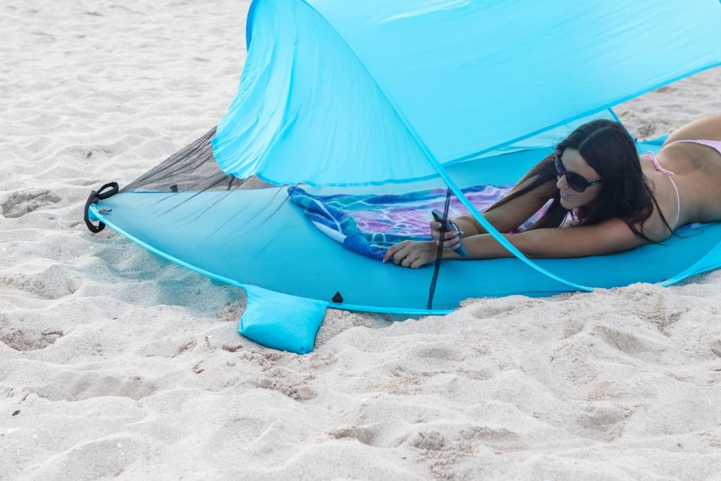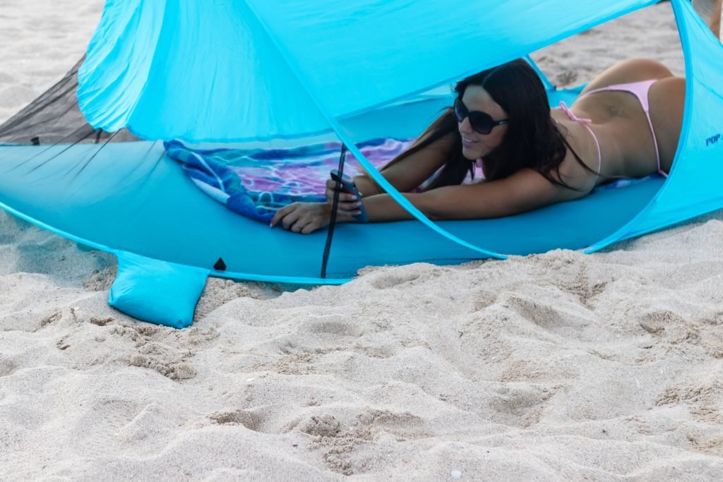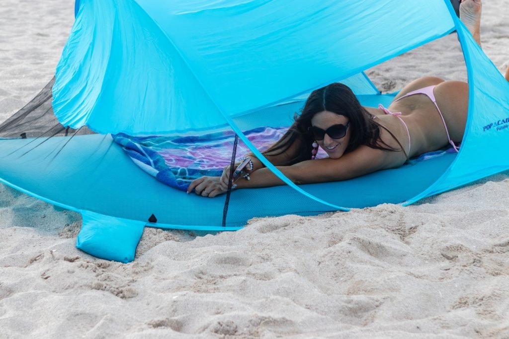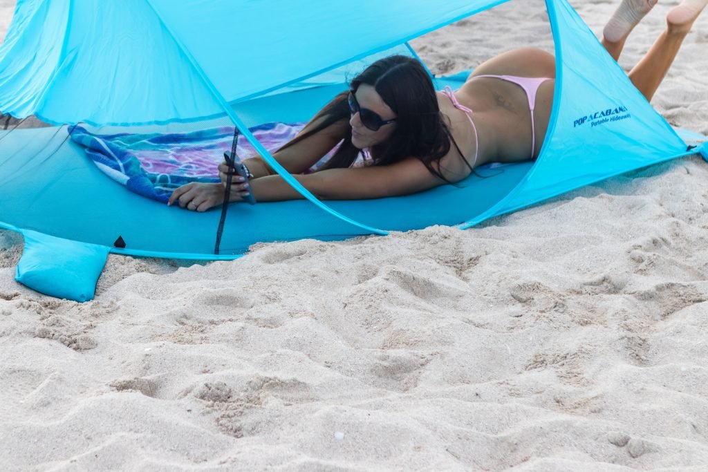 Personalidad italiana de la televisión reality, modelo, fanática de las gafas de sol en su habitual lugar en South Beach tomando el sol y divirtiéndose, 11/05/2018. Estaba tomando selfies y relajándose en una pequeña cabaña portátil. Llevaba un bikini micro tanga brillante, haciendo feliz a todos con sus curvas.