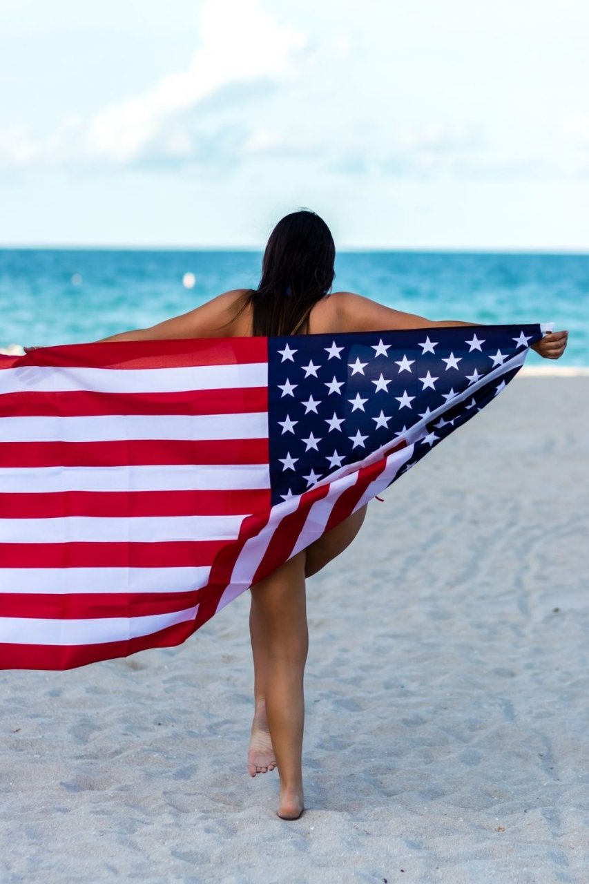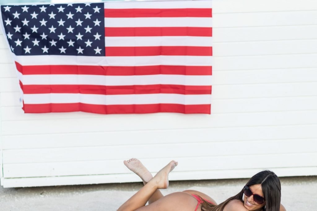 La modelo y estrella de reality show recién nacionalizada estadounidense Claudia Romani celebra convertirse en ciudadana americana vistiendo un bikini tanga rojo y azul frente a una bandera estadounidense, 02/04/2019. Compartió su alegría por obtener la ciudadanía en las redes sociales. Claudia posó sonriente en South Beach con la bandera mientras mostraba a todos sus atributos.