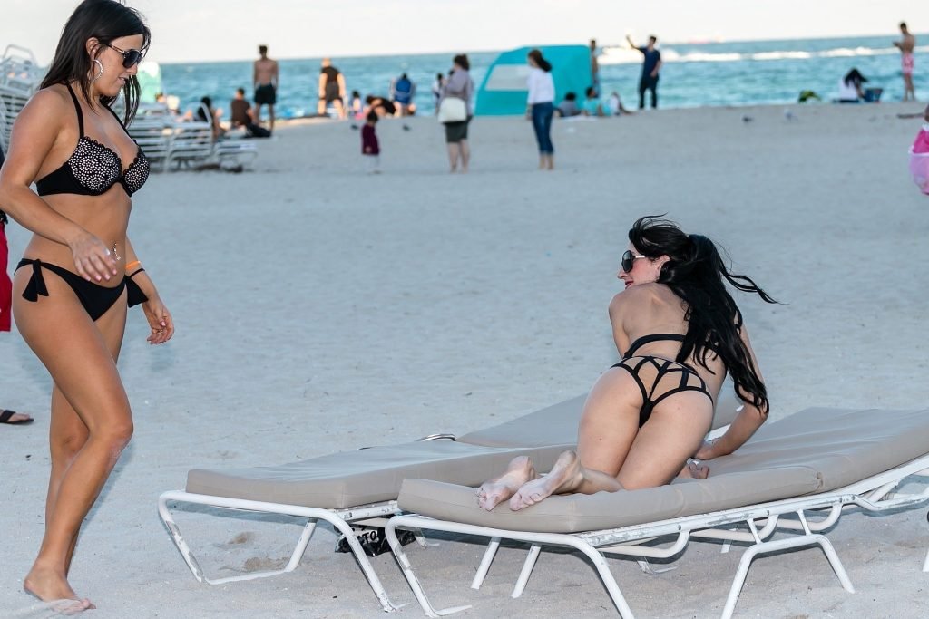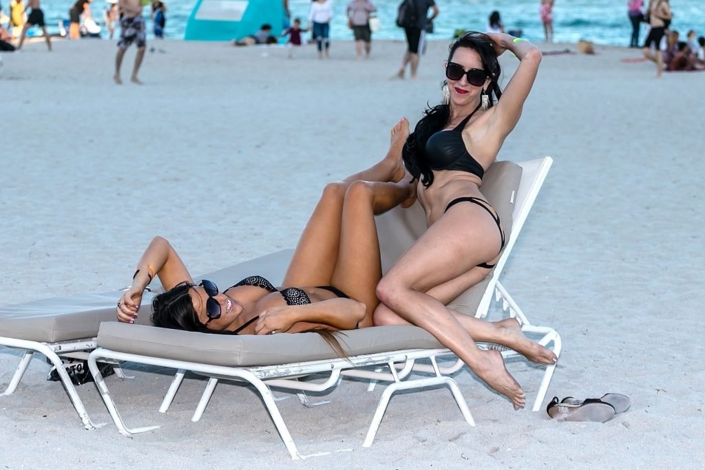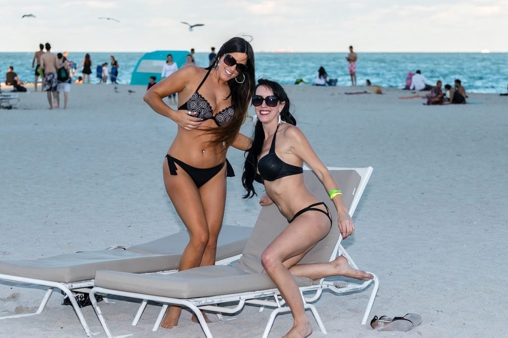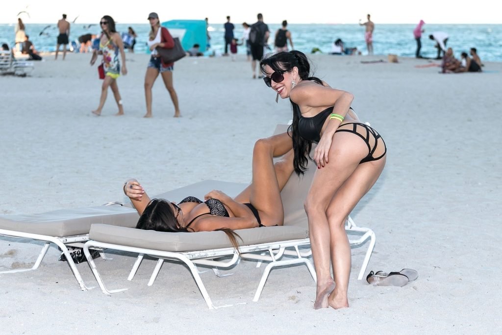 La estrella italiana de la televisión reality Claudia Romani y la sobreviviente/defensora del cáncer de mama Bella Bond, todas sonrisas y posando para selfies y para los asistentes de la playa. El par atractivo lució pequeños bikinis negros mientras disfrutaban de un día en la playa en Miami, 14/01/2018.