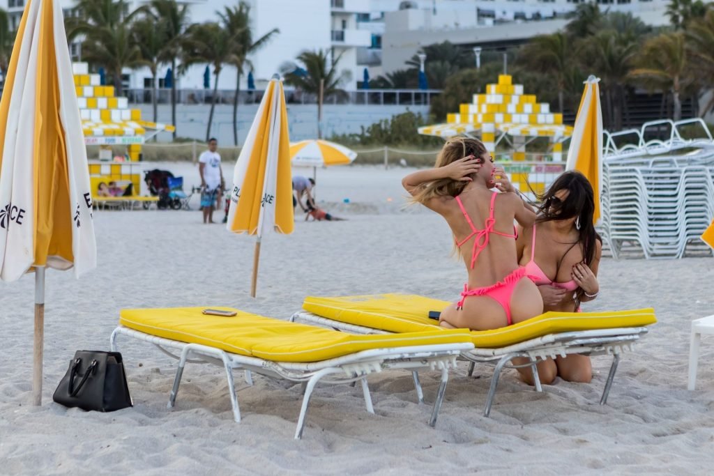 La modelo italiana y estrella de reality TV Claudia Romani junto con la sensación argentina de Instagram Cloe Greco fueron vistas posando para fotos con bikinis tanga rosas a juego en South Beach, 19/02/2019. Ambas mostraban sus curvas tratando de ganar aún más seguidores.