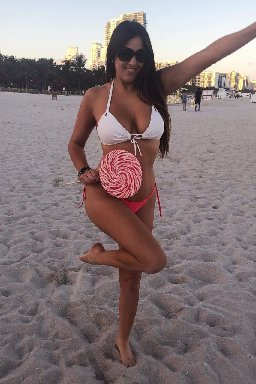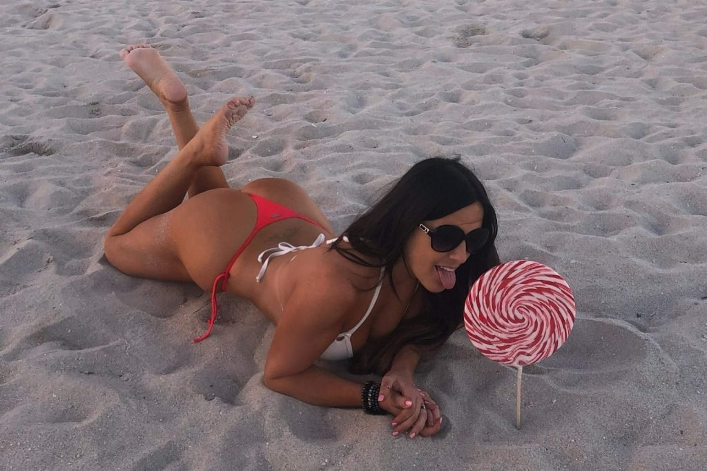 Claudia Romani muestra sus famosas curvas con un diminuto bikini blanco y rojo durante una sesión de fotos en la playa de Miami Beach, 01/08/2019.
