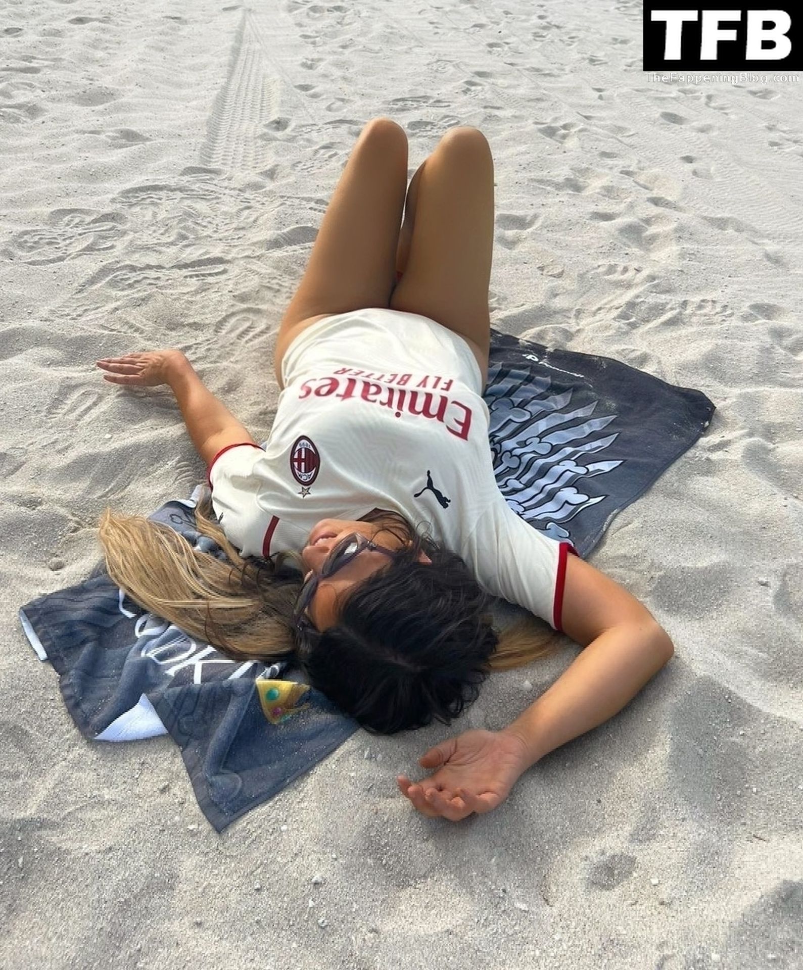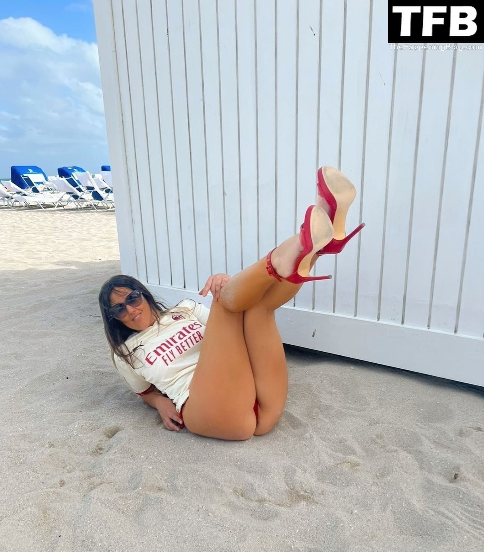 Claudia llevaba un sexy bikini rojo combinado con la camiseta de Fondazione Milan y tacones altos sobre la arena.