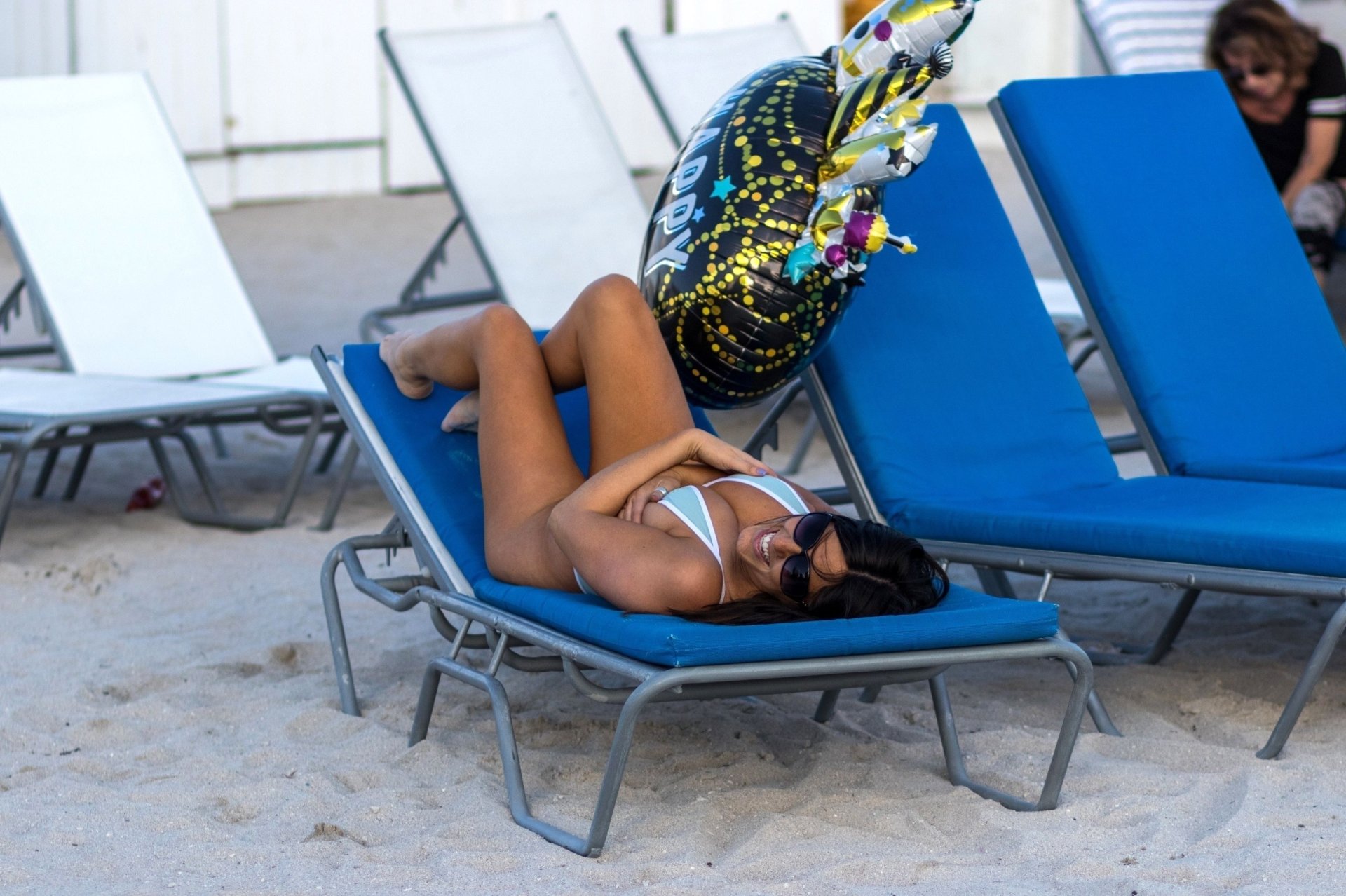 Model y estrella de telerrealidad Claudia Romani, 35, recibe el Año Nuevo con una sesión de fotos en South Beach, 31/12/2017. Claudia muestra sus atributos mientras posa con un traje de baño azul de una pieza y su globo de Nochevieja.