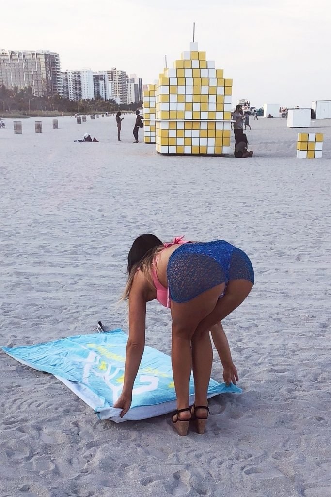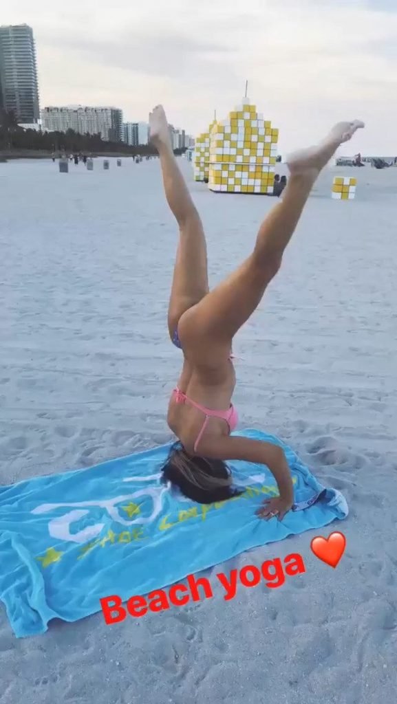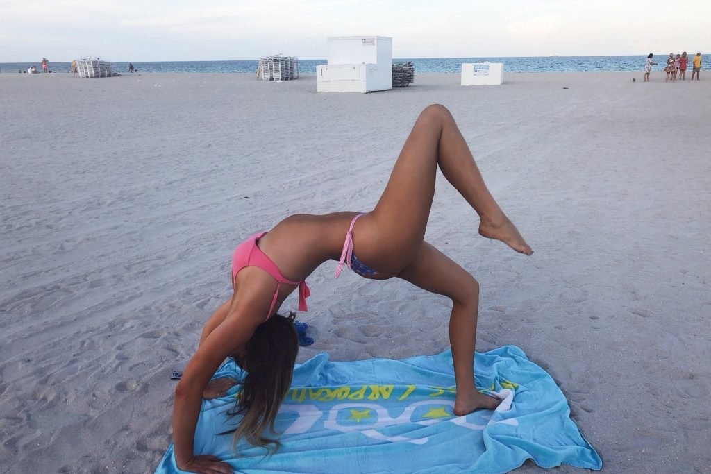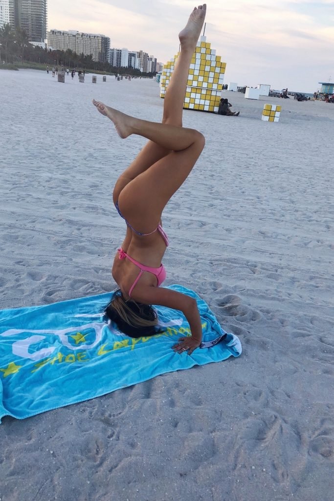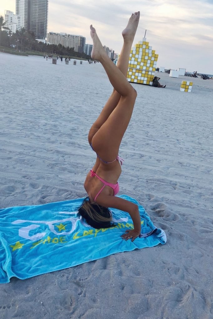 La modelo italiana y celebridad de la televisión reality Claudia Romani fue vista relajándose en South Beach después de la Swim Week, 16/06/2018. La modelo toma el sol topless y practica algunas poses de yoga muy sexys mostrando su flexibilidad. La local de Miami Beach llevaba un bikini diminuto rosa y azul y estaba súper bronceada.
