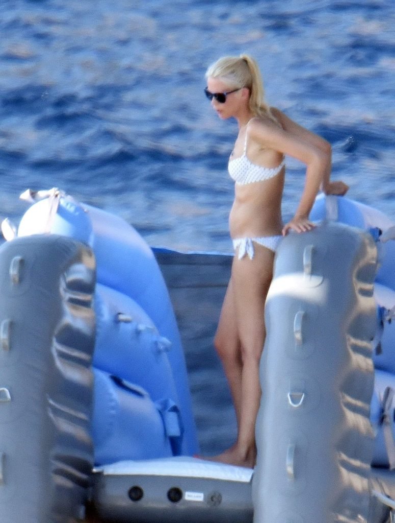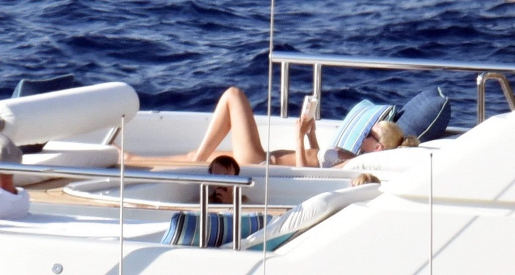La supermodelo alemana Claudia Schiffer, de 47 años, muestra su cuerpo tonificado en bikini mientras se relaja a bordo de un yate, 24/08/2017.