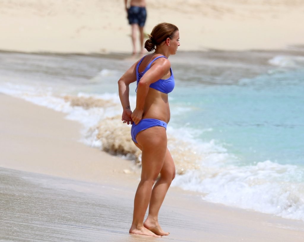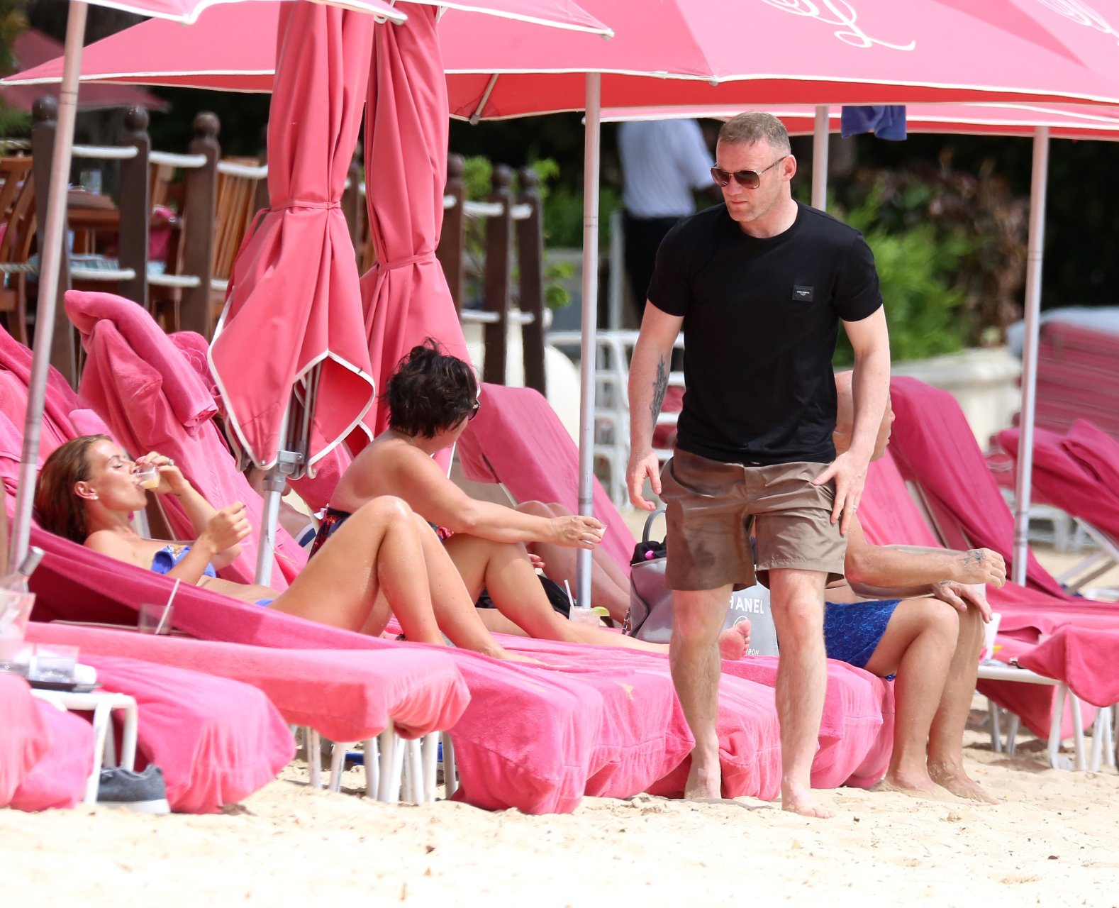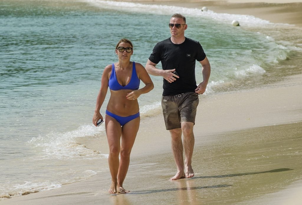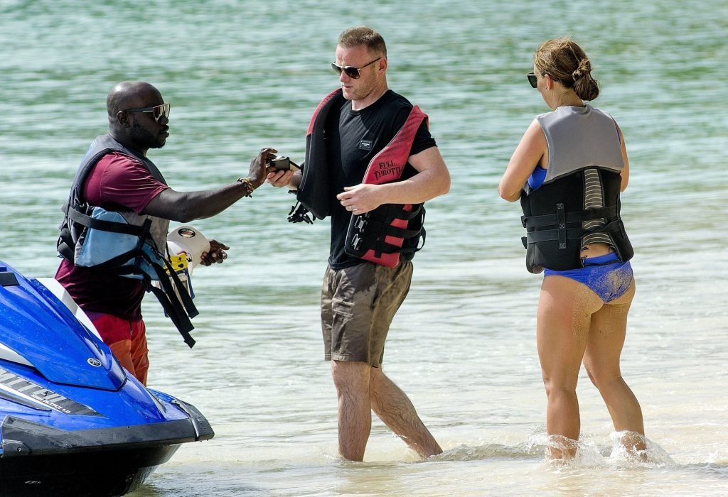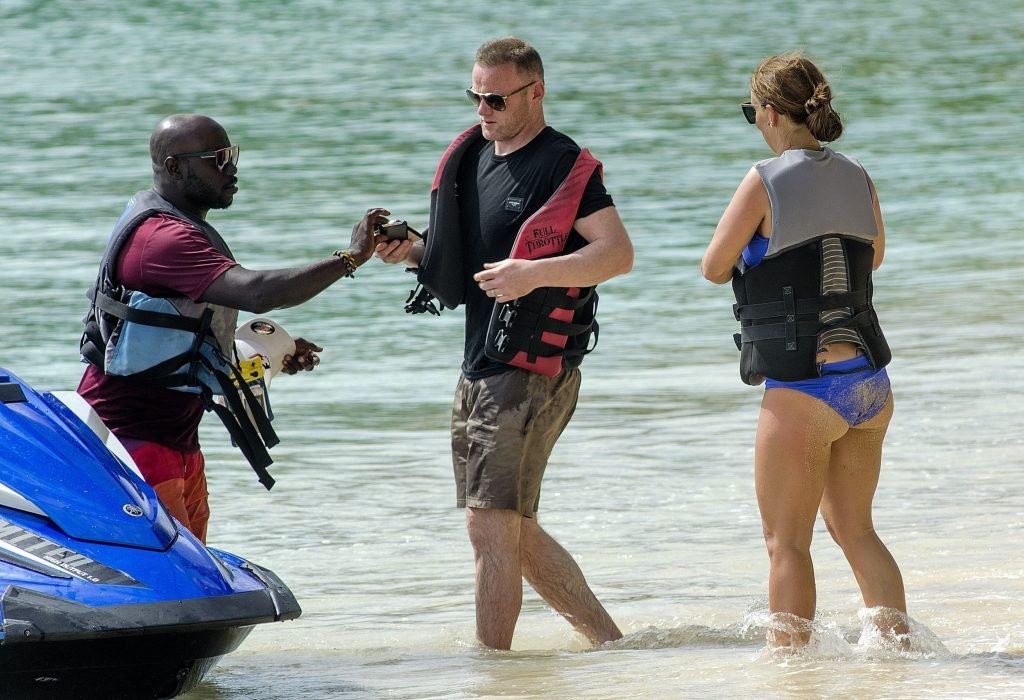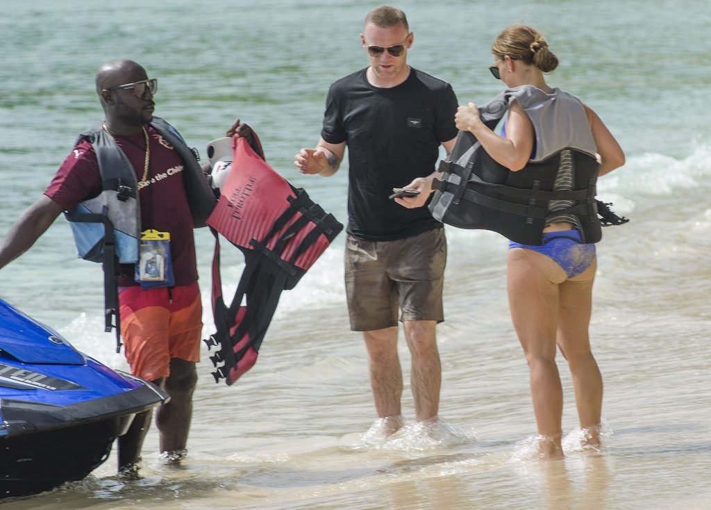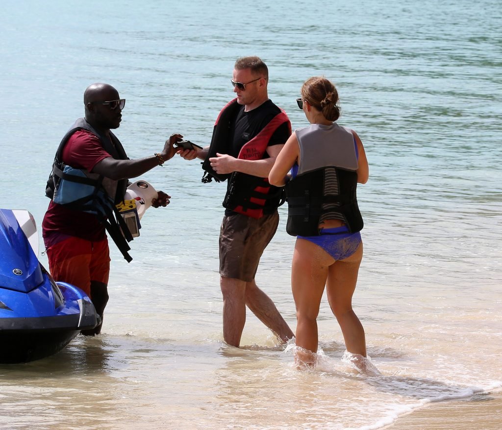 El futbolista británico Wayne Rooney y su esposa, la presentadora de televisión y periodista Coleen Rooney, de 32 años, disfrutan juntos de un paseo en moto acuática en otro día de playa en Barbados, 22/05/2018. La familia ha estado de vacaciones en la isla caribeña, disfrutando del hermoso clima y las aguas cristalinas.