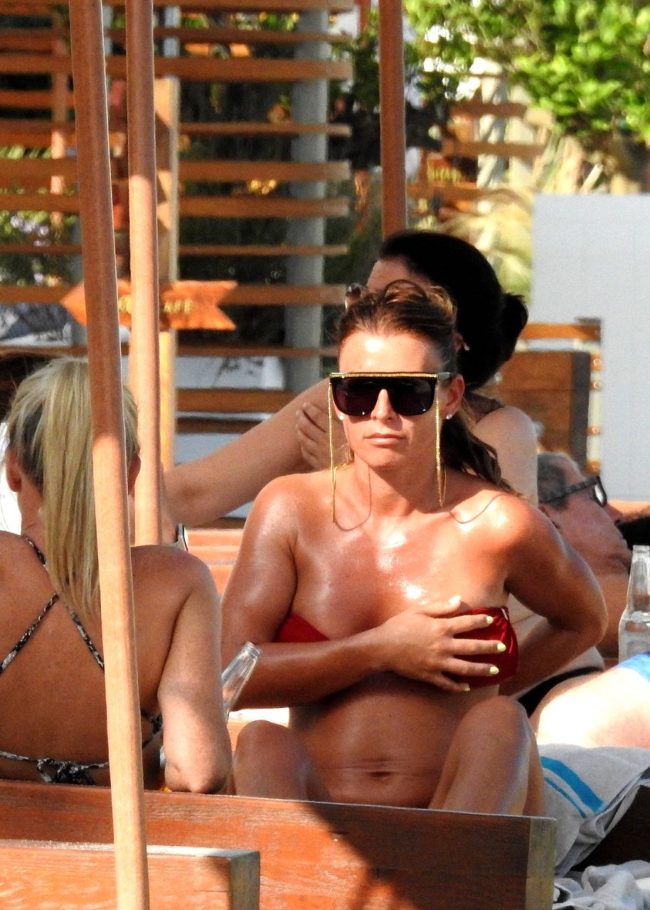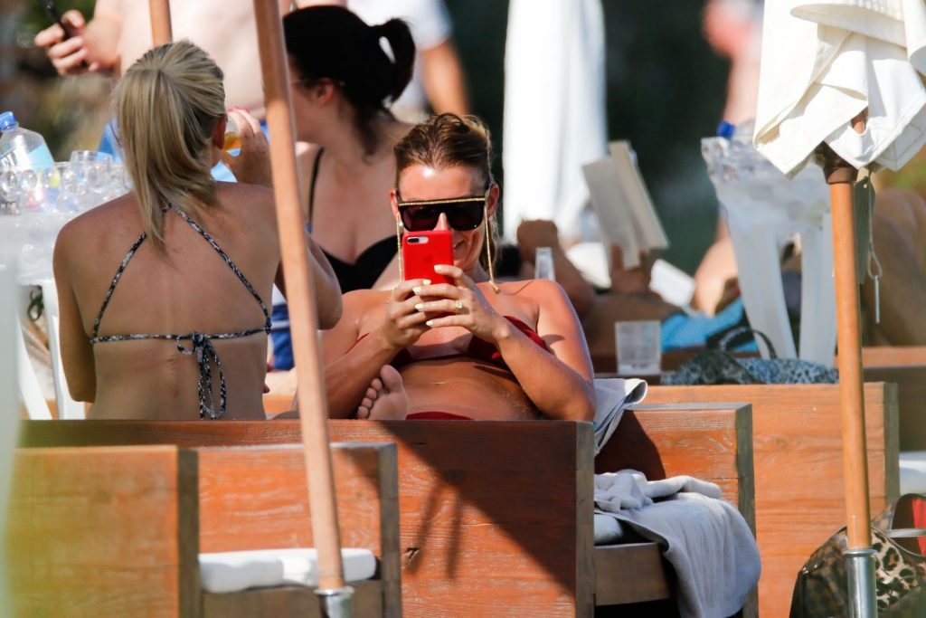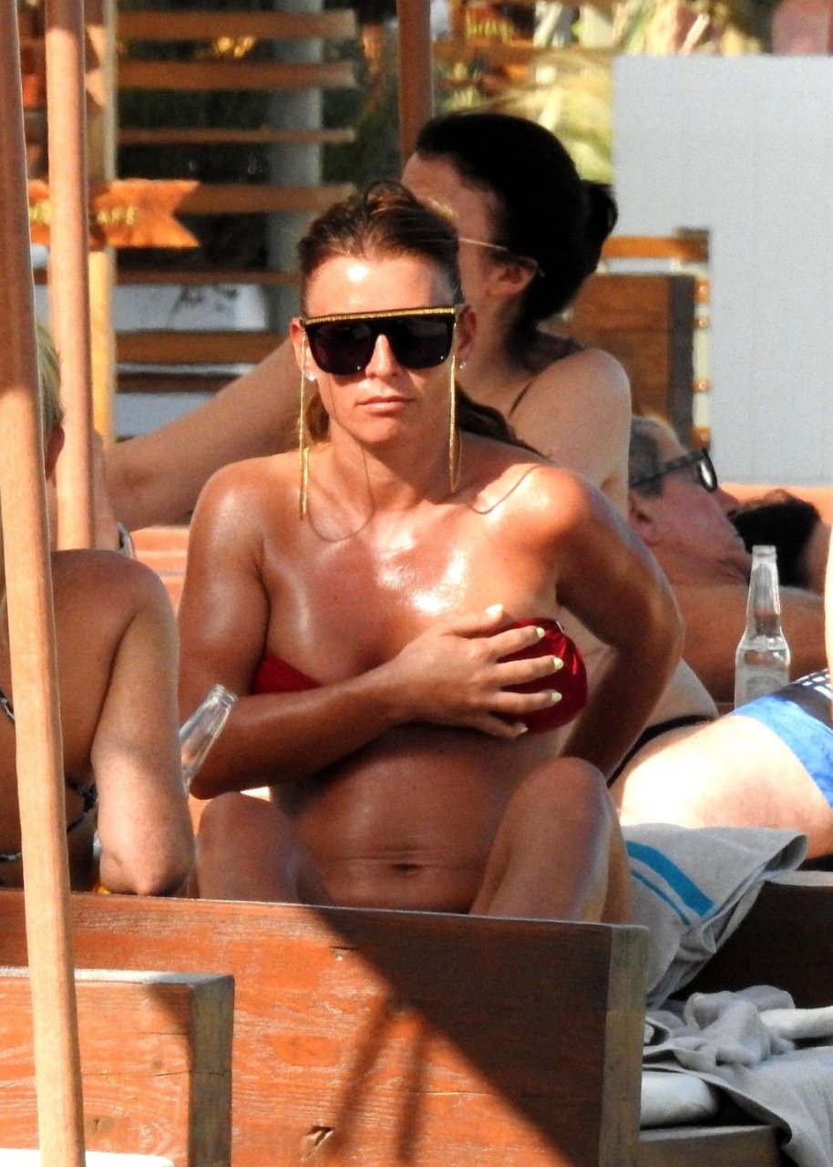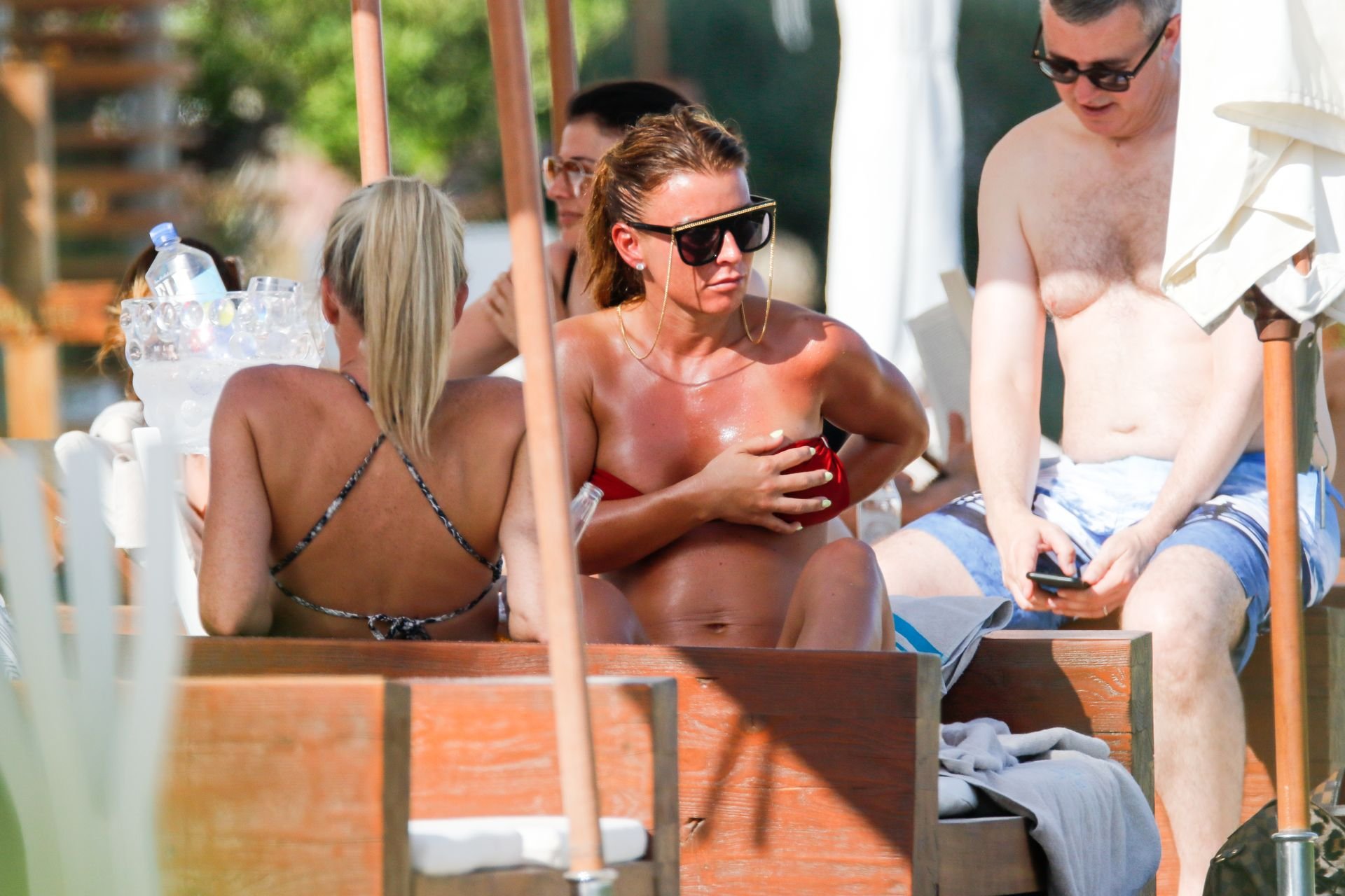 Coleen Rooney pasa tiempo en la playa de Ibiza con amigos, 07/11/2019. La WAG se veía fantástica con un conjunto rojo de dos piezas mientras descansaba al sol en la playa del Mediterráneo.