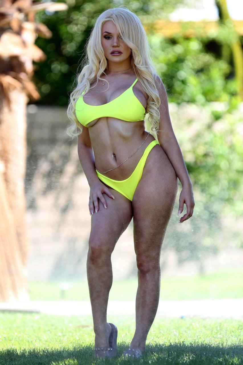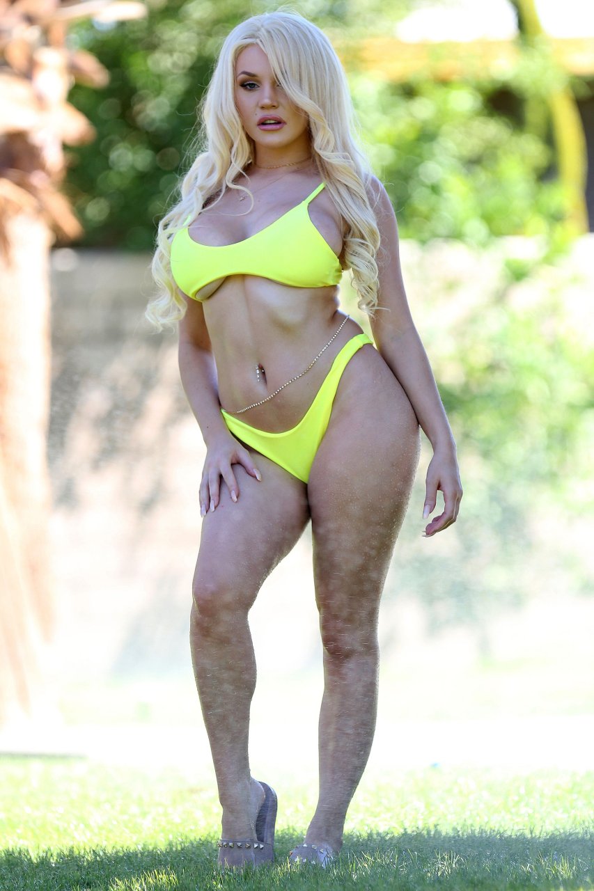 La rubia voluptuosa Courtney Stodden (24) toma el sol con un bikini amarillo que deja al descubierto la parte inferior del pecho mientras está en Palm Springs, 27/09/2018.
